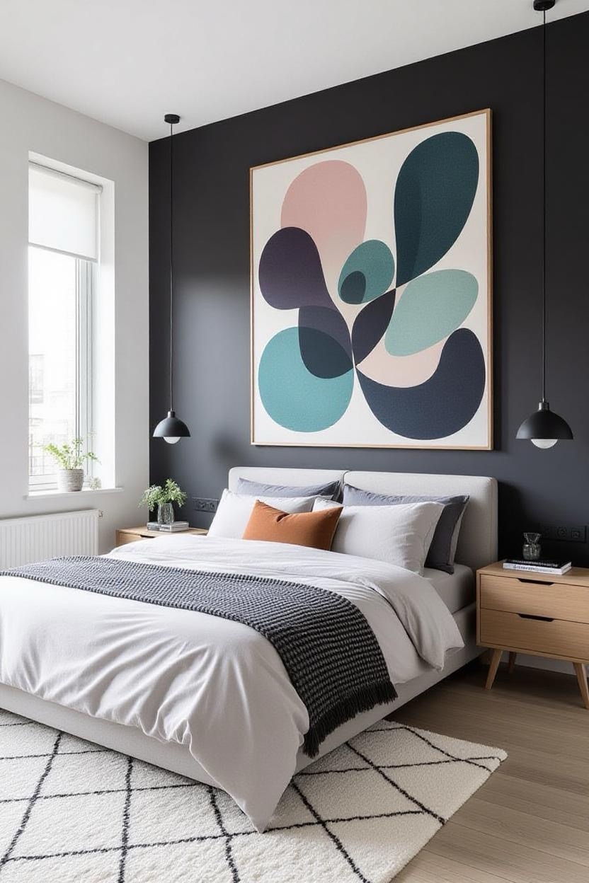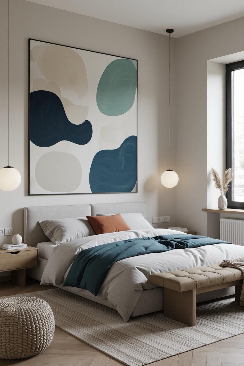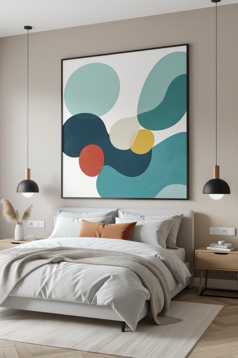 Use oversized wall art or abstract prints as the main feature. This approach adds personality while keeping the rest of the décor minimal.