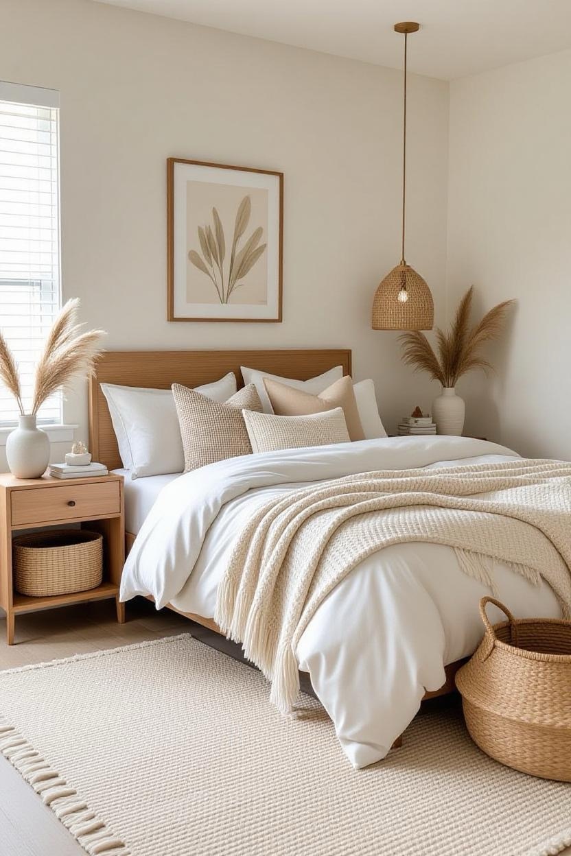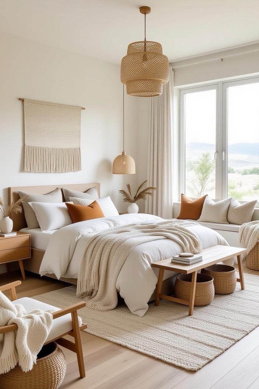 Layer minimalist furniture with textured throws, woven baskets, and soft neutral tones for a modern take on bohemian comfort.