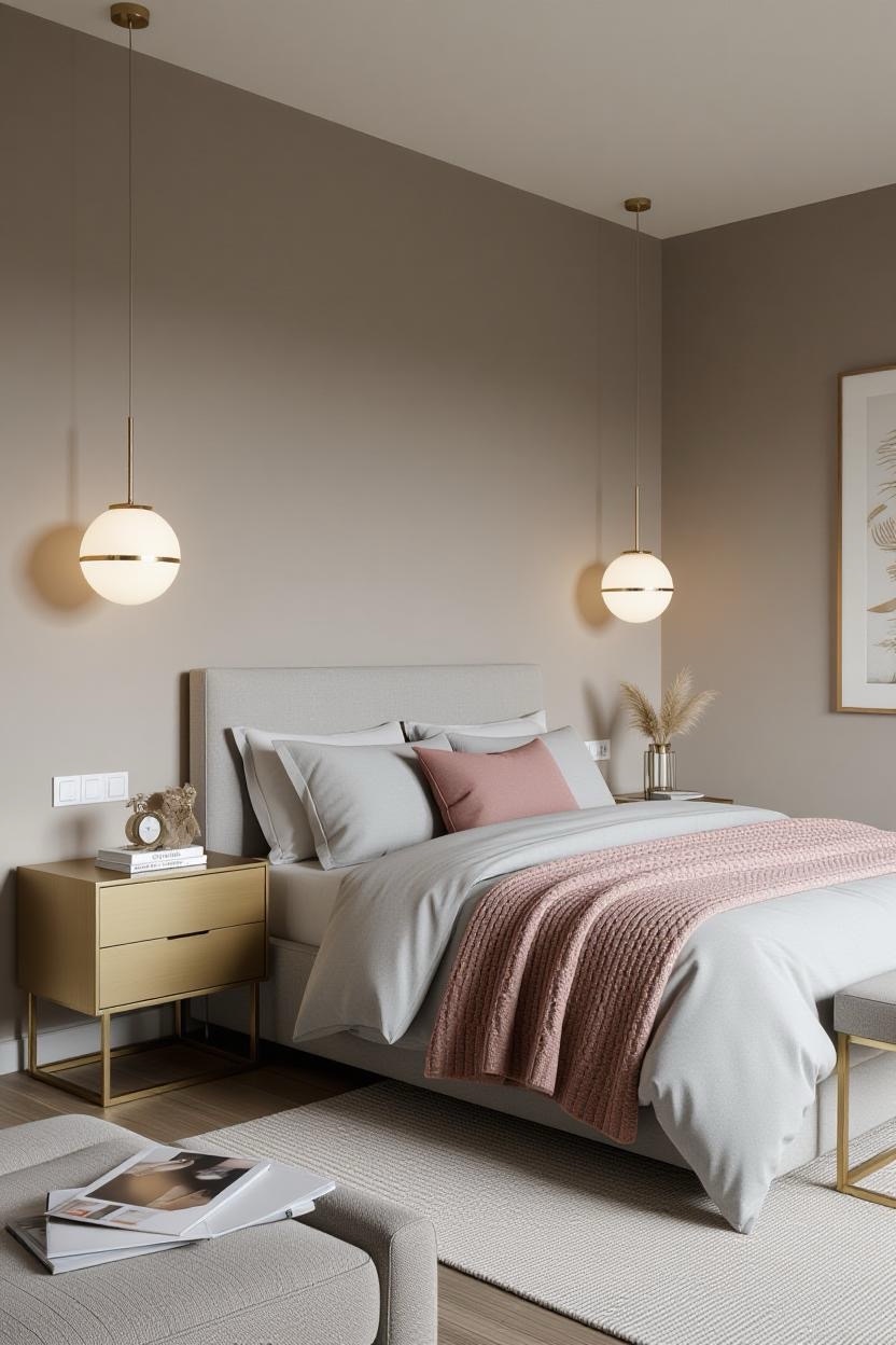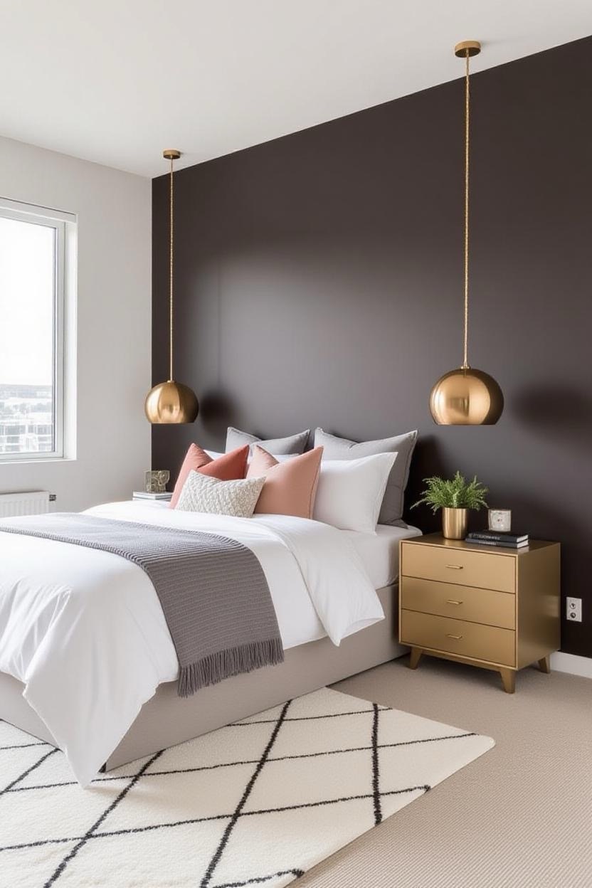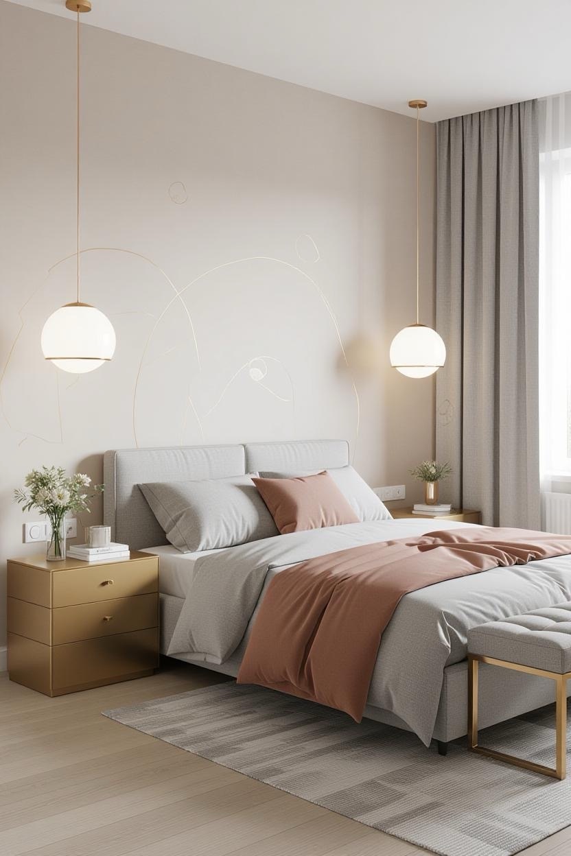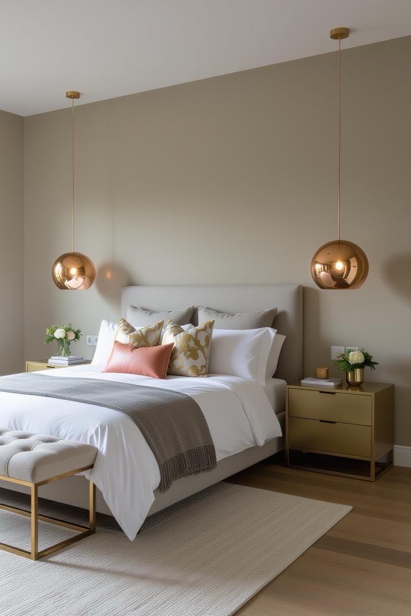 Touches of gold, silver, or copper add a touch of luxury. Metallic light fixtures or bedside tables enhance a modern bedroom with subtle glamour.