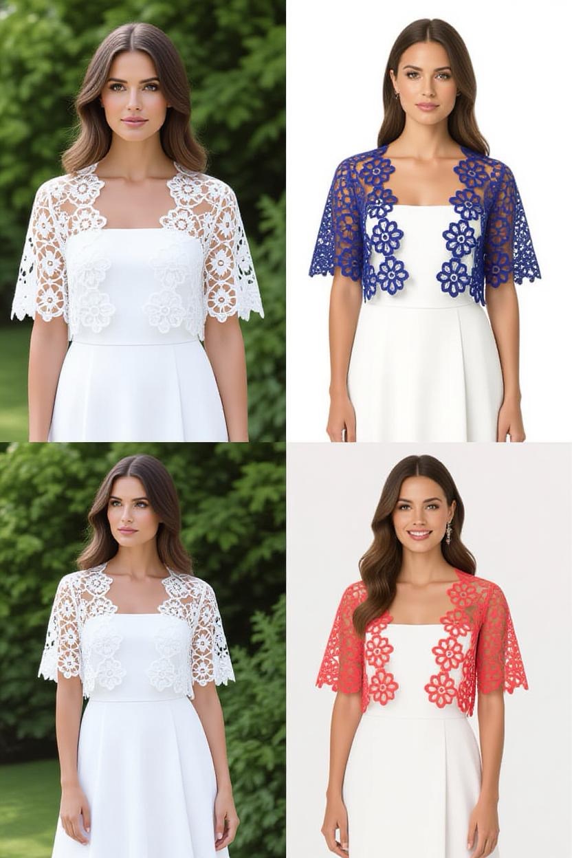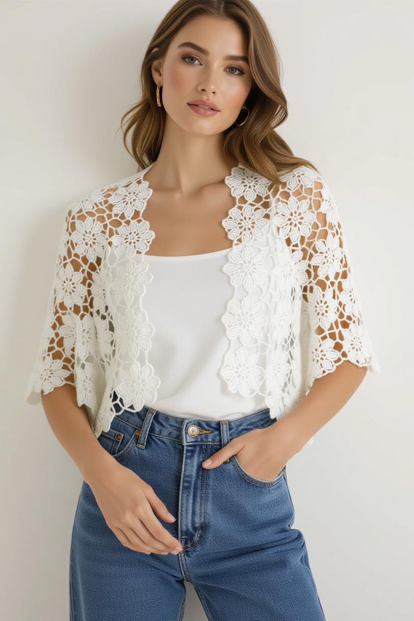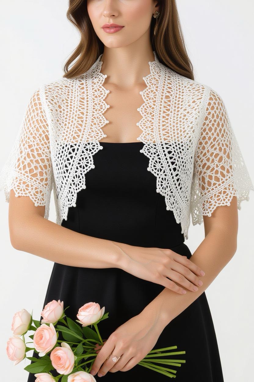 Crafted from joined floral motifs, this bolero is both charming and unique. The floral patterns give a delicate lace effect that’s perfect for spring and summer outfits. Try it in white for a bridal cover-up or in bold colors for a statement piece.