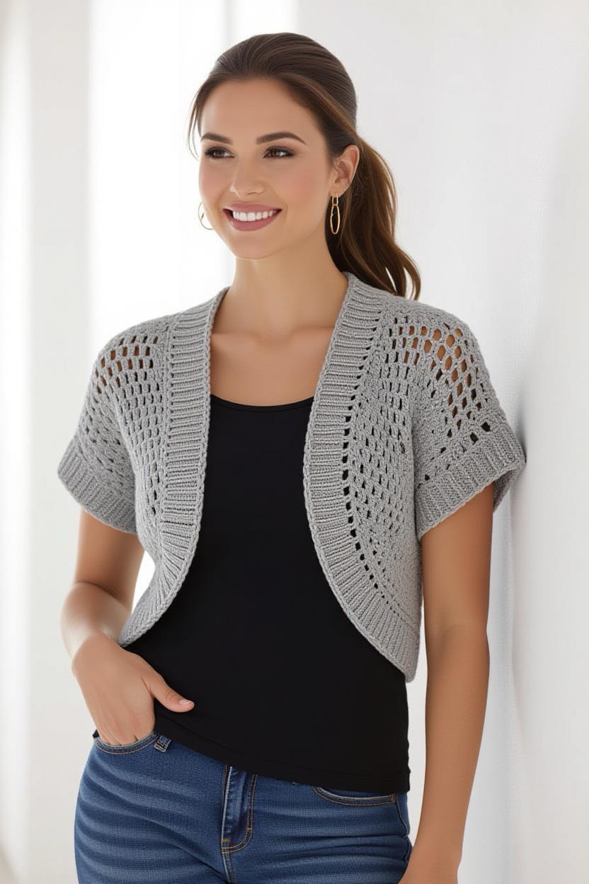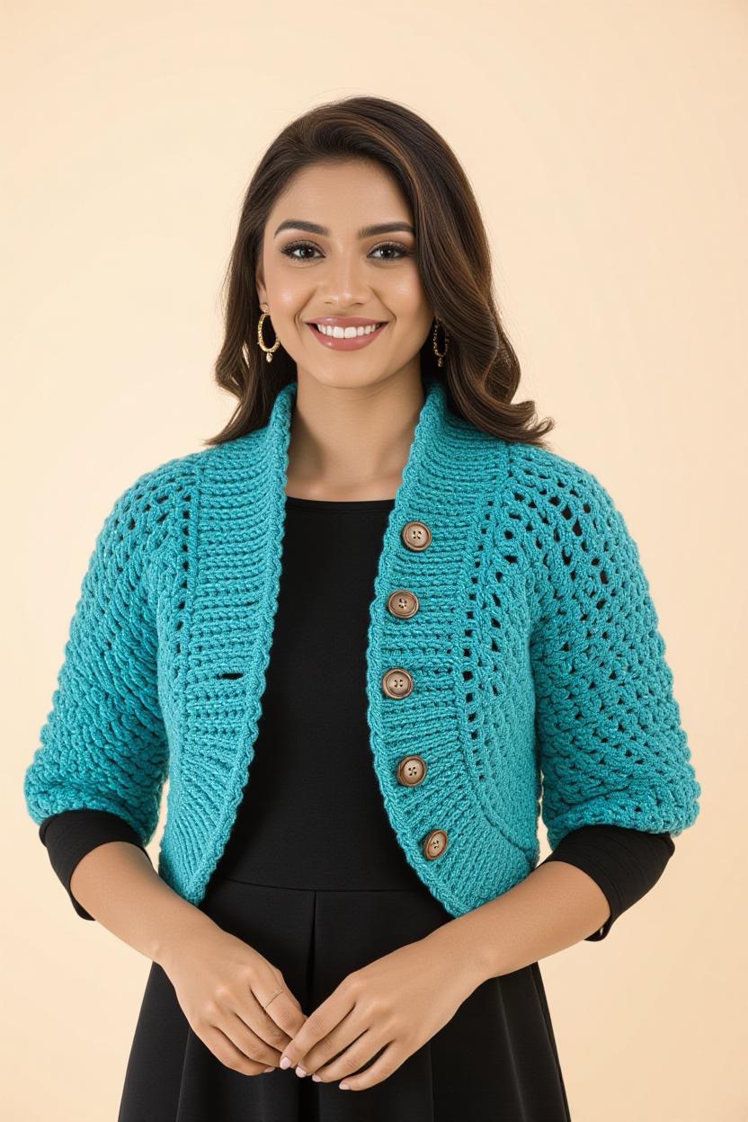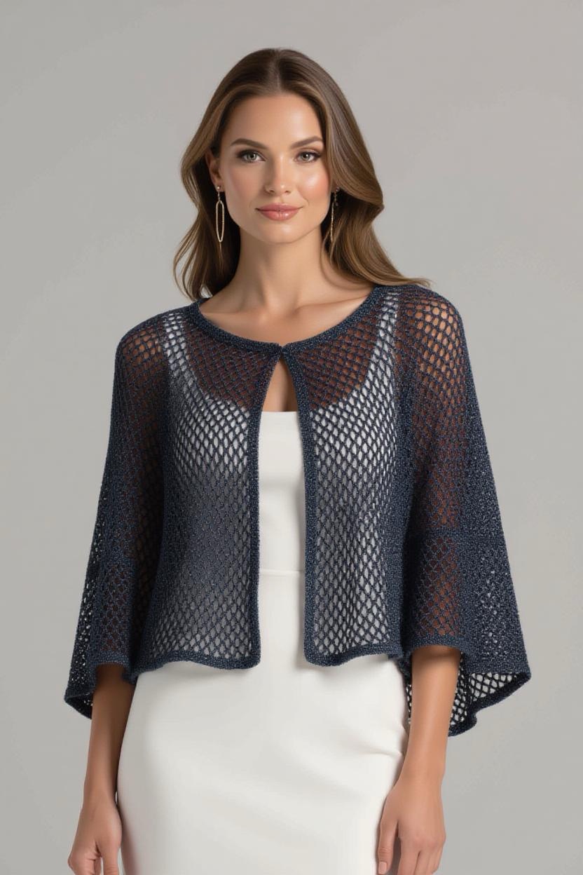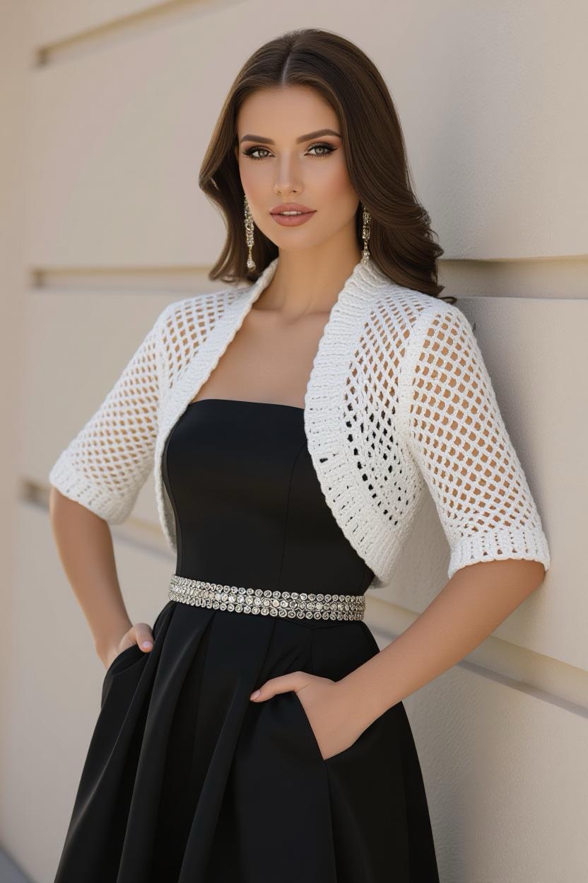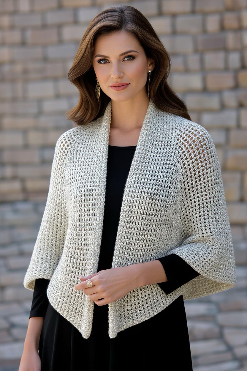 This bolero has a subtle cape-like drape that adds drama to your outfit. It’s especially great for evening wear, giving your look a polished finish without feeling too heavy. Metallic yarns can enhance its elegant appeal.