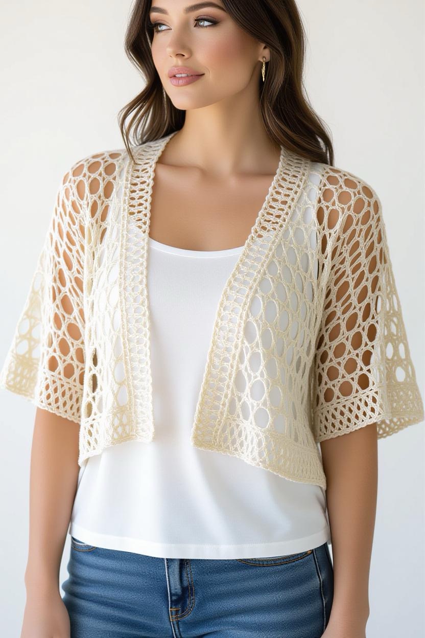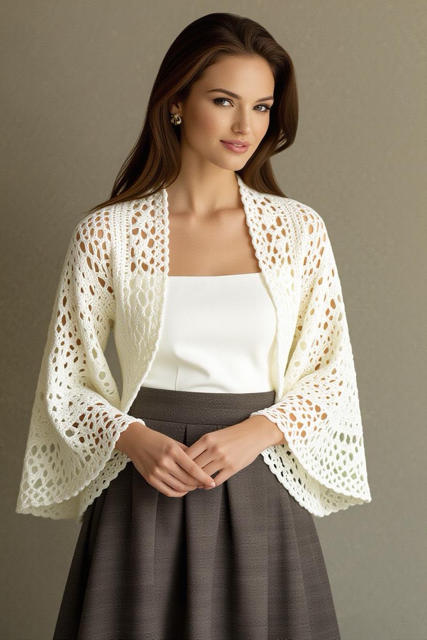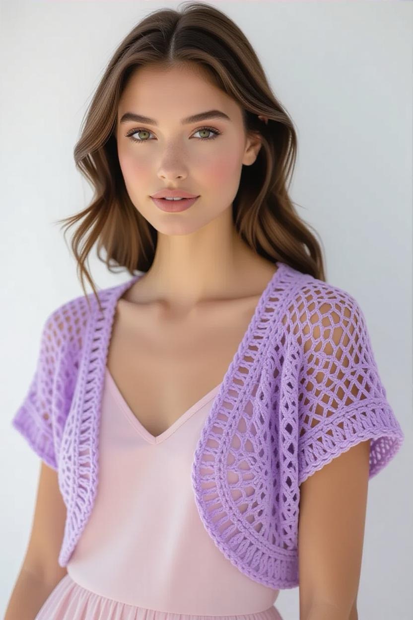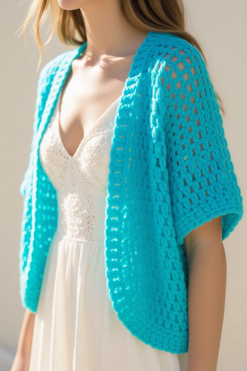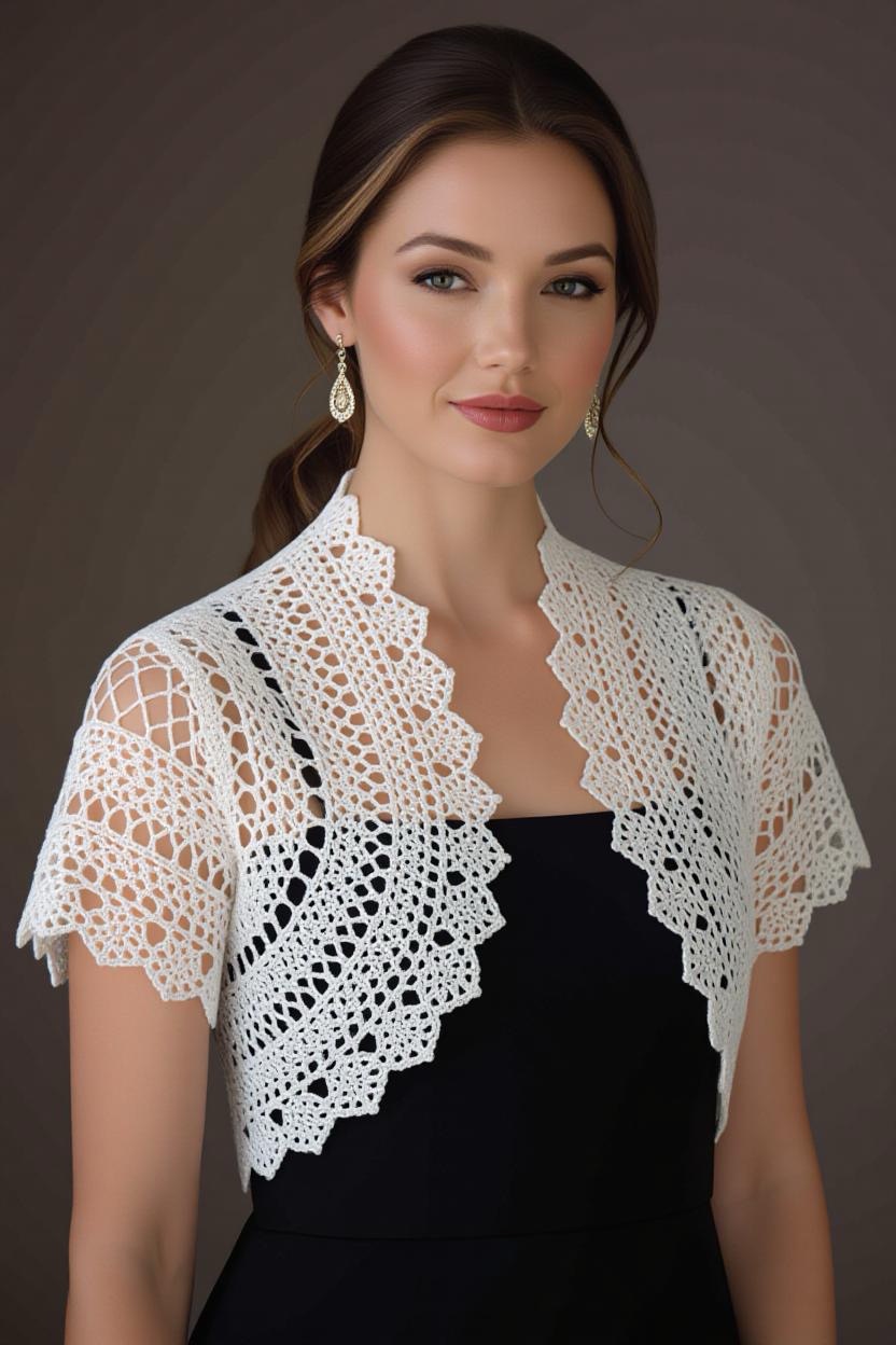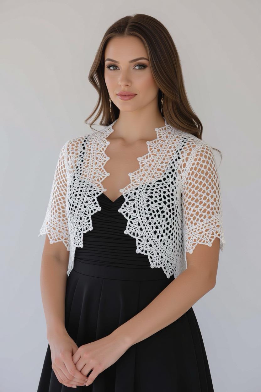 This bolero has a subtle cape-like drape that adds drama to your outfit. It’s especially great for evening wear, giving your look a polished finish without feeling too heavy. Metallic yarns can enhance its elegant appeal.