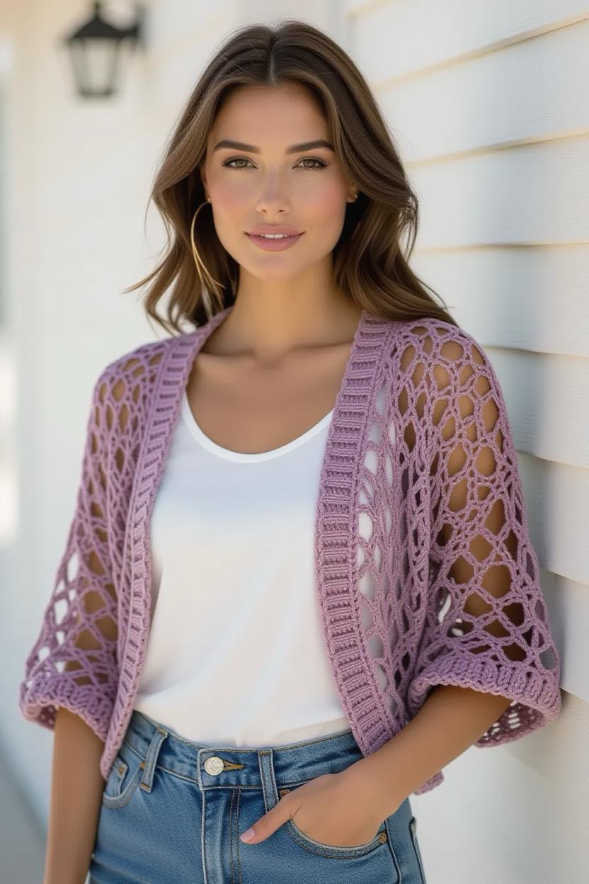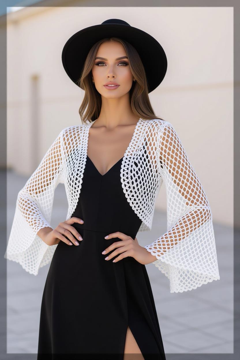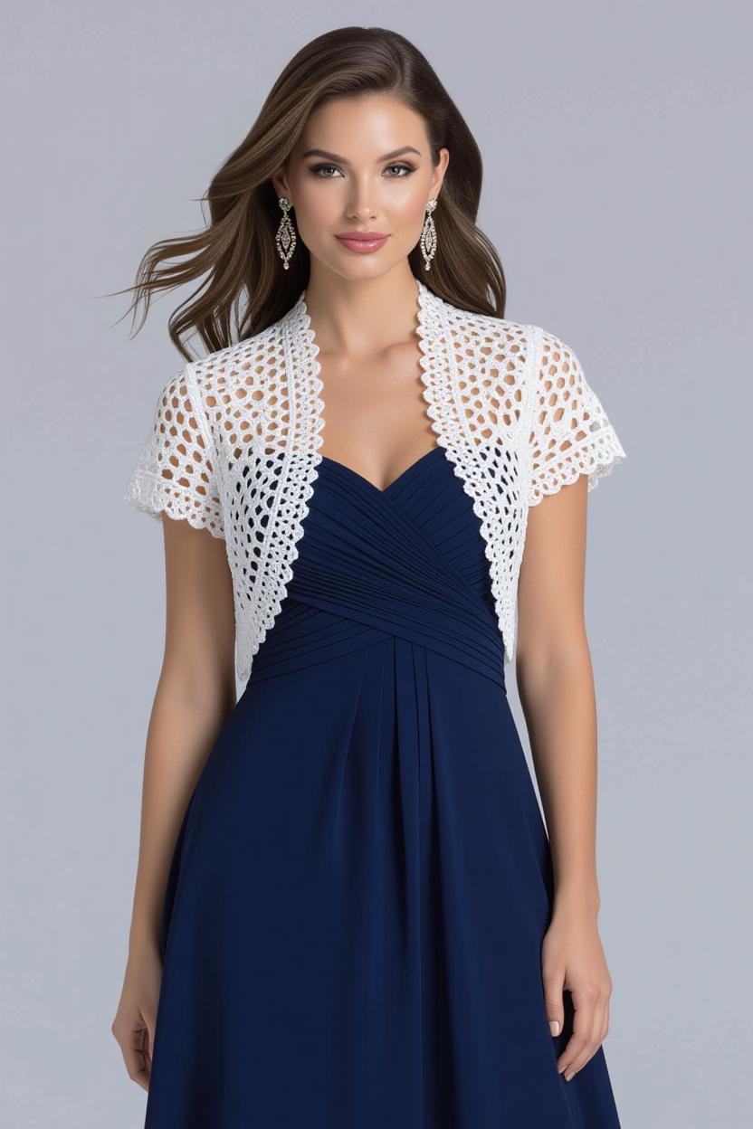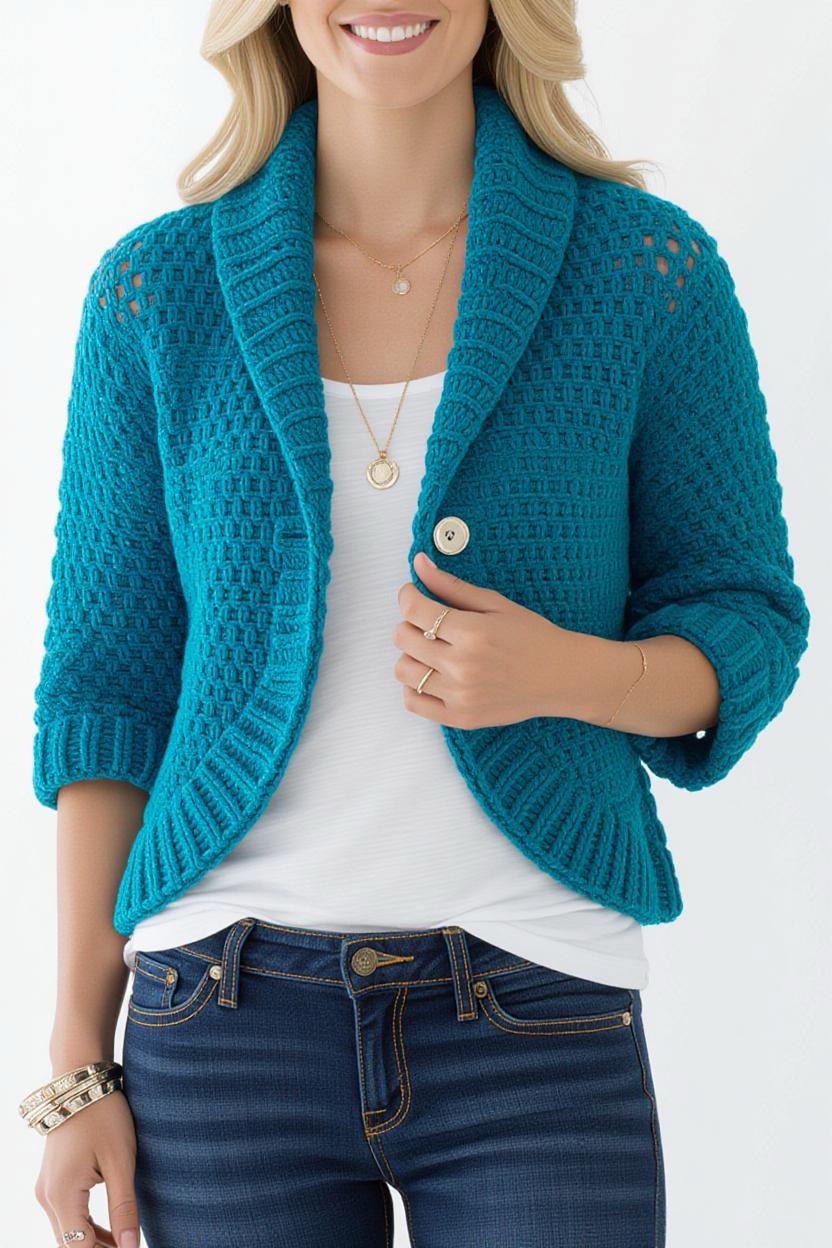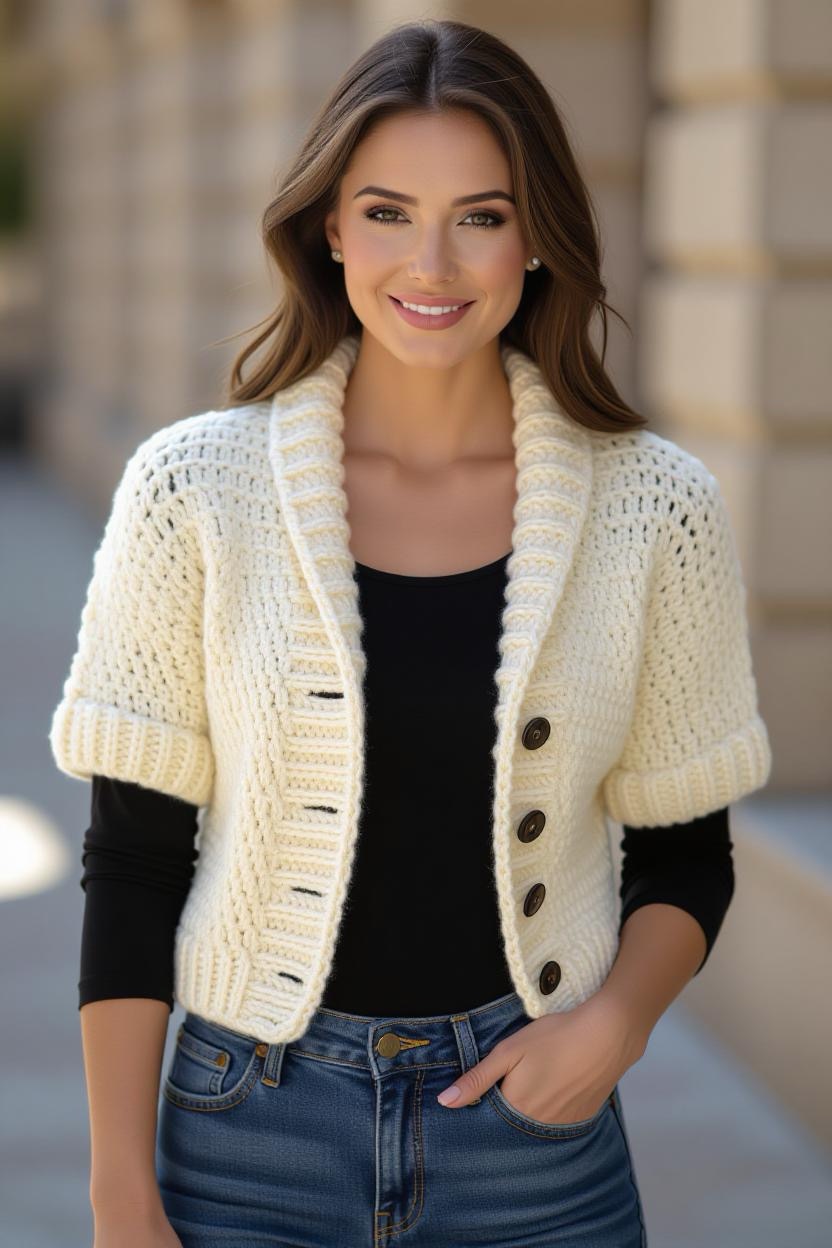 This bolero has a subtle cape-like drape that adds drama to your outfit. It’s especially great for evening wear, giving your look a polished finish without feeling too heavy. Metallic yarns can enhance its elegant appeal.