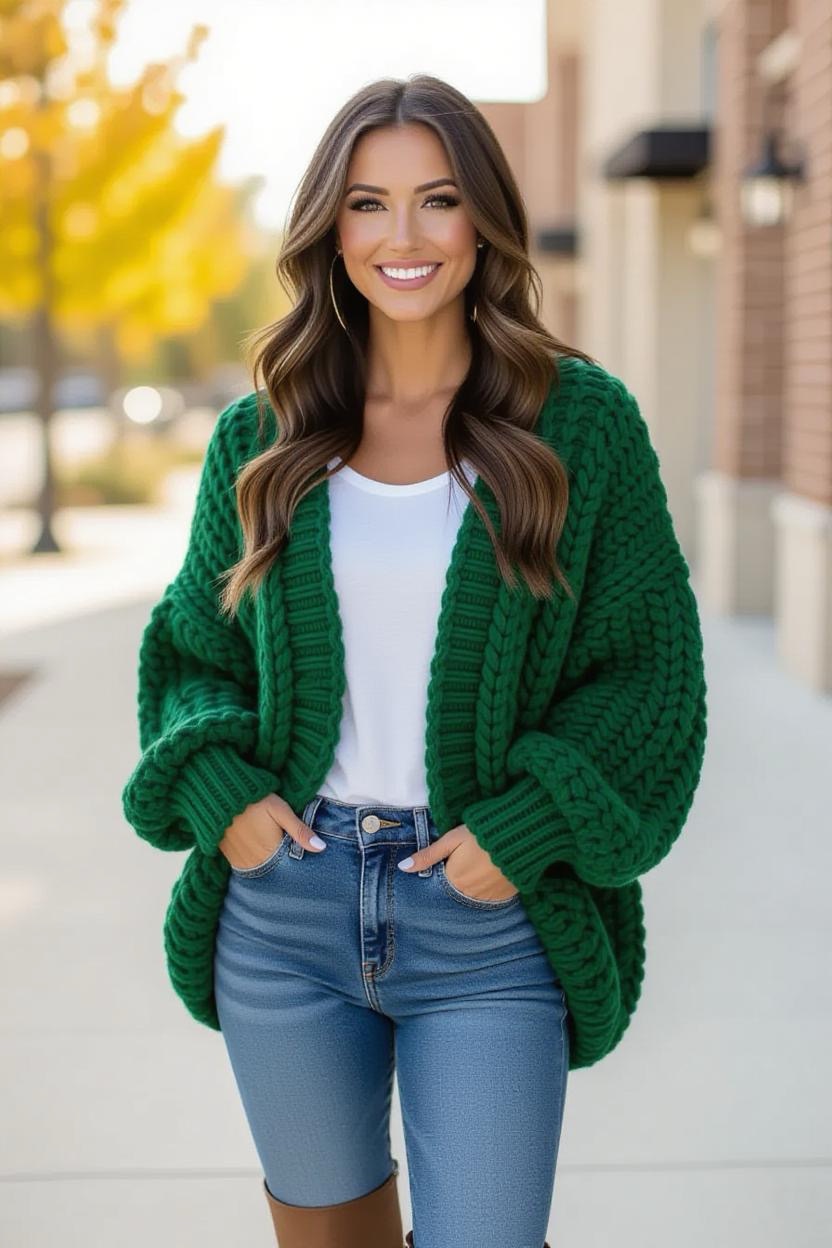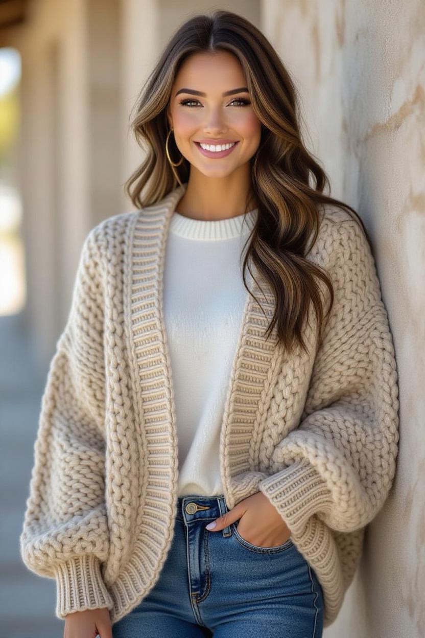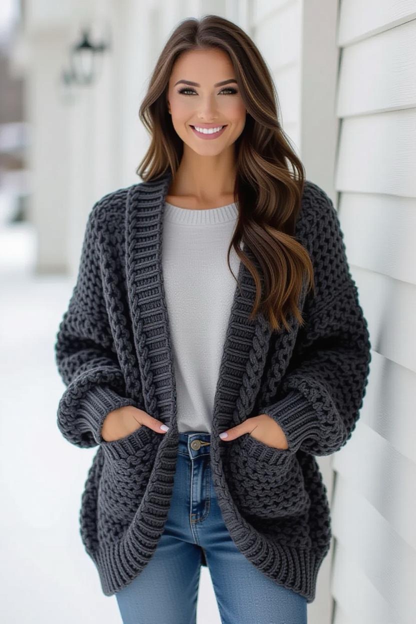 A warm and cozy shrug made with chunky yarn that’s perfect for layering in colder months. The oversized fit and textured stitches make it a snuggly wardrobe staple. Pair it with jeans and boots for casual outings or wear over a dress for added warmth.