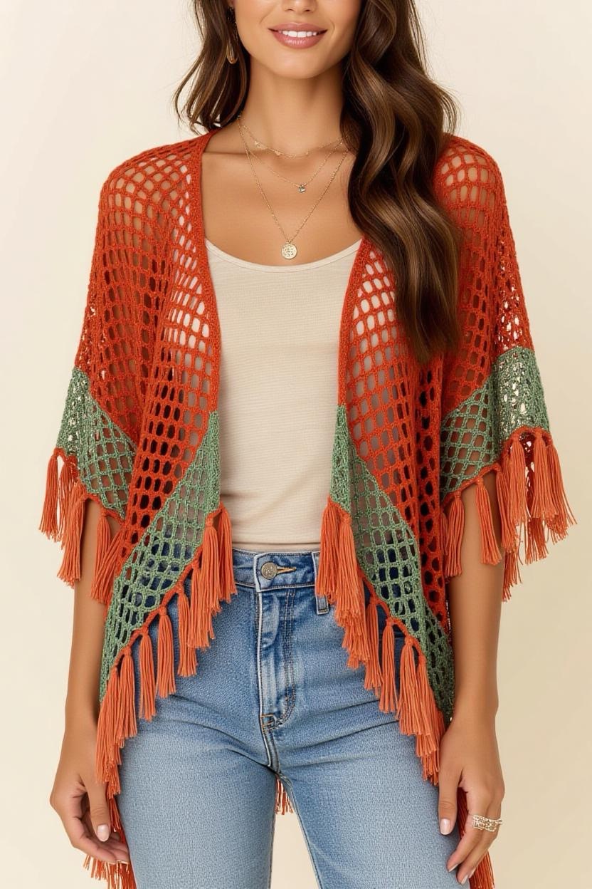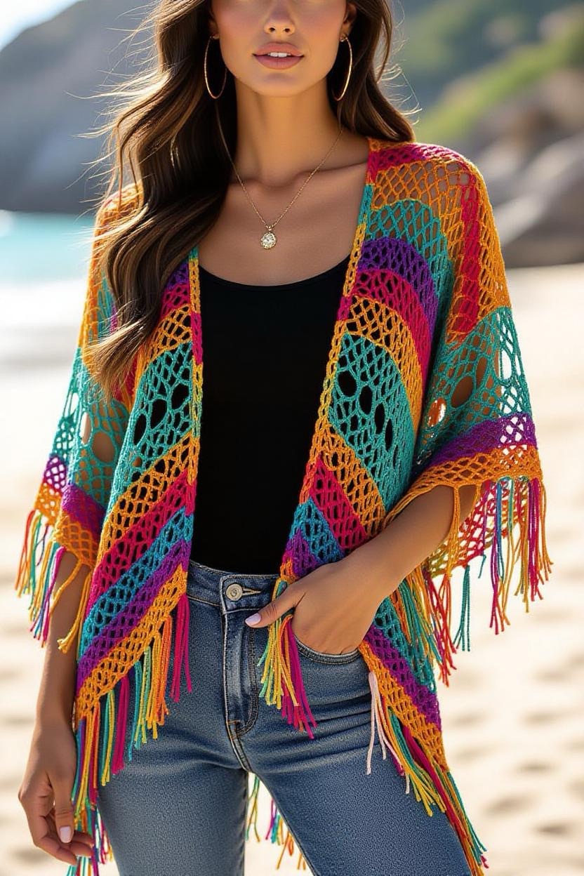 Bring out your inner free spirit with this boho-inspired shrug. The openwork crochet pattern, combined with long, playful fringe, creates a relaxed yet stylish look. Ideal for festivals, beach trips, or layering over a simple tank top.