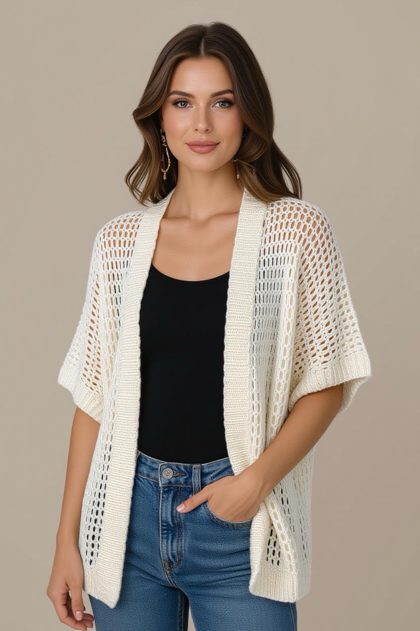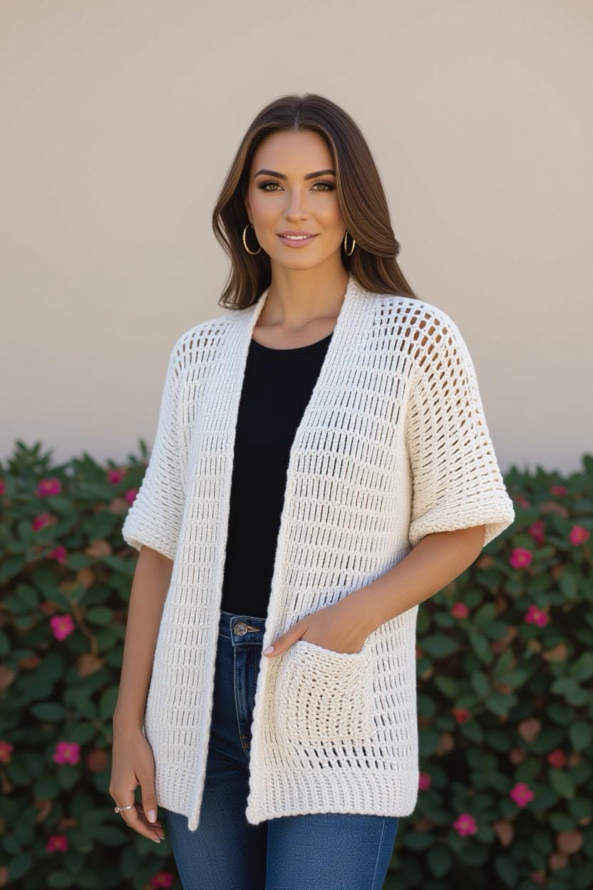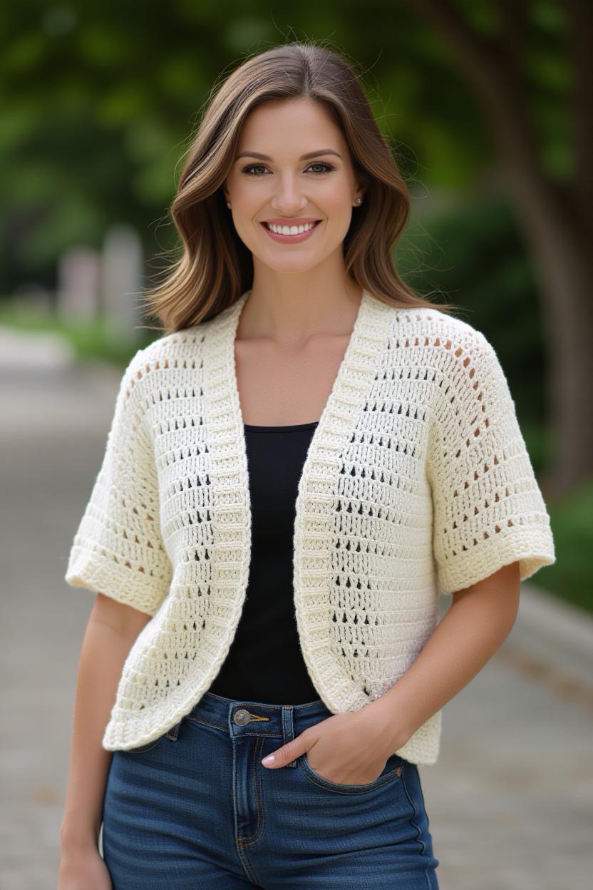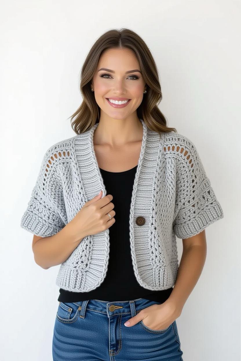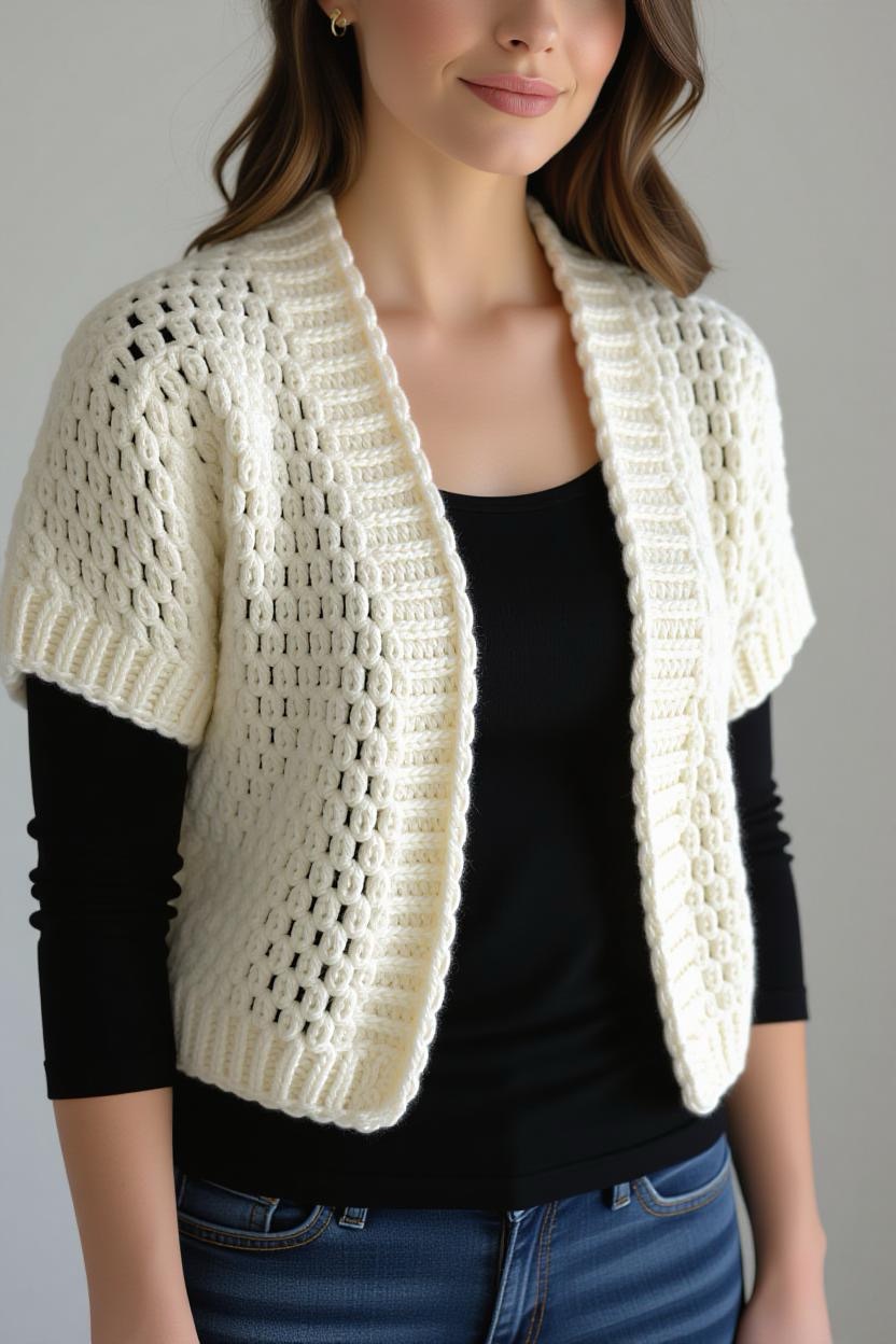 A quick and simple shrug perfect for daily wear. Its short sleeves and simple stitch pattern make it a go-to layering piece for all kinds of casual outfits.