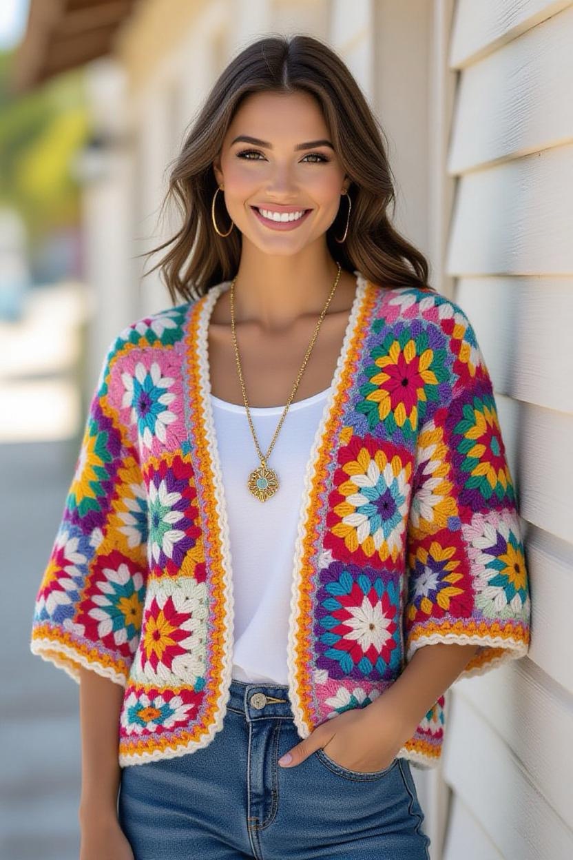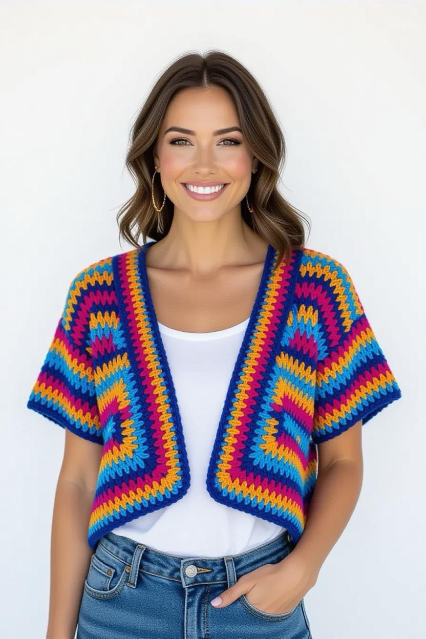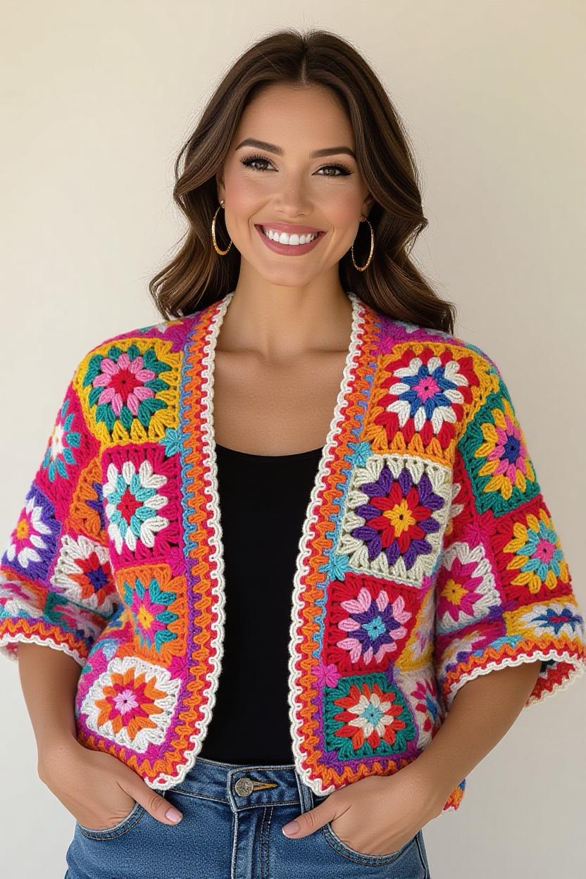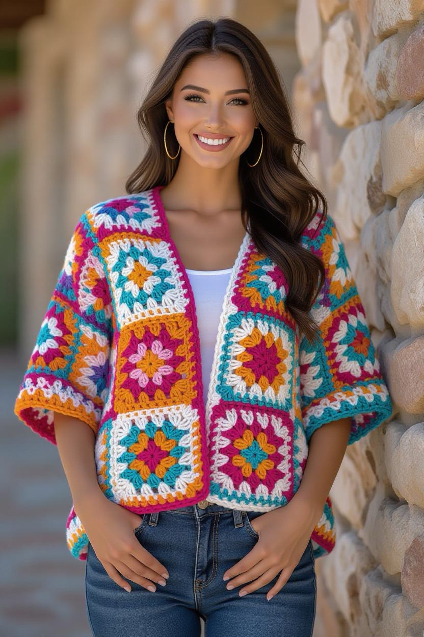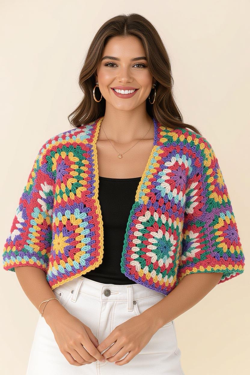 A colorful and nostalgic piece made entirely from granny squares. This shrug is fun to customize mix and match your favorite shades or keep it classic with coordinated tones. Great for beginners who love vibrant crochet projects.