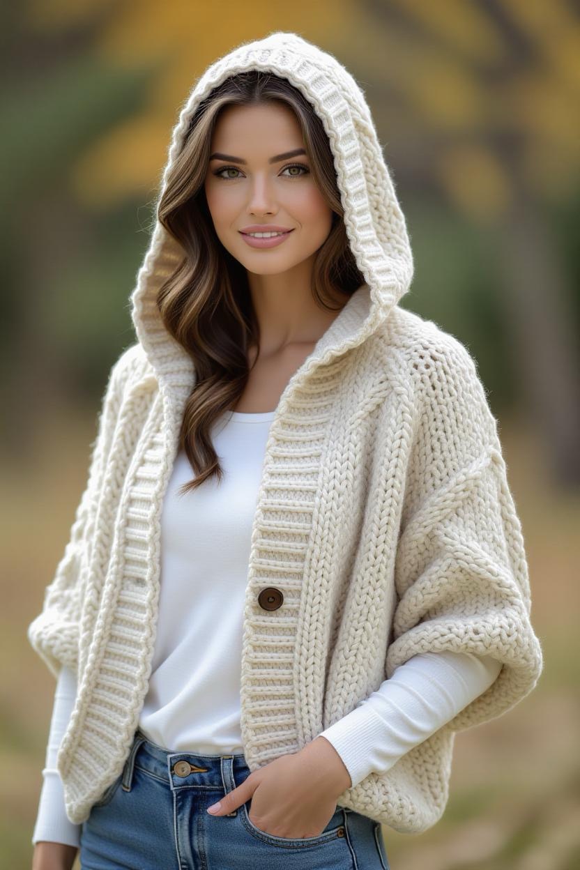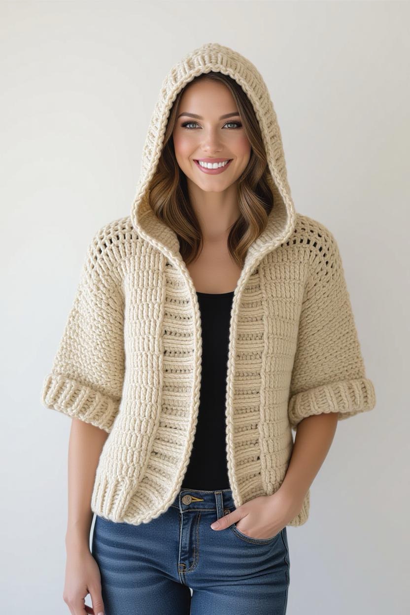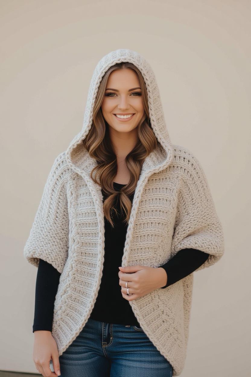 Perfect for cozy days, this shrug includes a functional hood for added comfort and style. It’s great for transitional weather and can be made in neutral tones for everyday wear or bold colors for a playful look.
