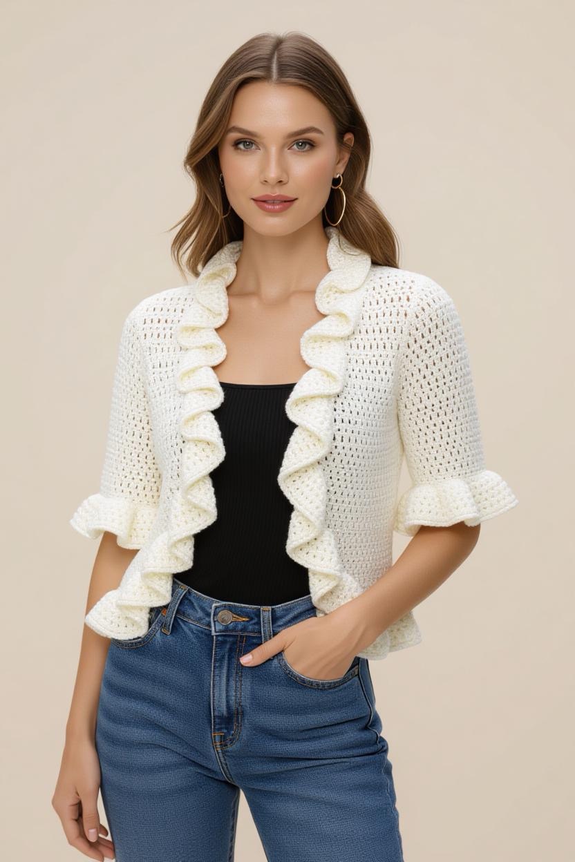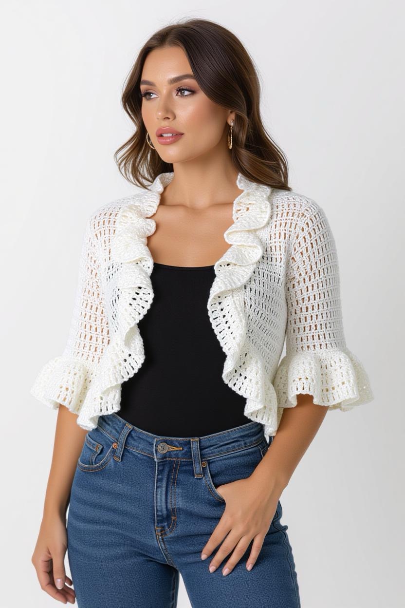 Add a feminine flair to your outfit with a shrug featuring ruffled edges. The soft ripples create a romantic look that’s perfect for date nights or special occasions.