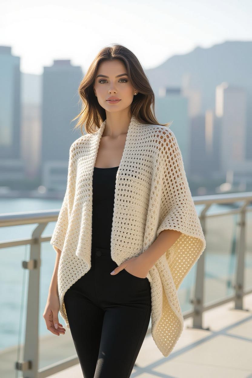 A modern twist on the classic shrug, this longline version offers more coverage and a sleek silhouette. The open front design makes it easy to throw on over casual or dressy looks. Use lightweight yarn for spring or thicker yarn for autumn.