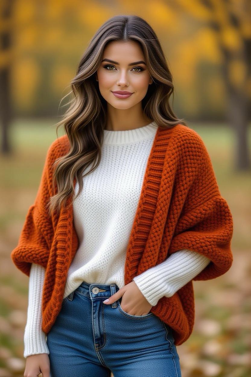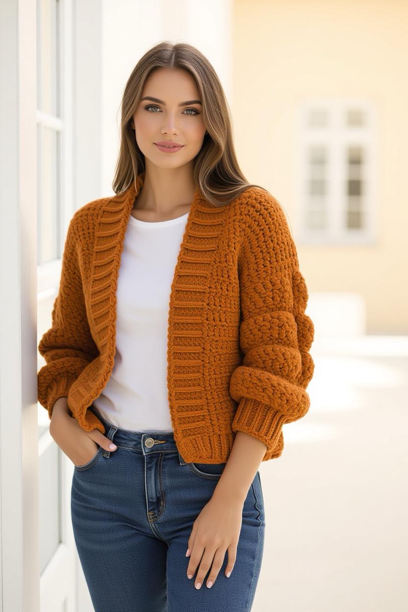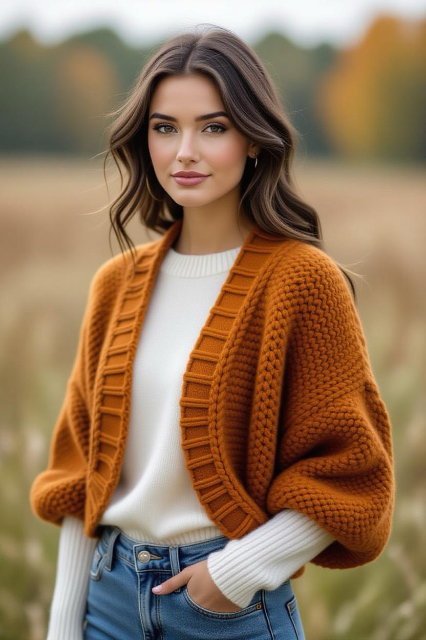 The puff stitch adds a soft, cozy texture to this shrug, making it an appealing choice for colder months. Choose earthy tones for a natural, autumn feel.