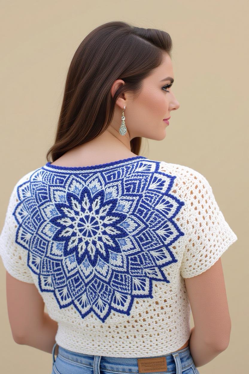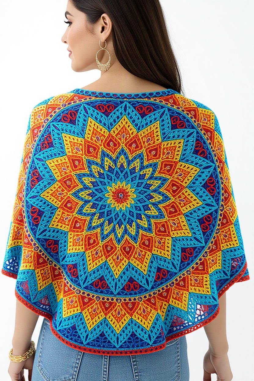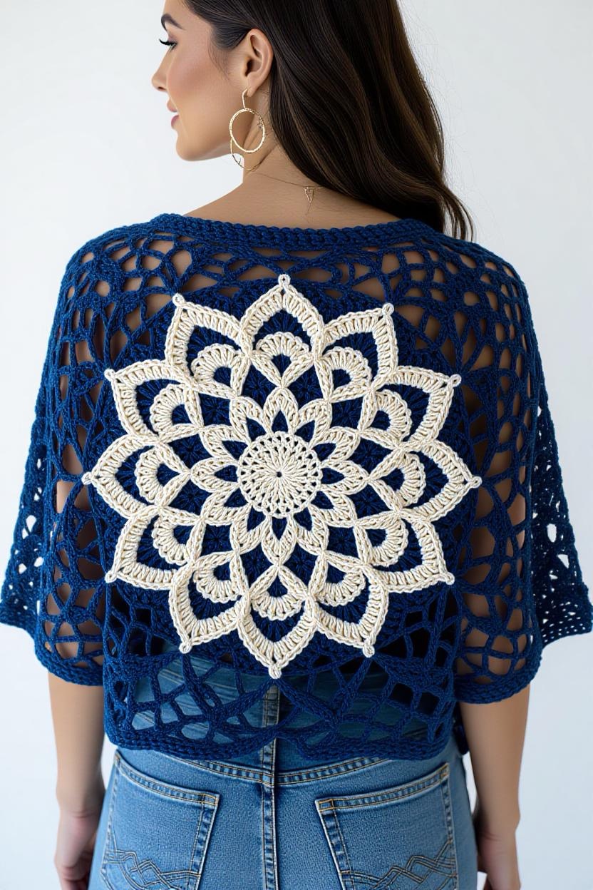This shrug features an eye-catching mandala design at the back, giving it a striking focal point. Perfect for showcasing your crochet skills.