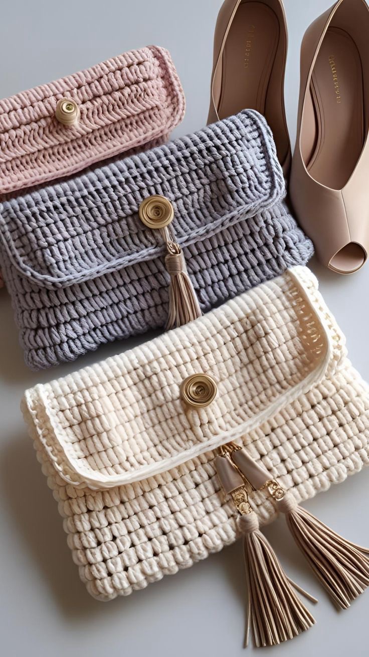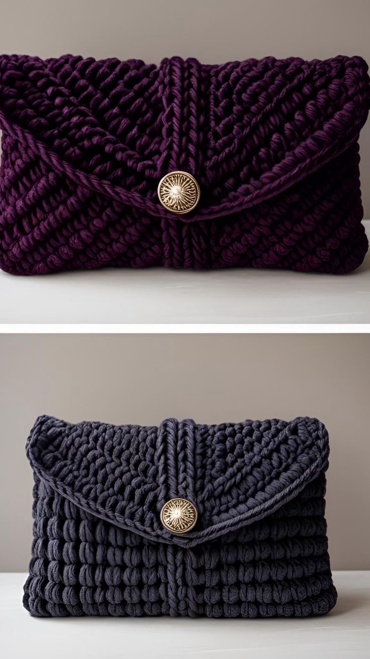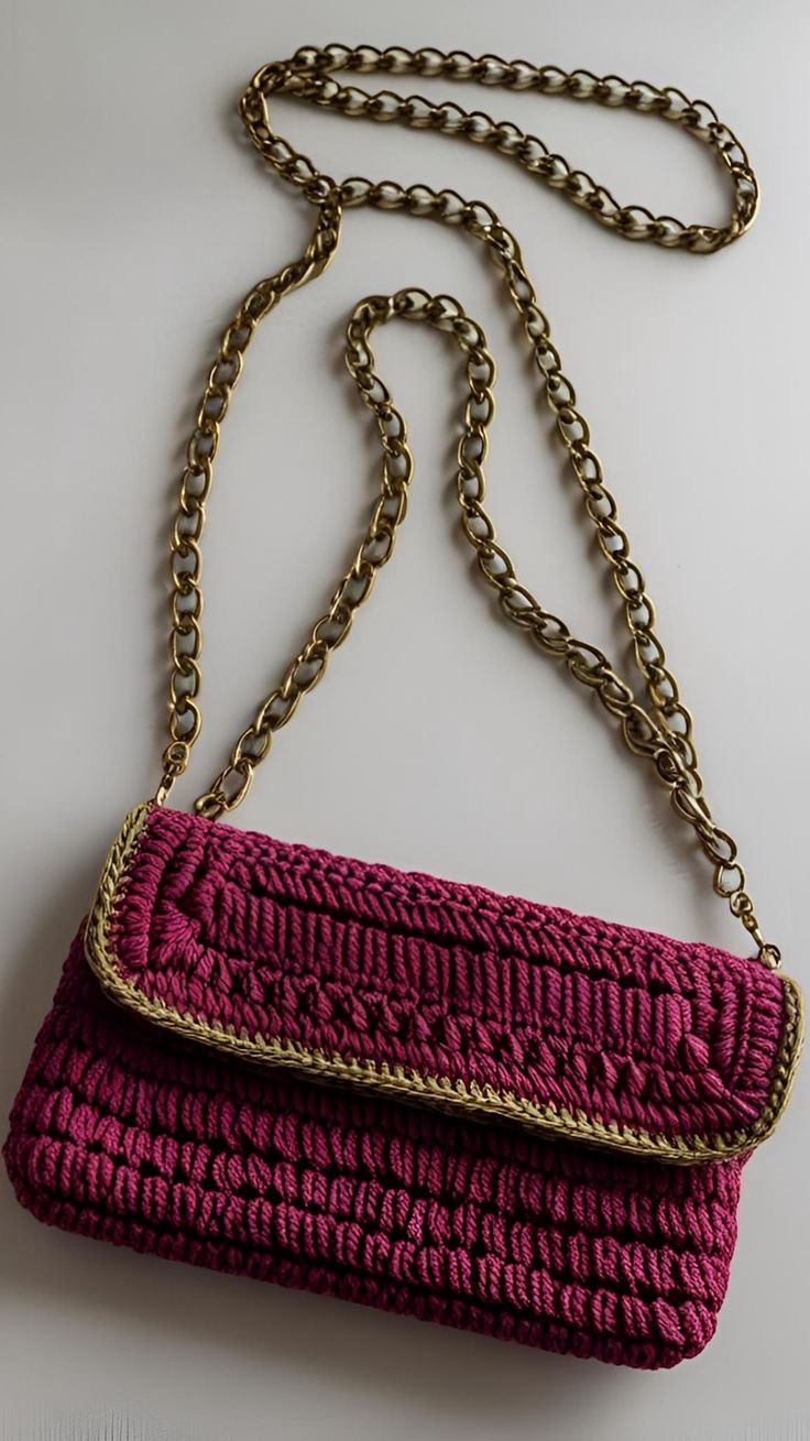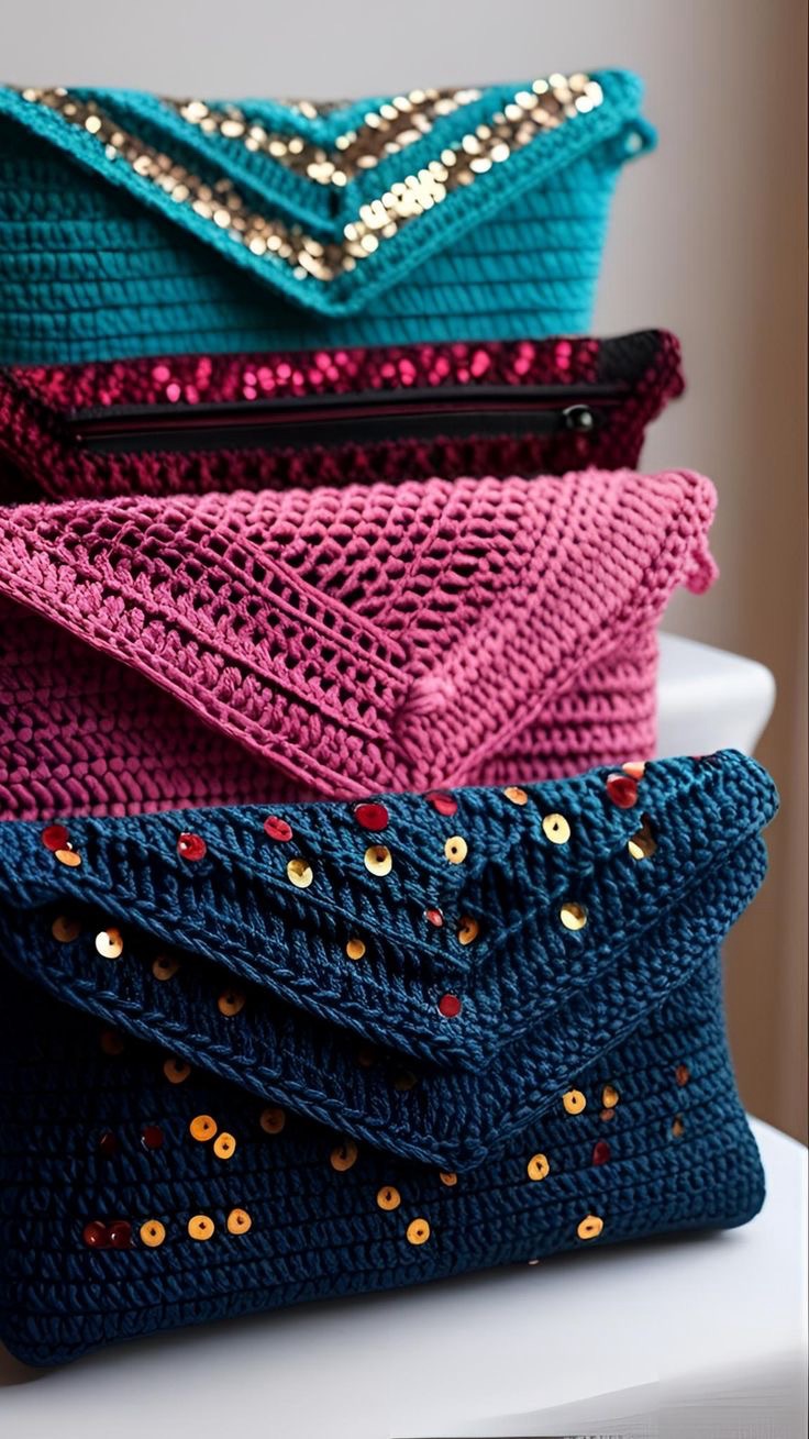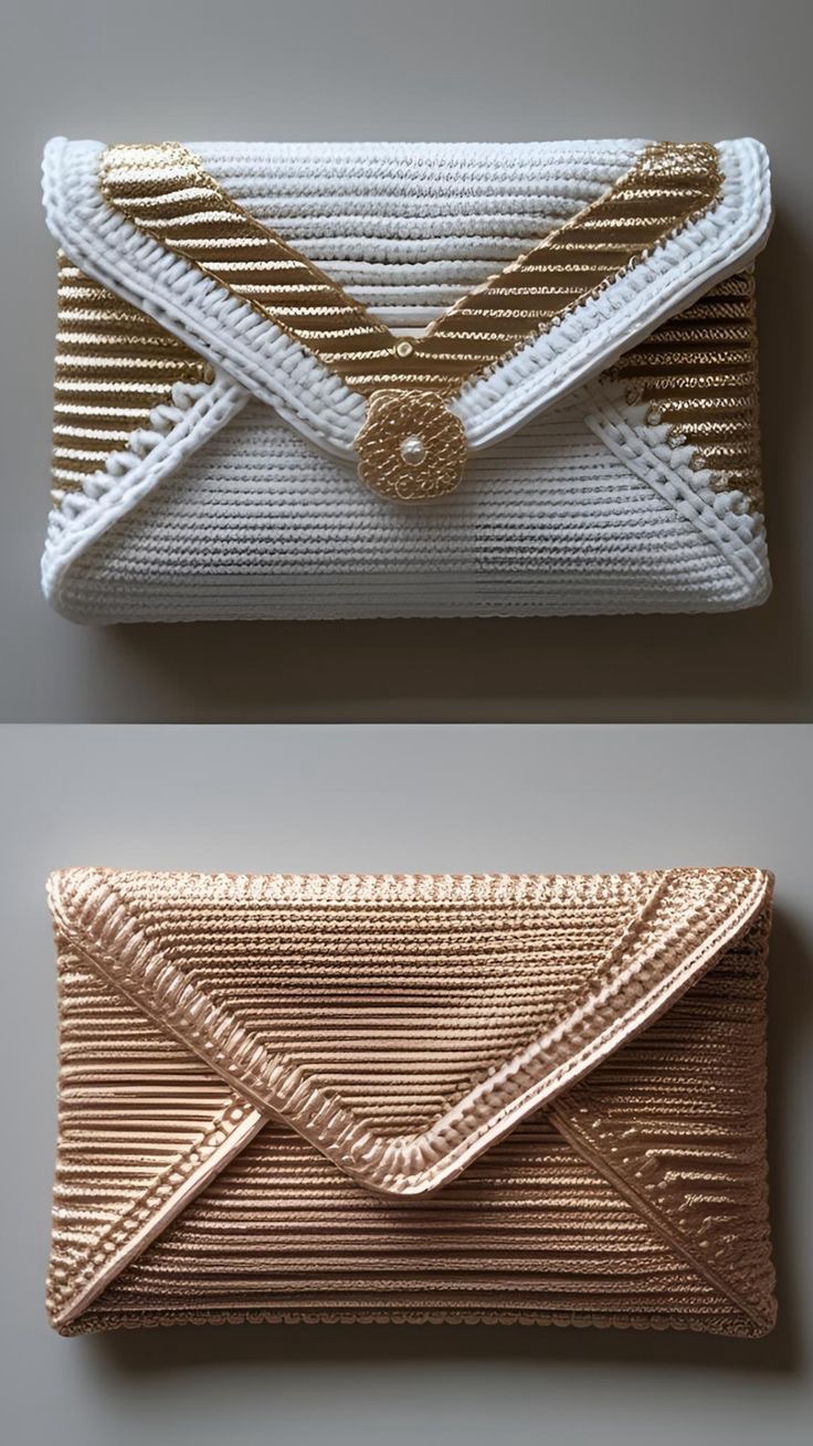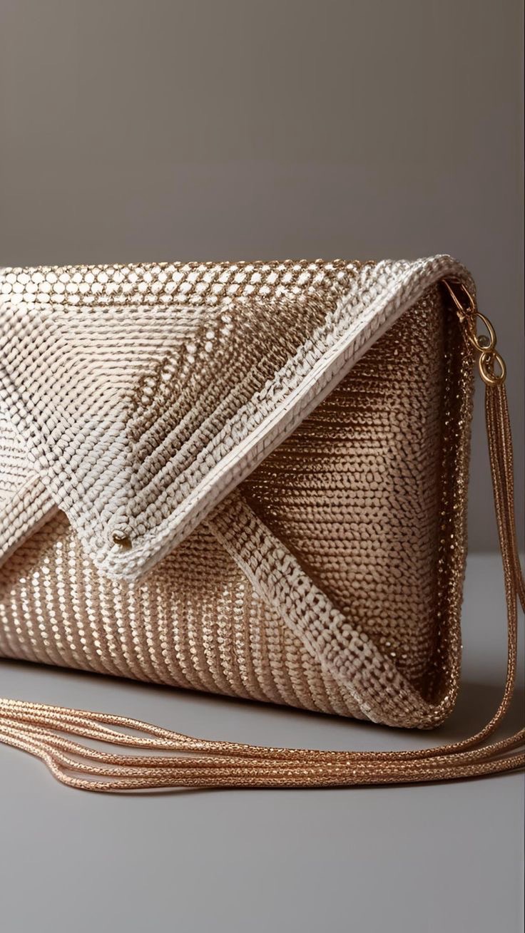 For evening glam, a sleek envelope-style clutch made with metallic thread is a go-to. Choose silver, gold, or rose gold yarns for that luxe shimmer. The envelope flap gives a modern edge, while the sparkle adds an upscale vibe ideal for galas or cocktail parties.