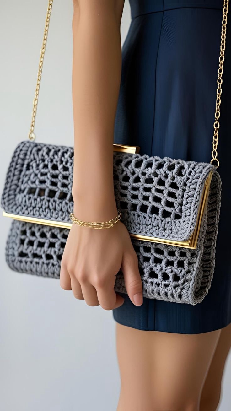 Pair traditional crochet with a metal clutch frame for a polished, structured silhouette. This design is perfect in neutral shades like gray, navy, or taupe and works well for office parties or formal luncheons.