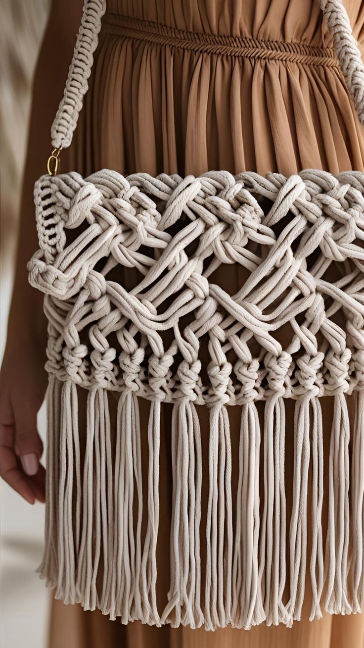 Embrace boho vibes with a macramé-inspired clutch featuring knot-like stitches and long fringe. Perfect for beach weddings or sunset events, this lightweight purse has a free-spirited, artistic feel.
