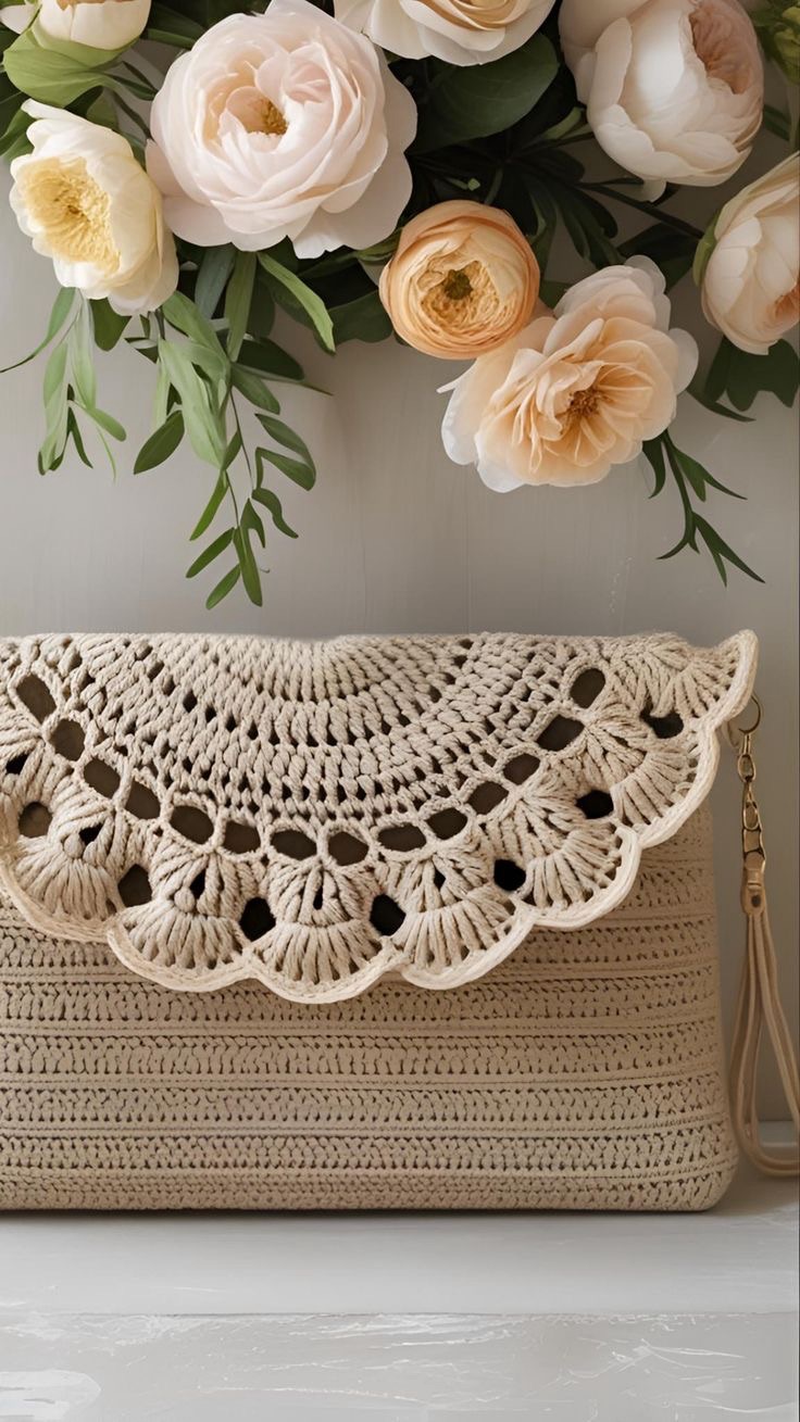 Delicate and timeless, the lacy shell stitch clutch brings romantic vibes to any bridal or formal outfit. Opt for ivory or champagne yarn to match wedding themes, and add a pearl button or vintage clasp for a classic touch. Lightweight and compact, this design fits your essentials while staying stylishly understated.