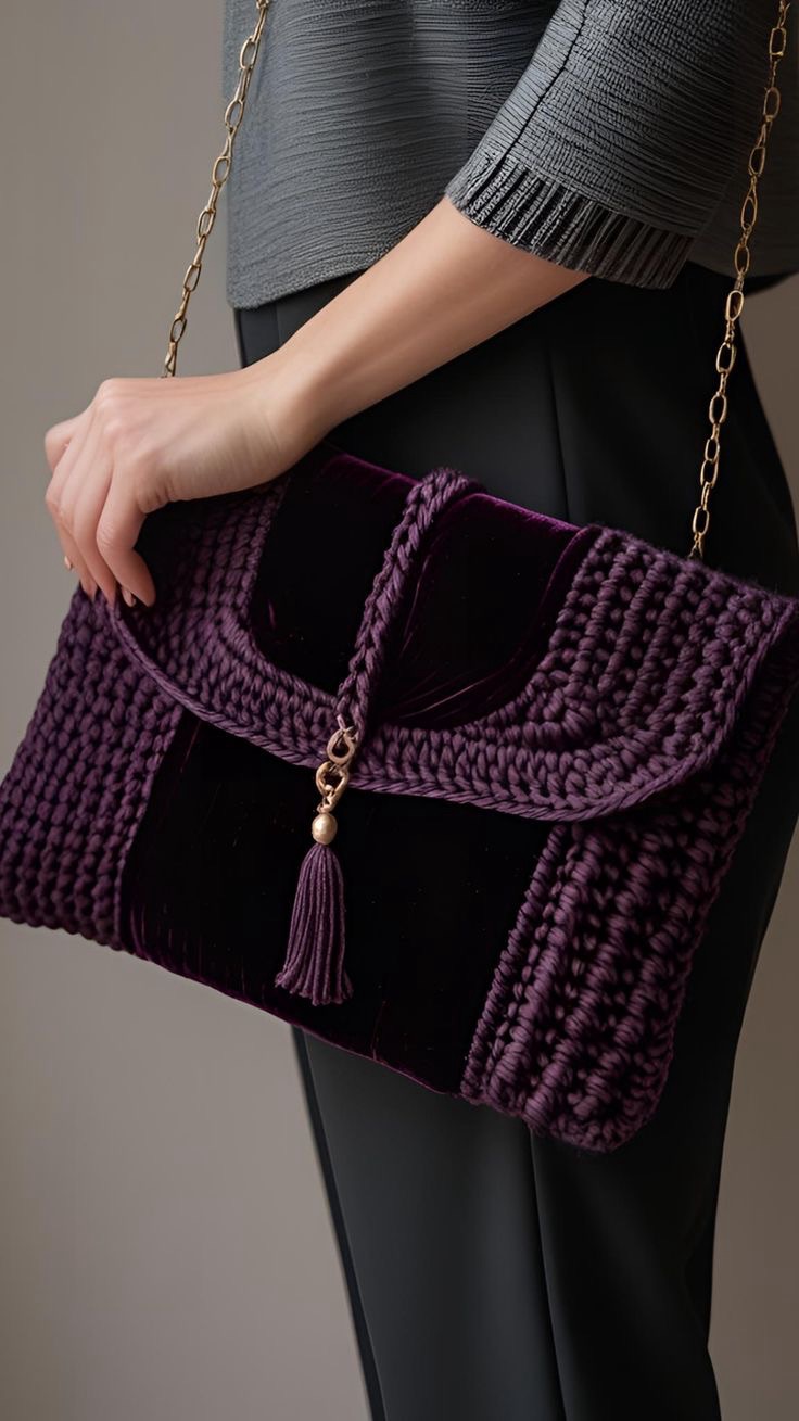 Crochet with velvet yarn for a rich, plush clutch design. Choose deep, moody hues like plum or charcoal. The luxurious texture and soft hand-feel make this perfect for cold-weather formal events.