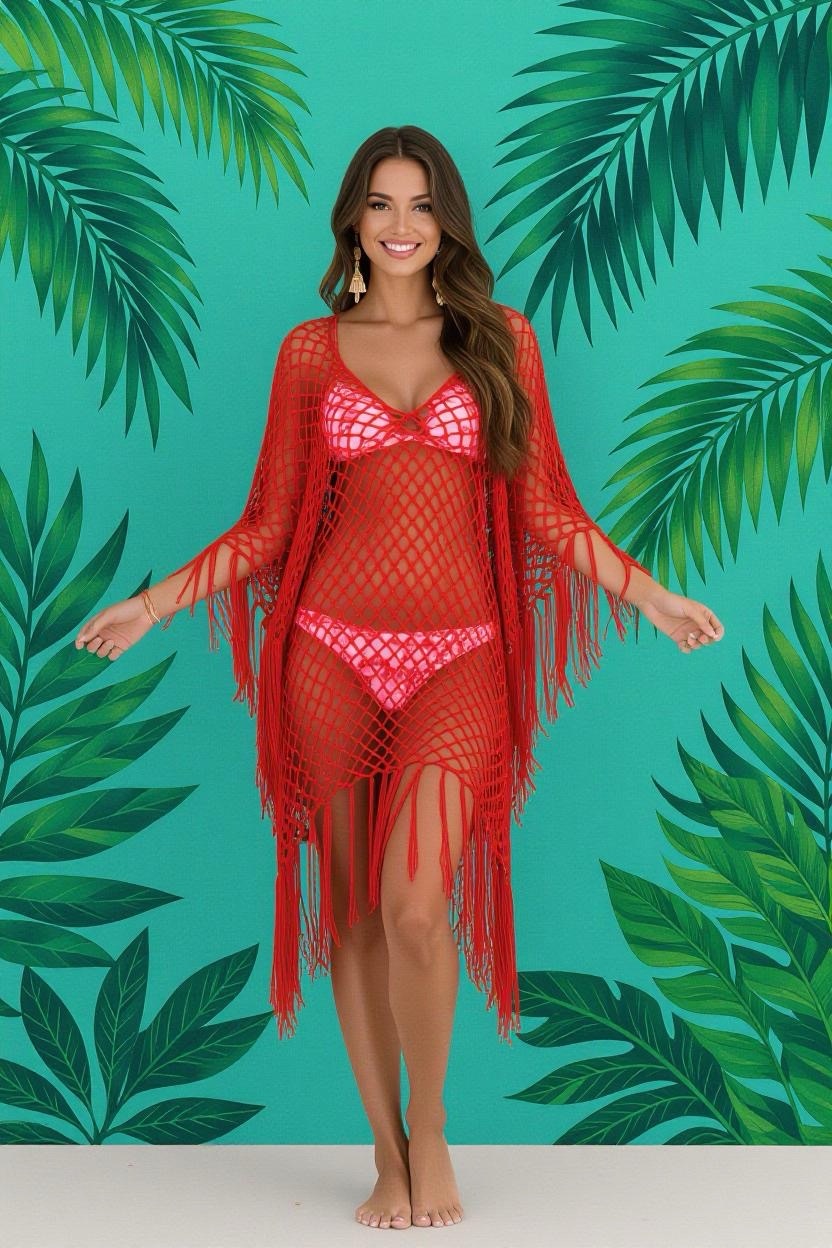A tunic-length cover-up with long, flowing fringe adds movement and a free-spirited vibe to your beachwear. Perfect for festivals, tropical vacations, or just lounging poolside, this design screams laid-back bohemian chic.
