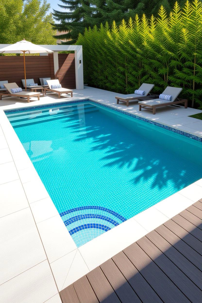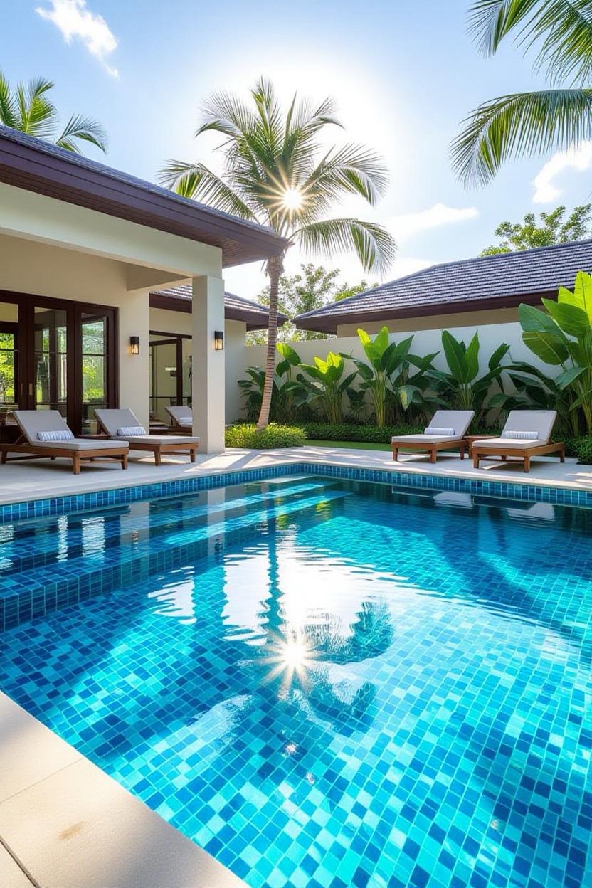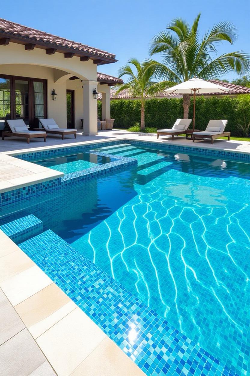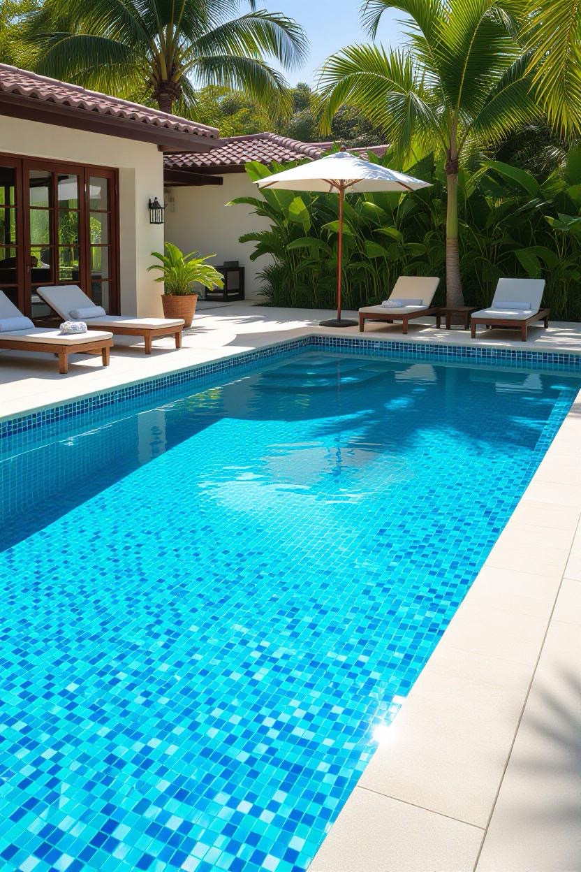 Shimmering glass tiles reflect sunlight beautifully, transforming your pool into a dazzling jewel. Whether you opt for deep blues, vibrant greens, or subtle neutrals, glass tiles add a luxurious finish.