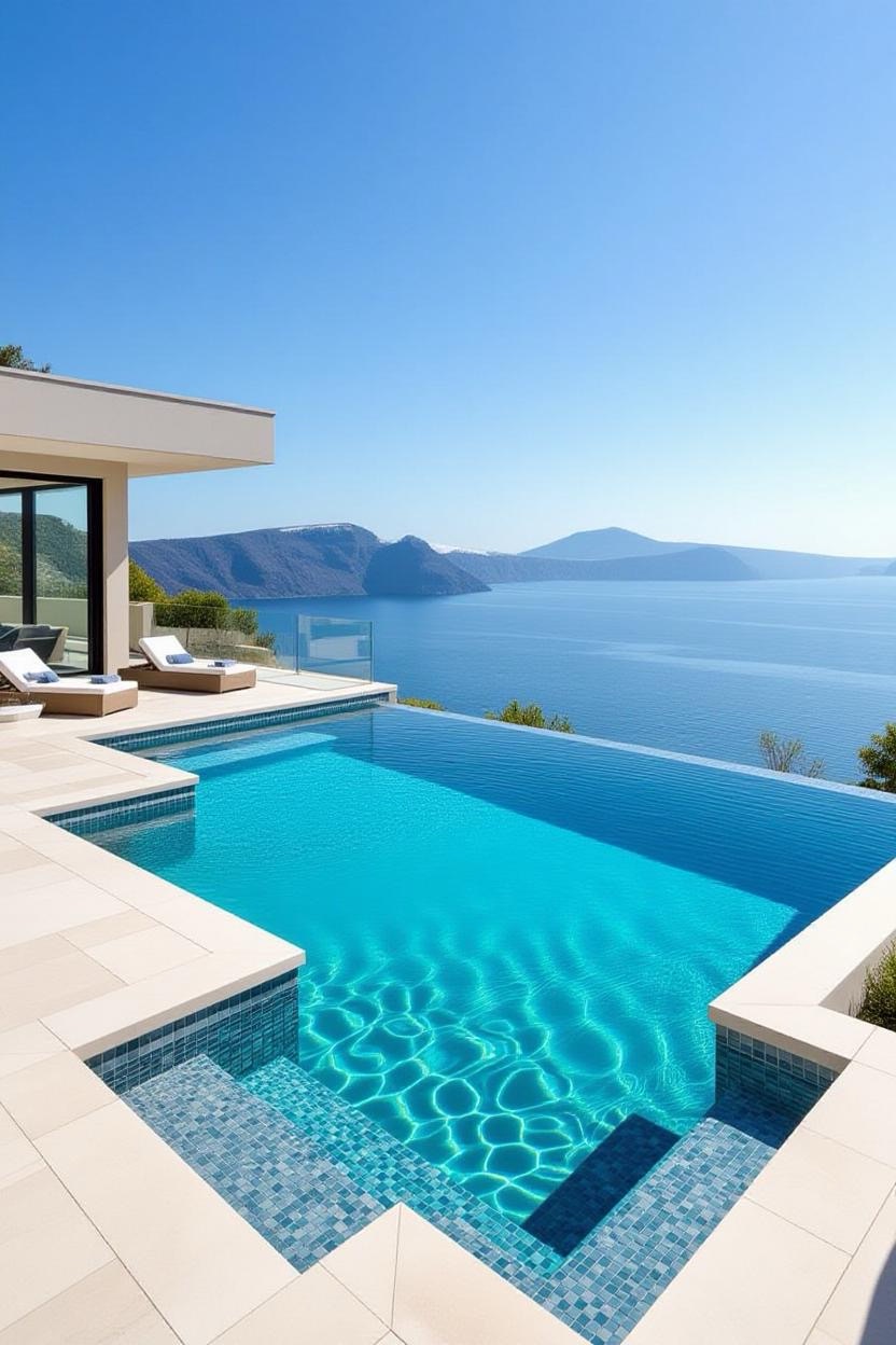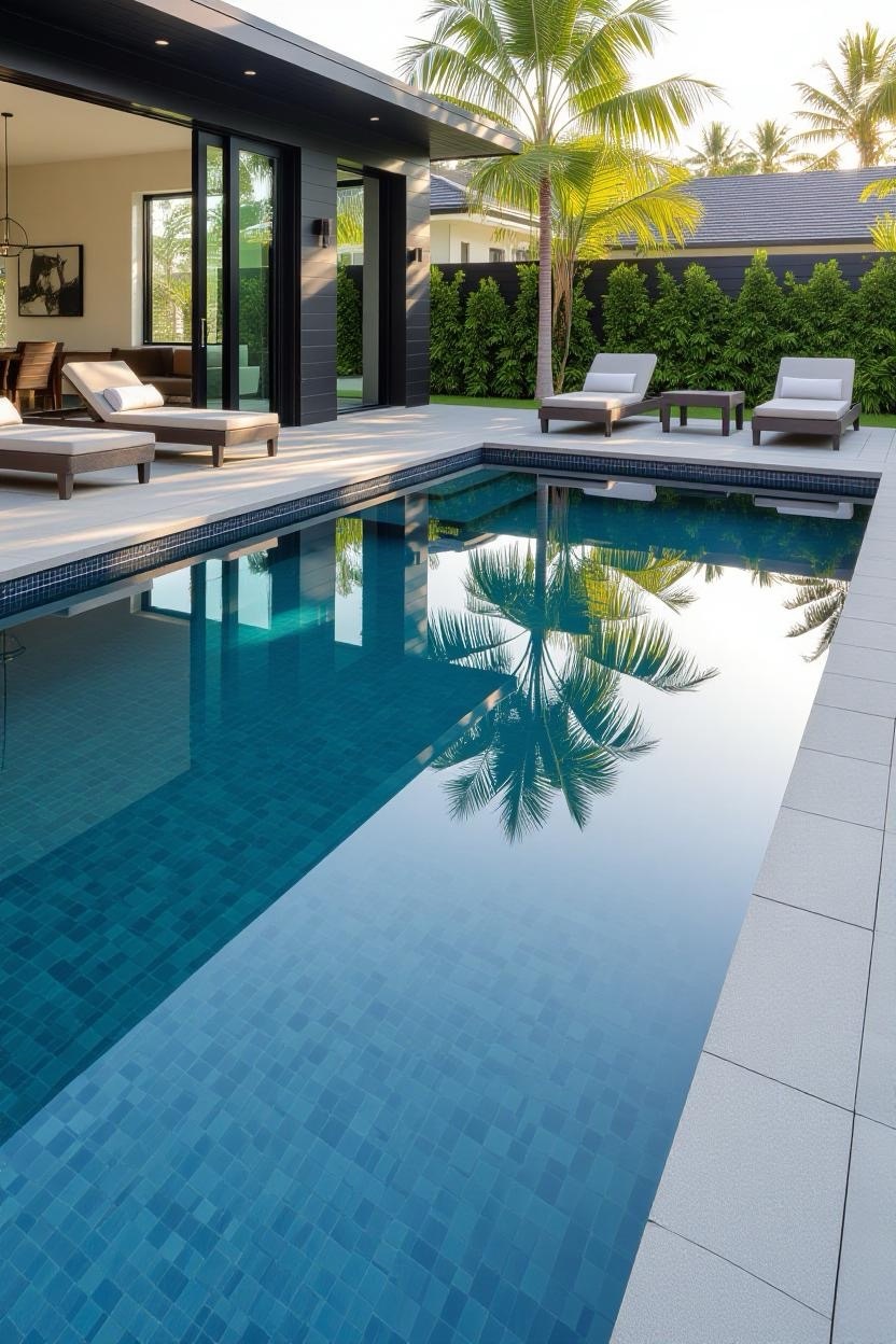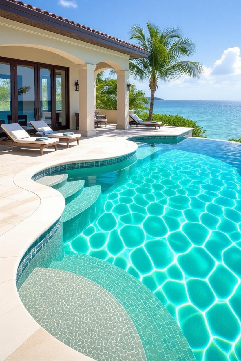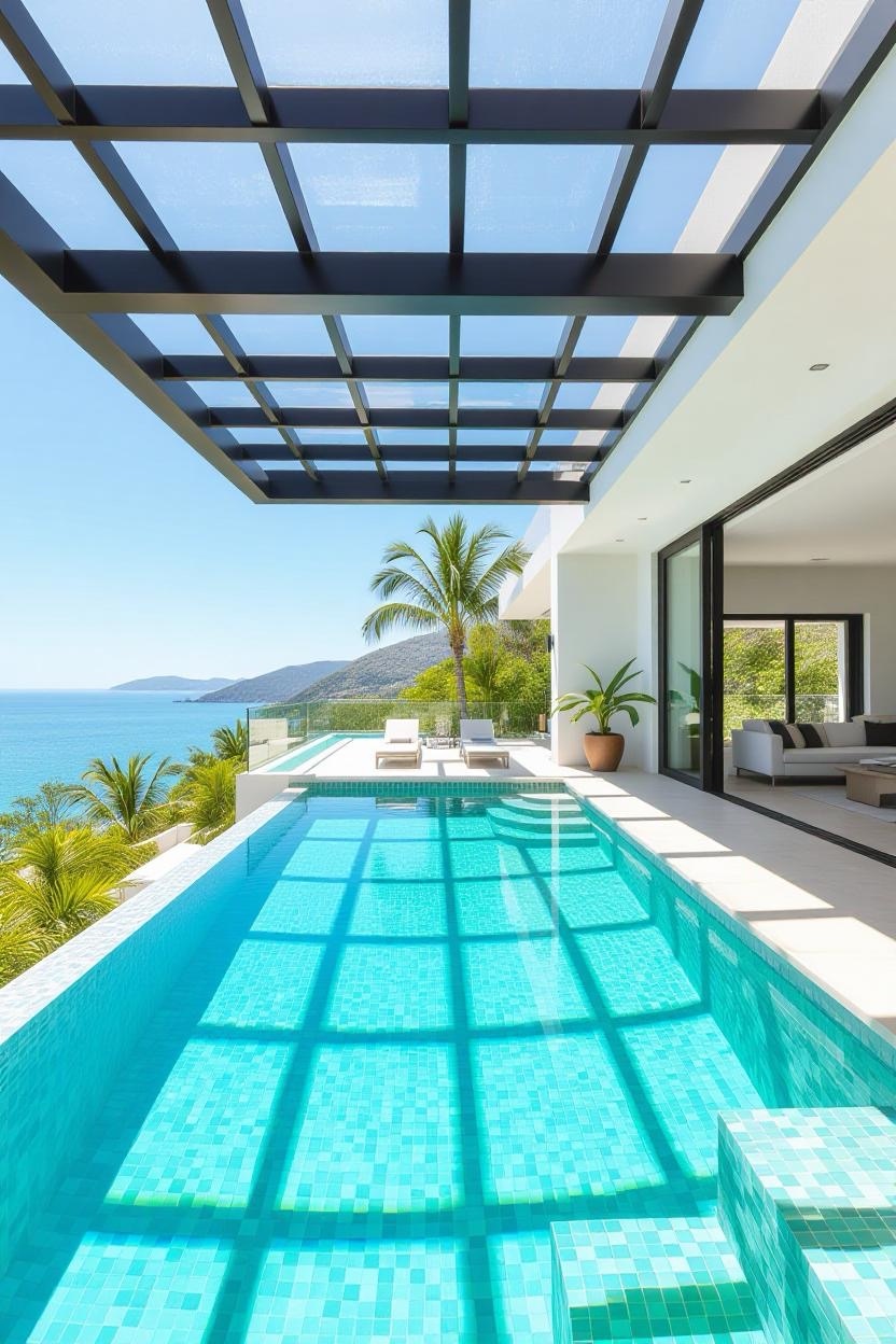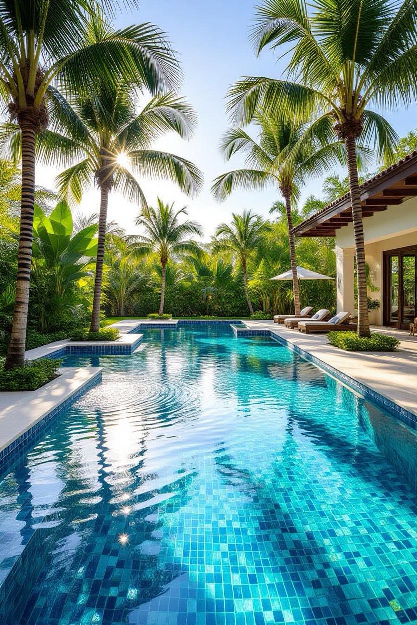 Shimmering glass tiles reflect sunlight beautifully, transforming your pool into a dazzling jewel. Whether you opt for deep blues, vibrant greens, or subtle neutrals, glass tiles add a luxurious finish.