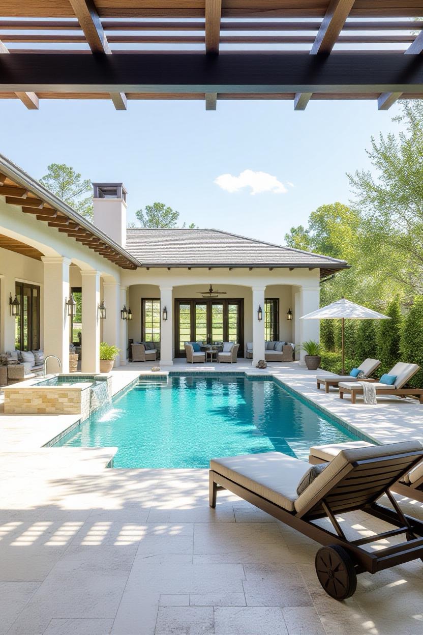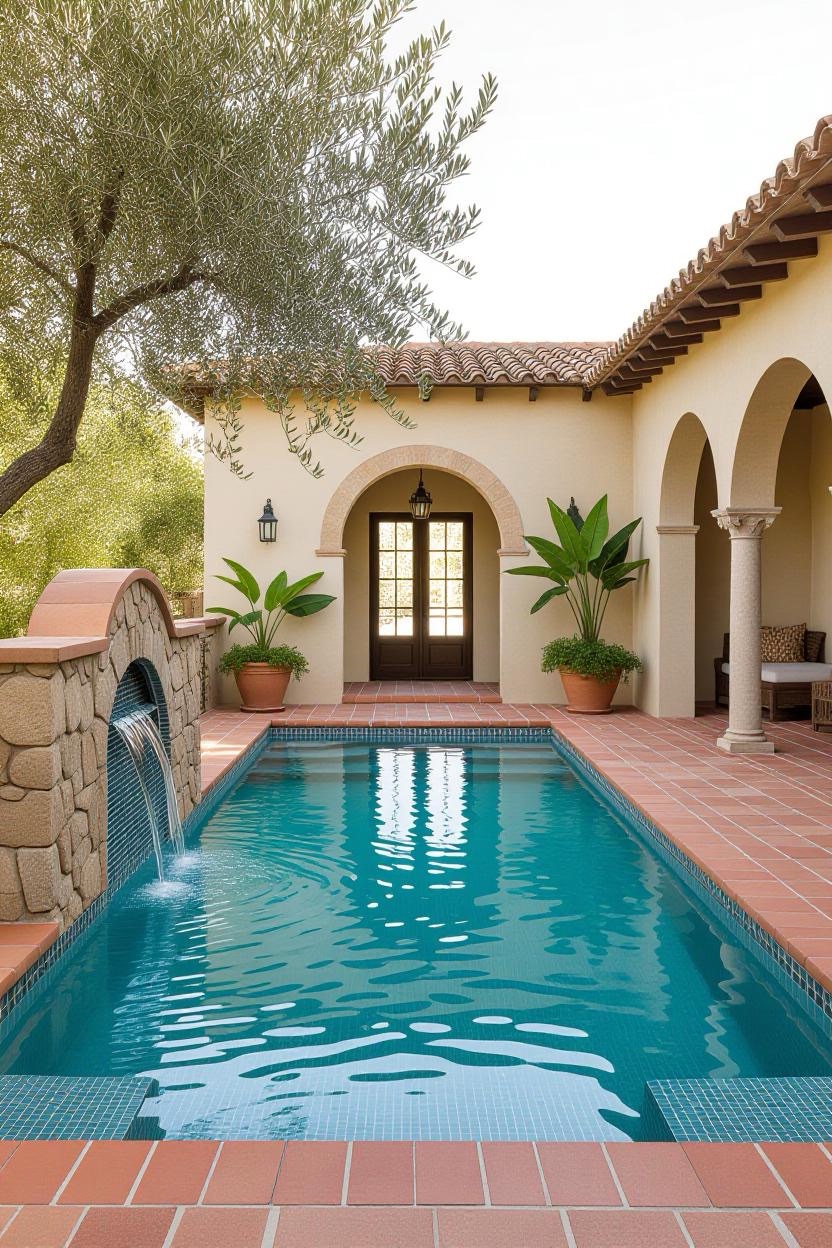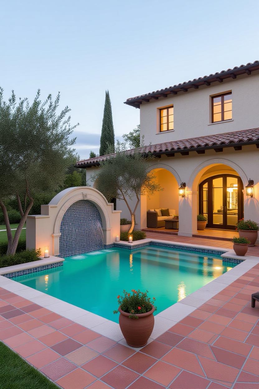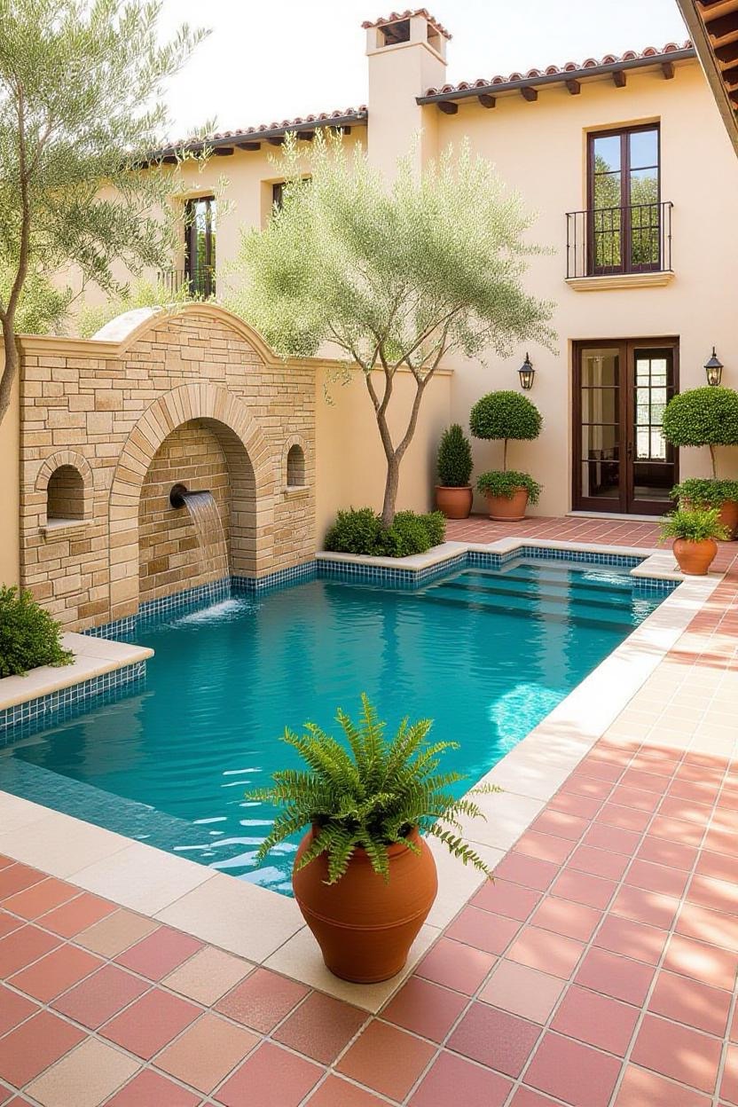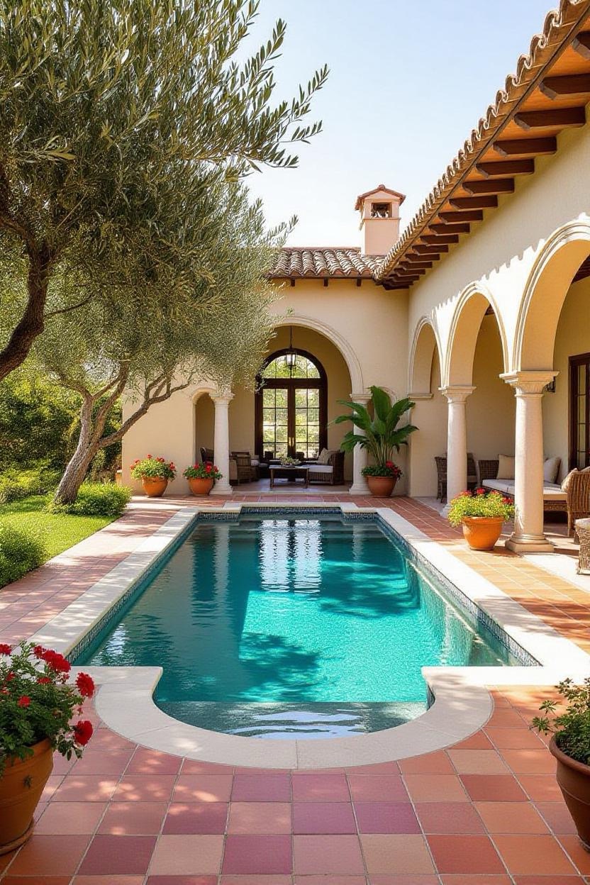 Embrace the warmth and style of a Mediterranean villa with a pool surrounded by terracotta tiles, arched water features, and classic stonework. Add olive trees or potted plants for a charming old-world vibe.
