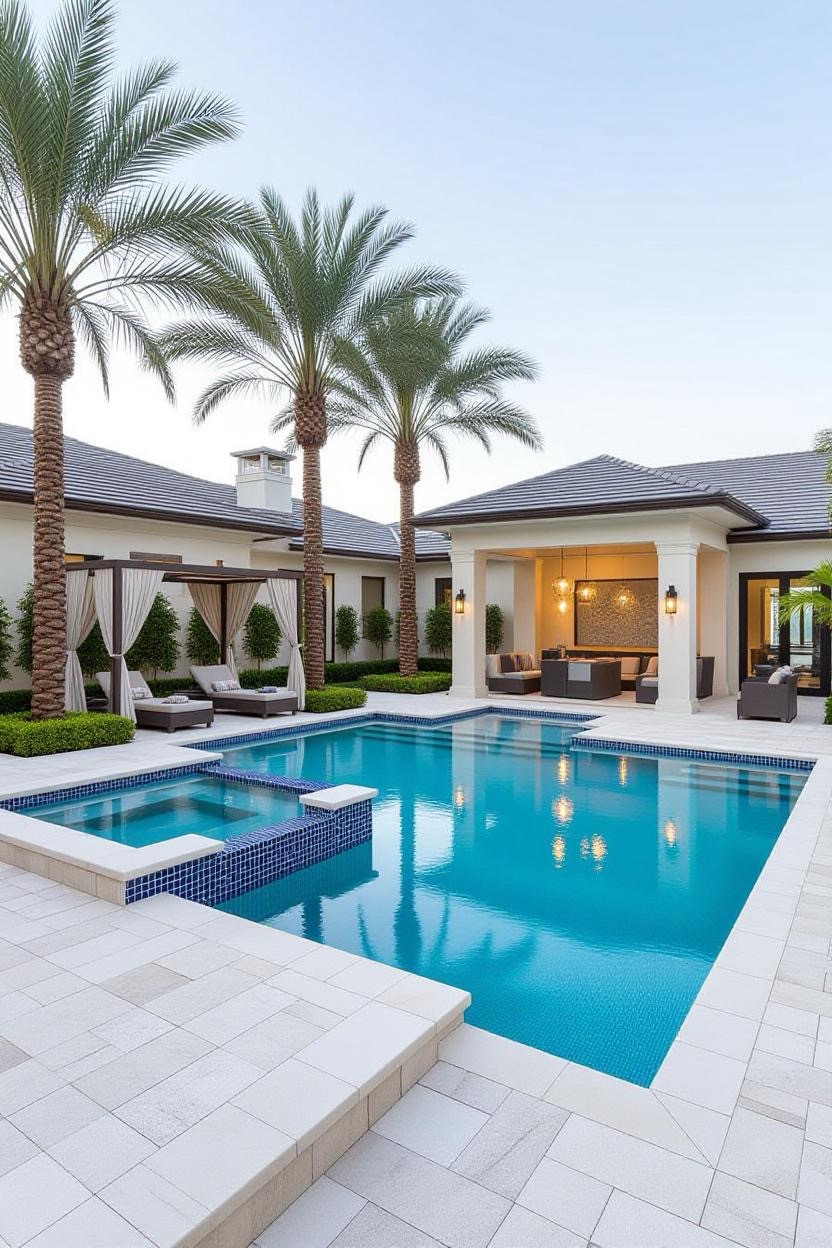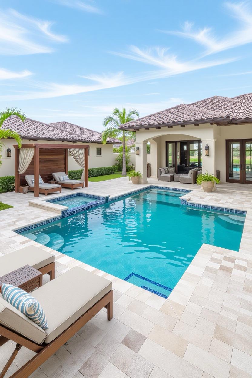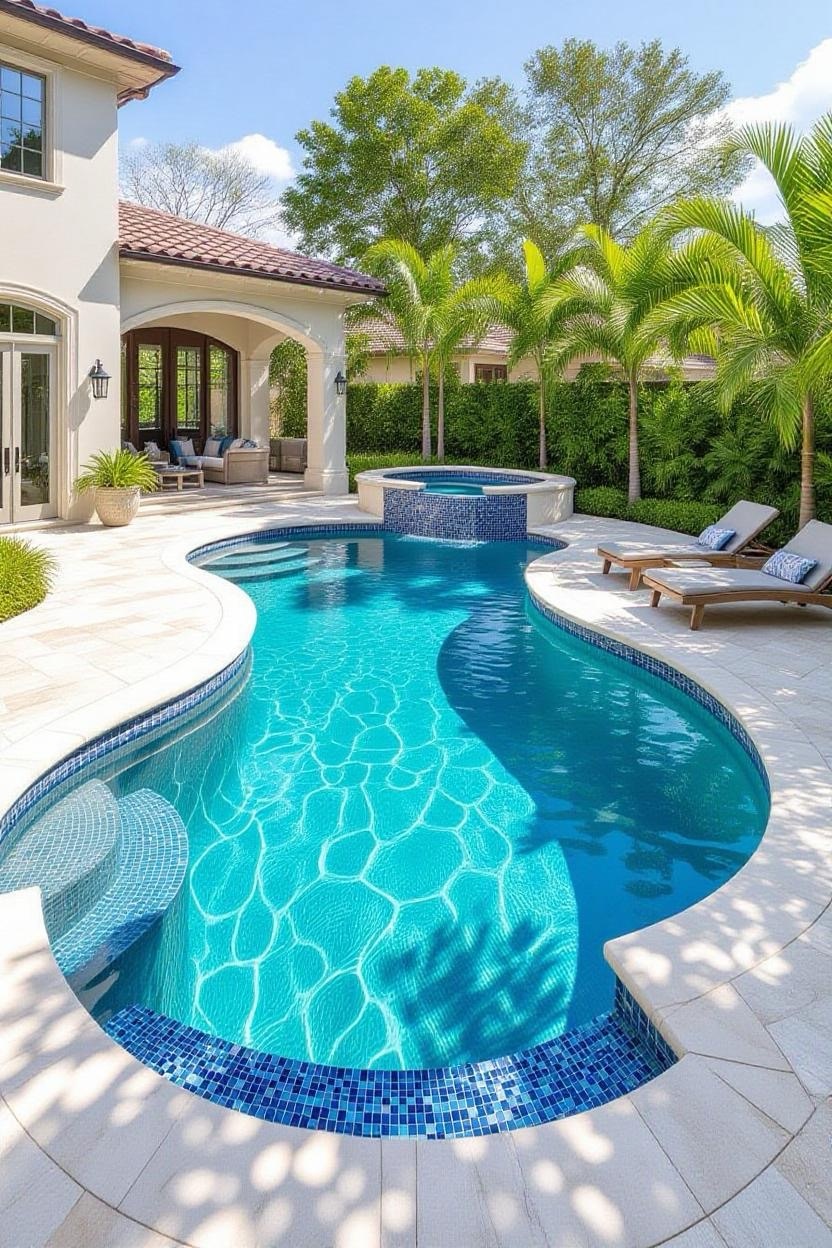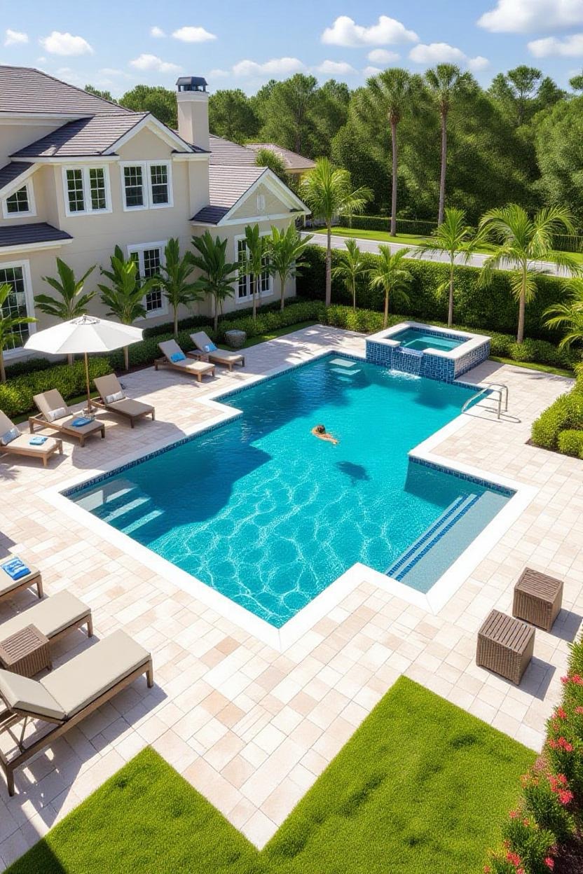 Embrace the warmth and style of a Mediterranean villa with a pool surrounded by terracotta tiles, arched water features, and classic stonework. Add olive trees or potted plants for a charming old-world vibe.