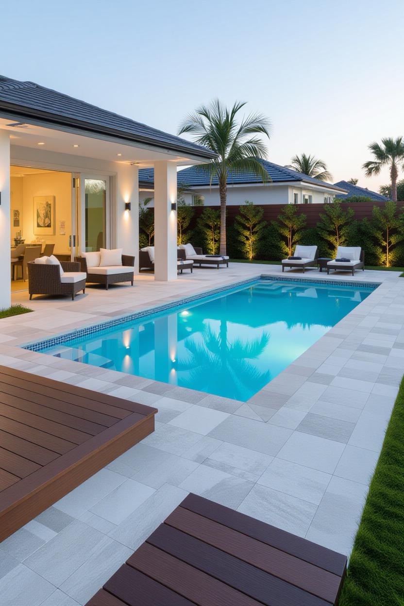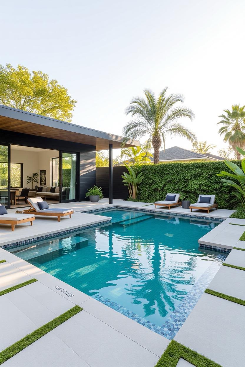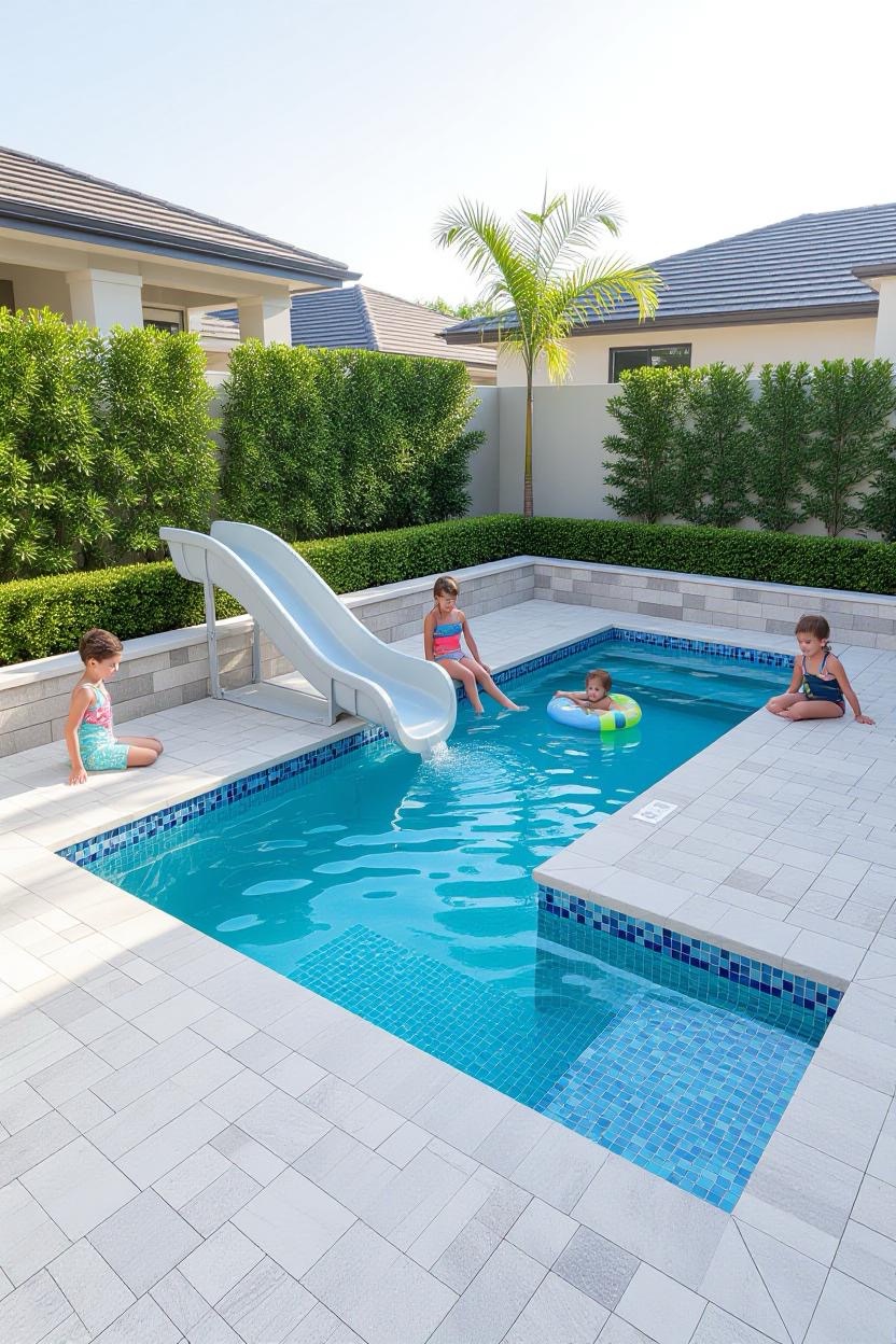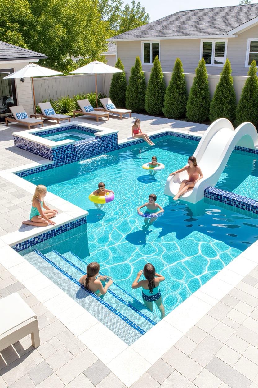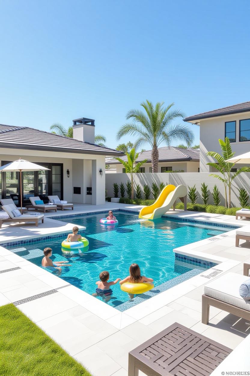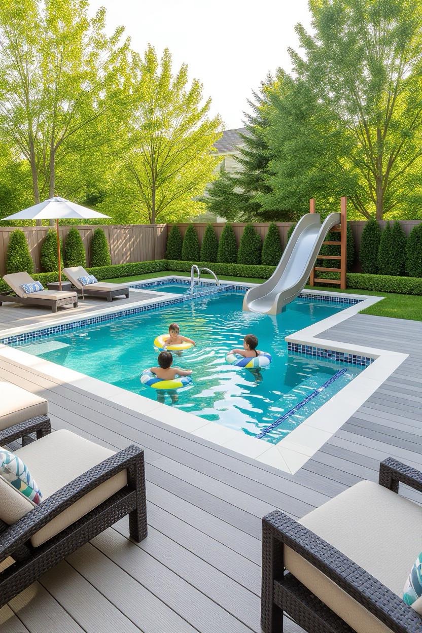 Design a pool that balances fun and safety for kids. Incorporate shallow zones, built-in slides, and non-slip decking. Family-friendly pools can still look modern and elegant with the right layout.