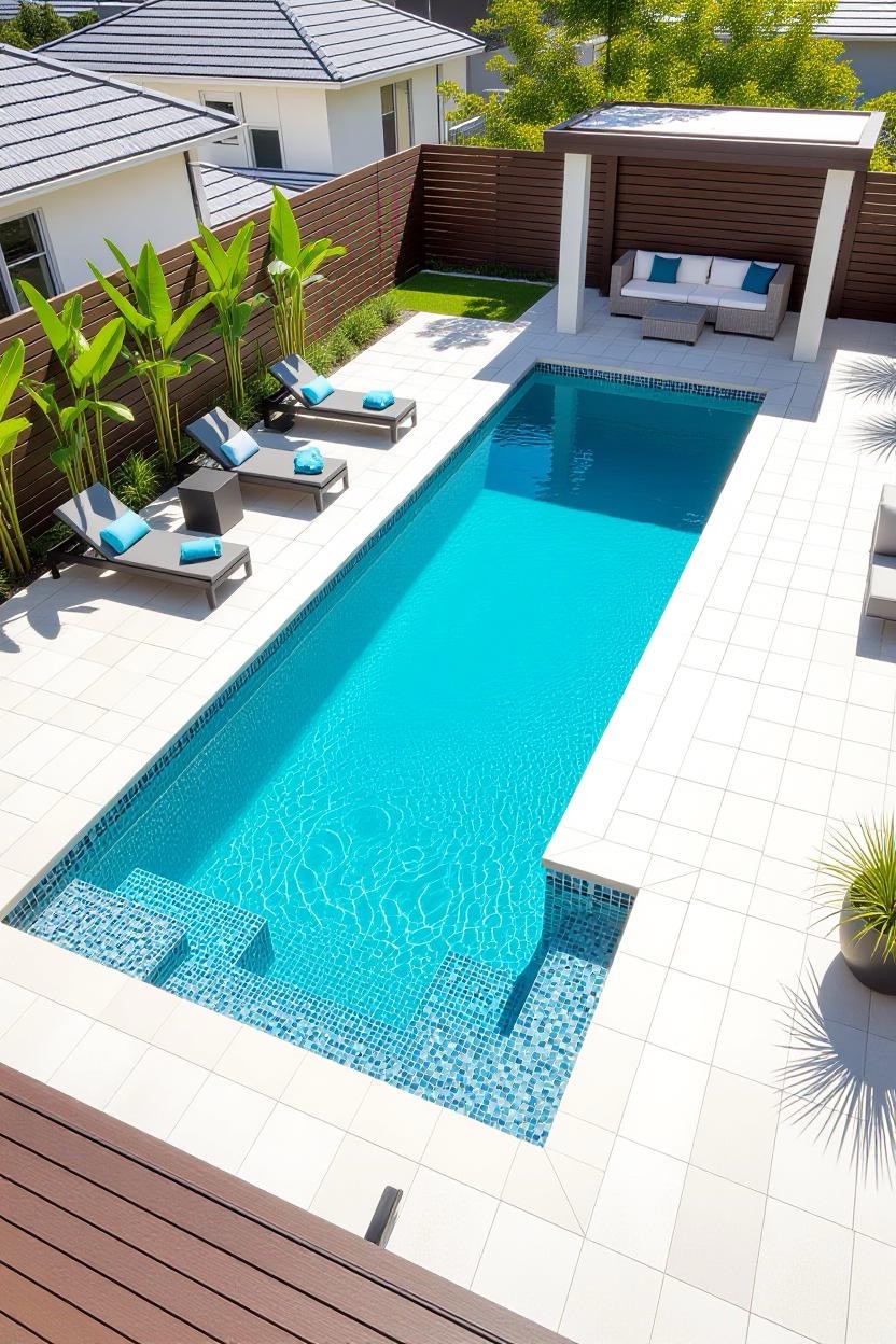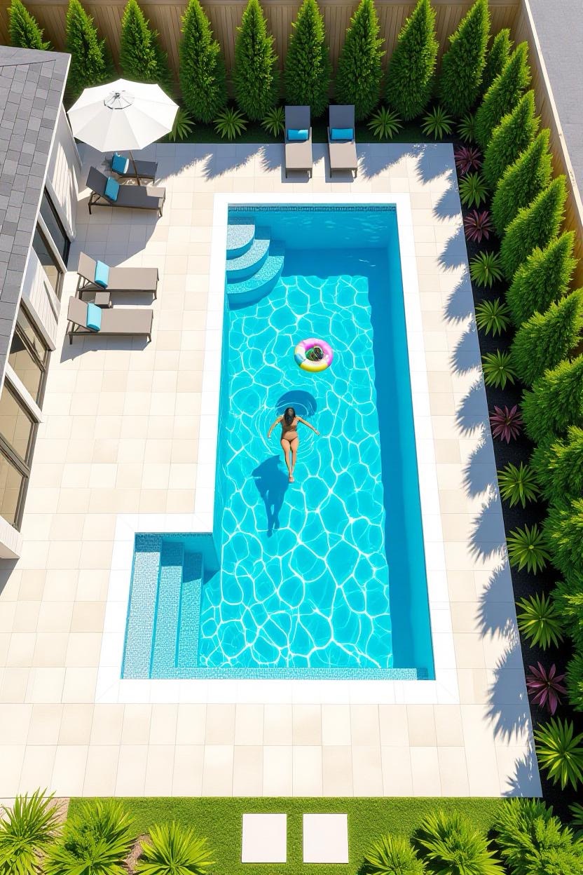 An L-shaped design allows for dual purposes, one section for swimming laps and another for lounging or shallow play. It’s versatile, functional, and a great fit for larger backyards.