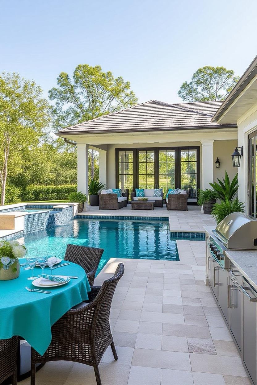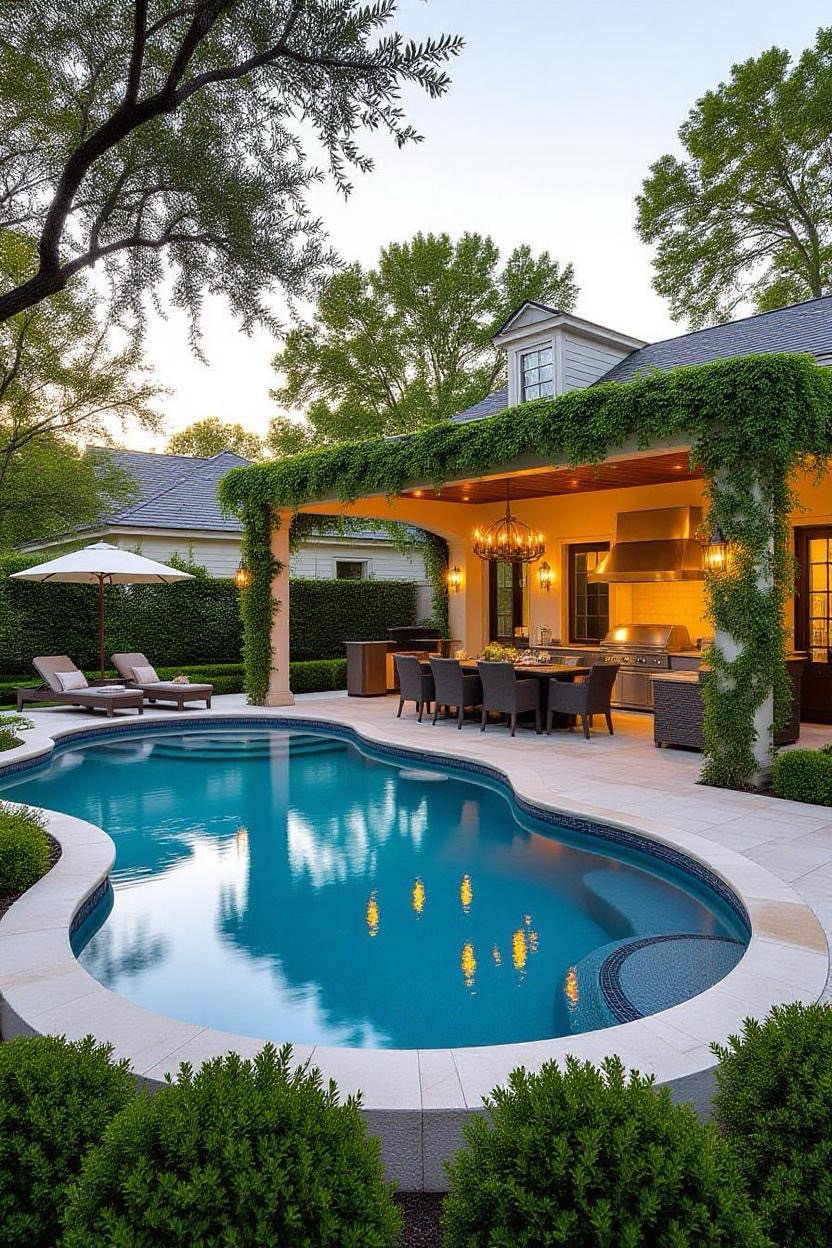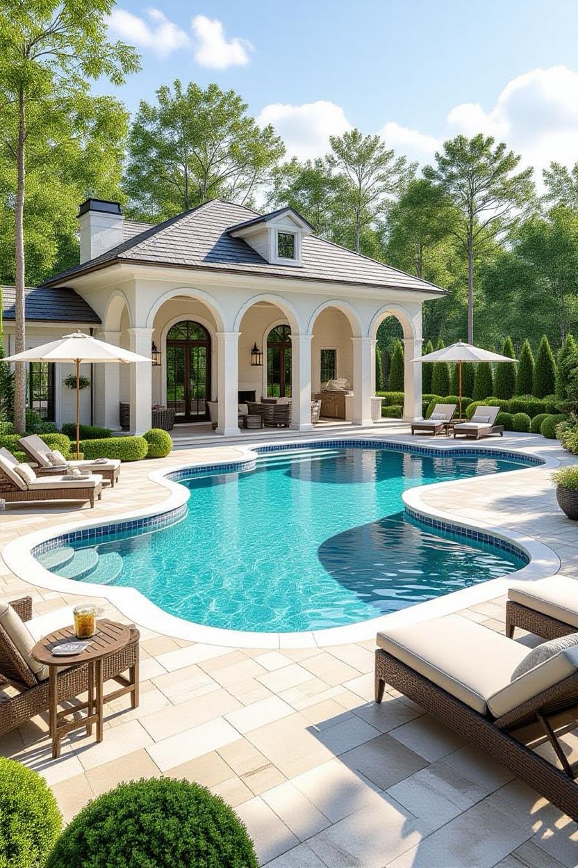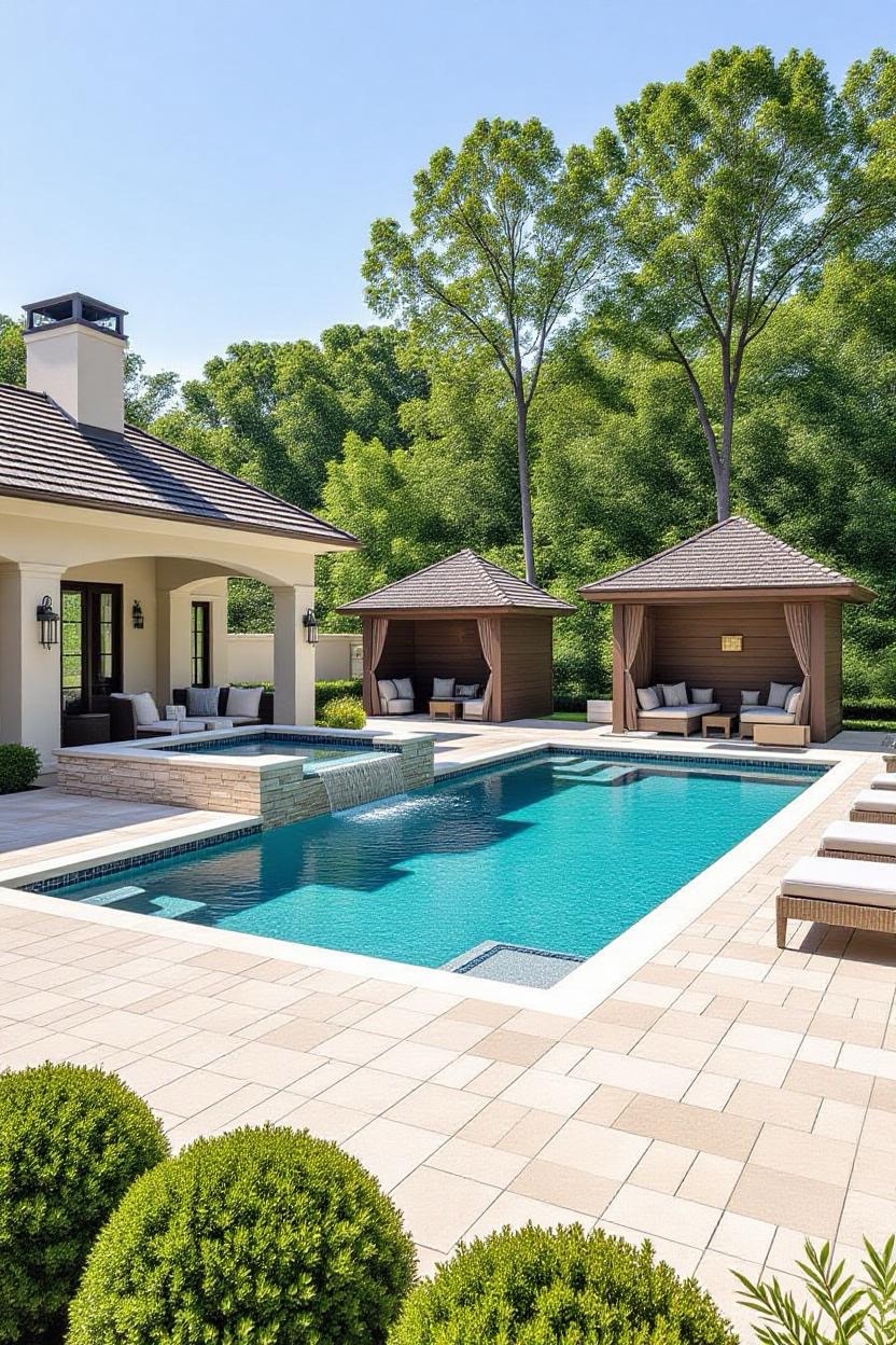 For extra comfort, design your pool alongside a shaded pavilion. This structure provides space for lounging, outdoor dining, or even a poolside kitchen, making the area more versatile.