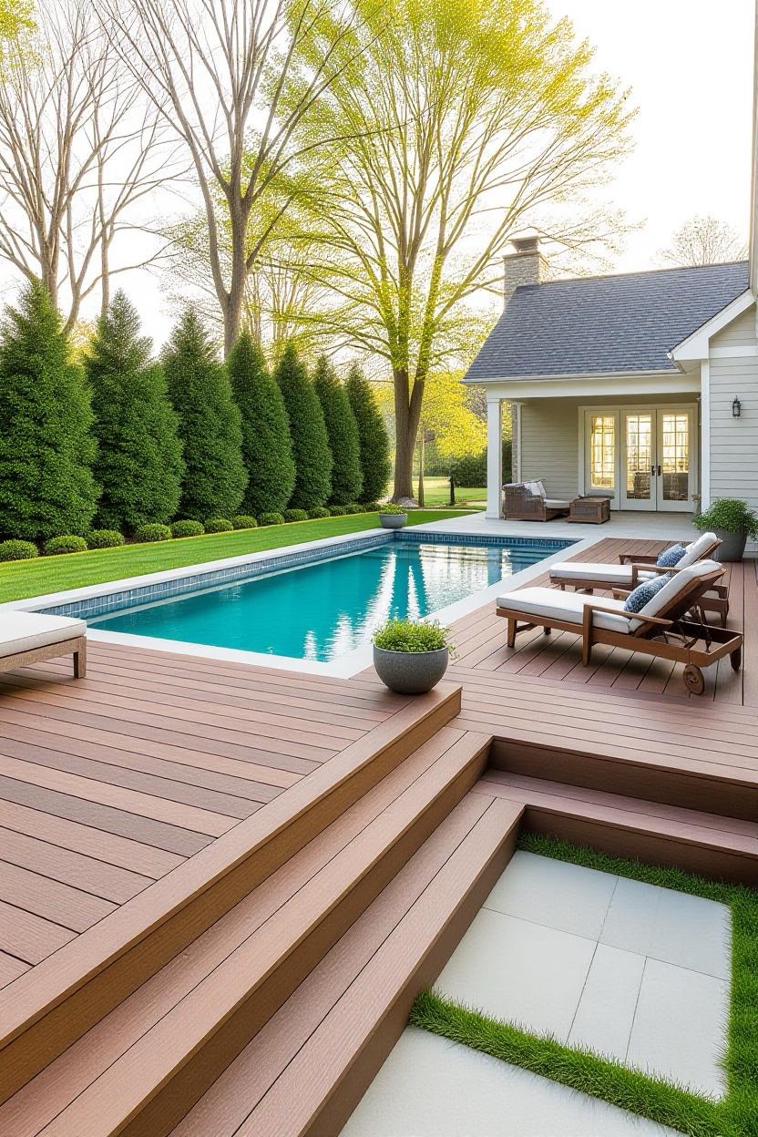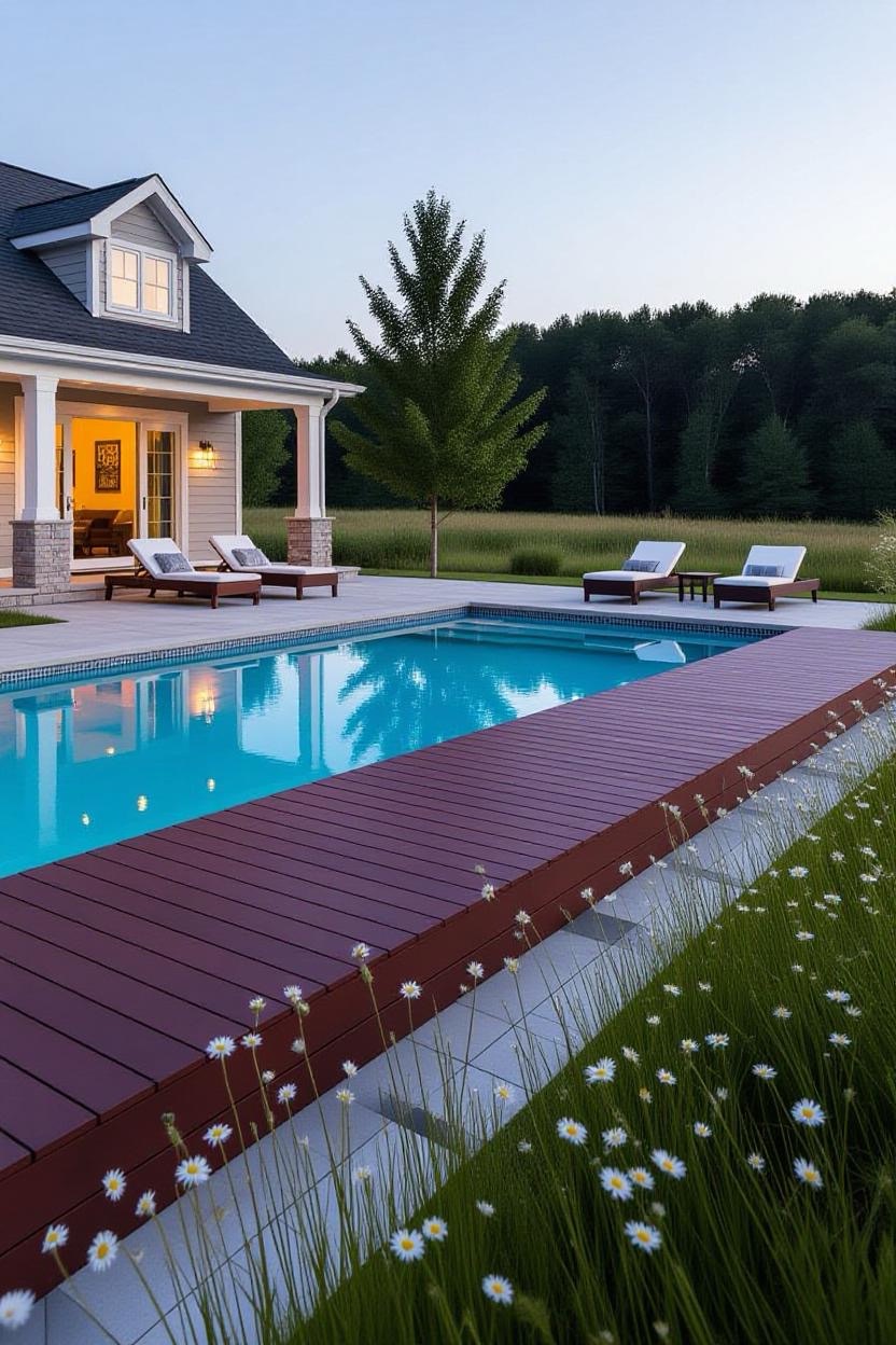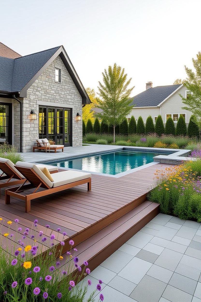 Pair your inground pool with wood decking, stone accents, and countryside-inspired landscaping. This design brings cozy charm and warmth to your backyard while still feeling inviting and stylish.