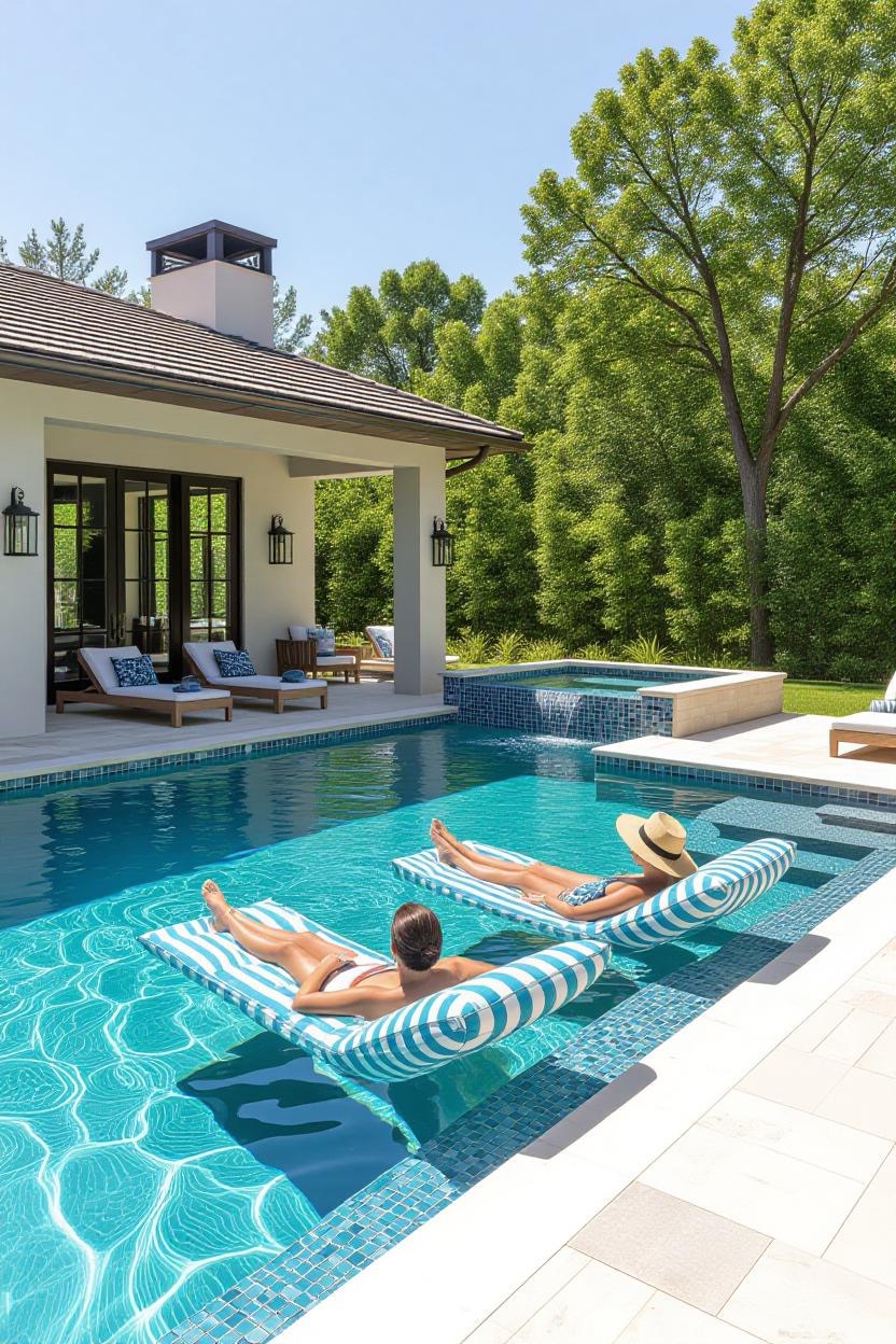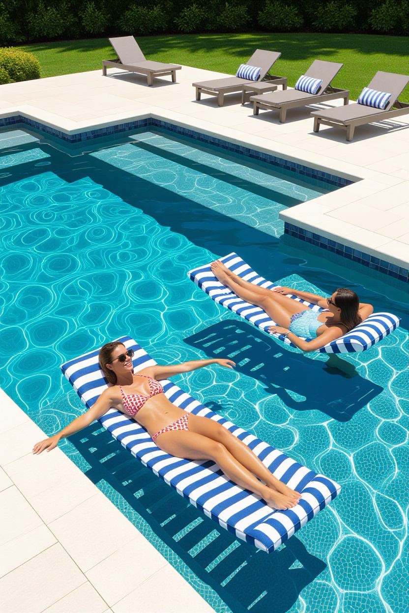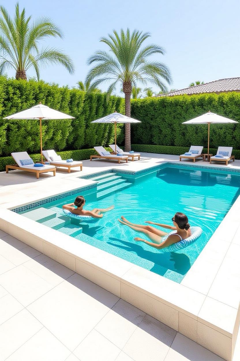 Add a shallow sun shelf to your pool where you can relax on loungers partially submerged in water. It’s the perfect spot to soak up the sun while staying cool.