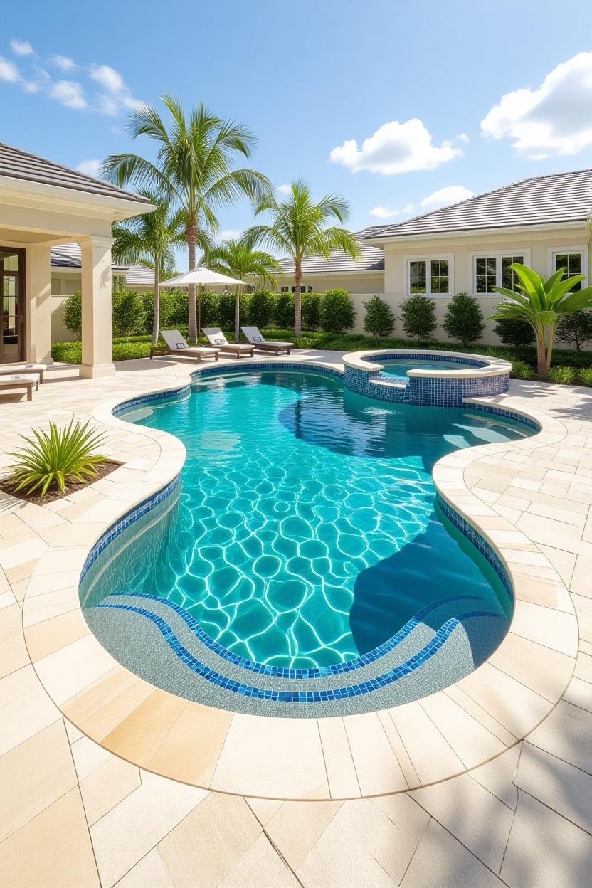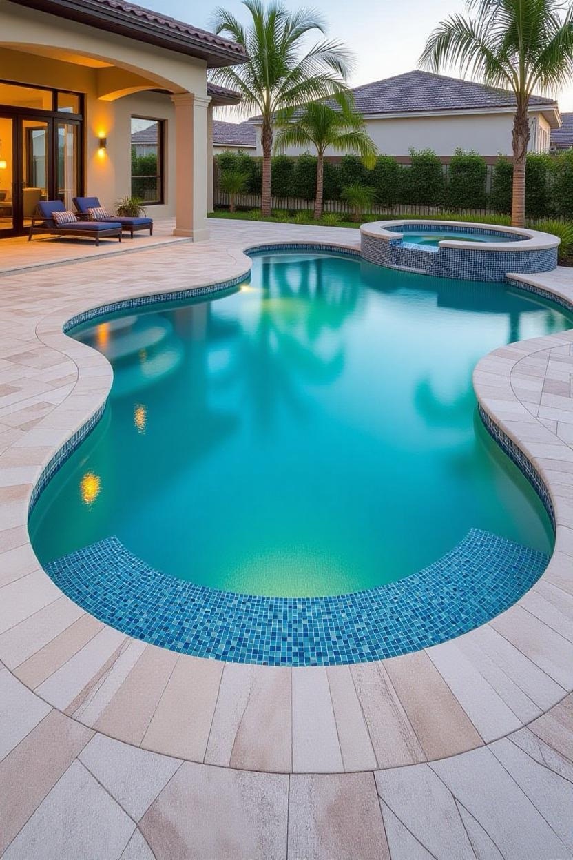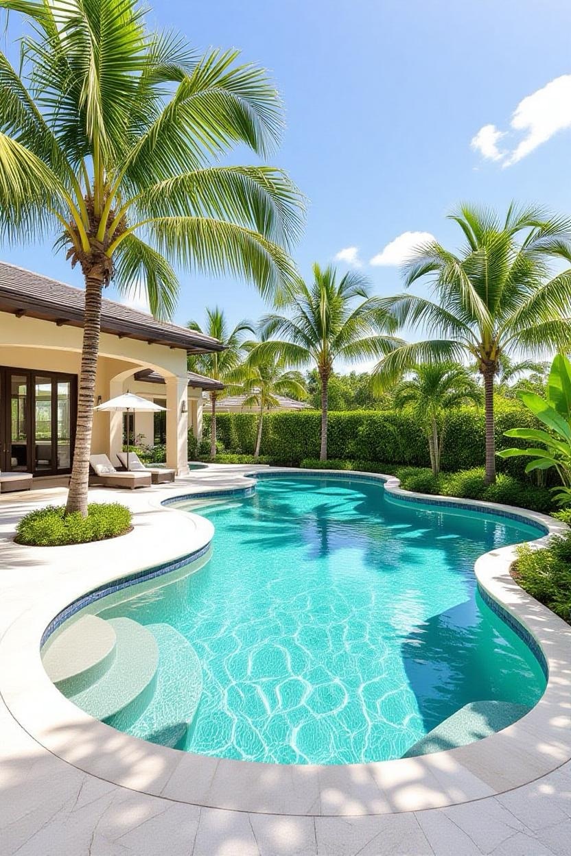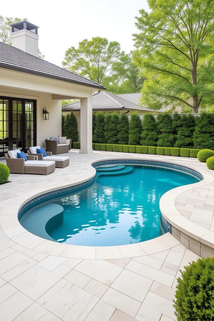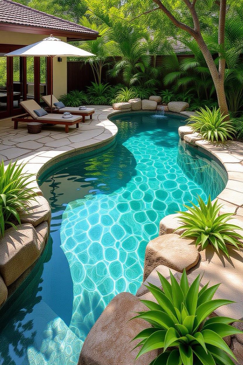 Also called a zero-entry pool, this design mimics the shoreline, gradually sloping into the water instead of using steps. It’s stylish, safe for kids, and adds a unique resort-like touch.