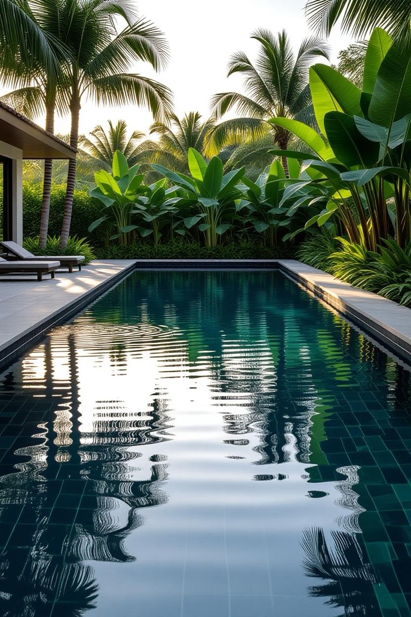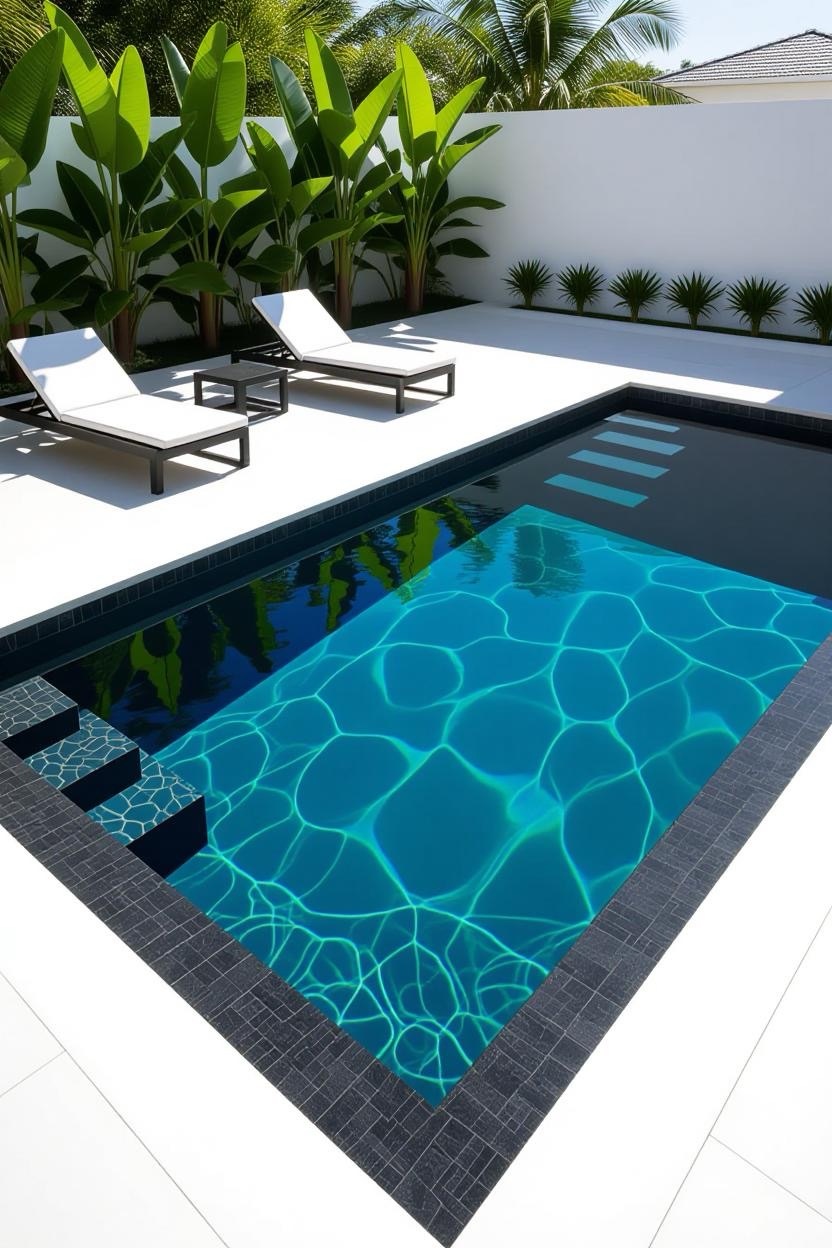 For a bold and dramatic look, opt for a black-bottom inground pool. The dark finish creates mirror-like reflections and a sleek, edgy appeal perfect for contemporary homes.