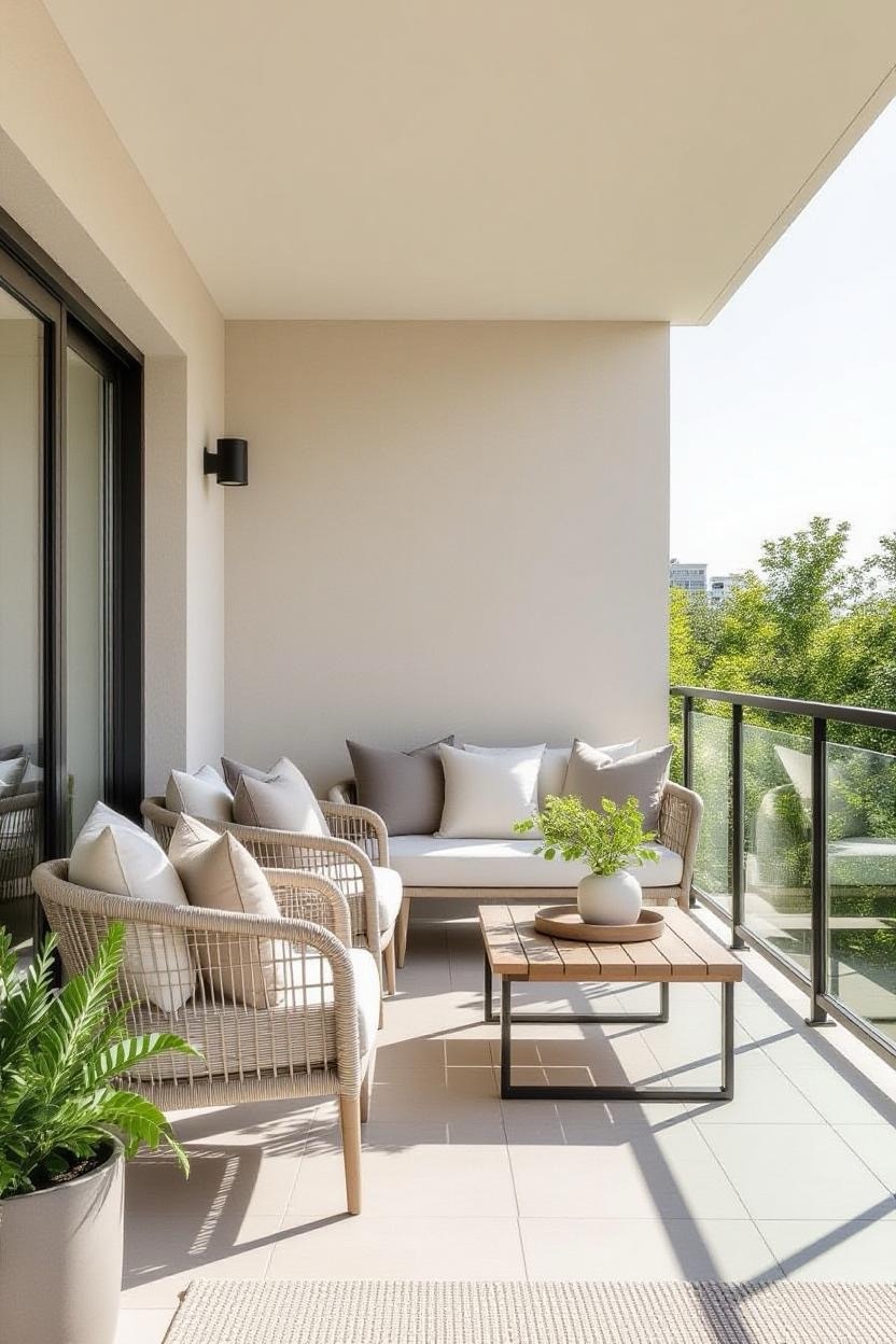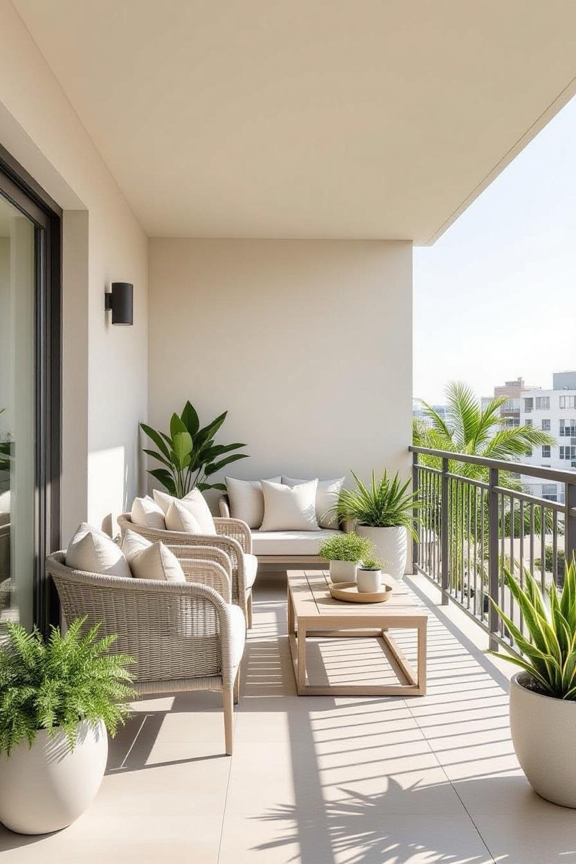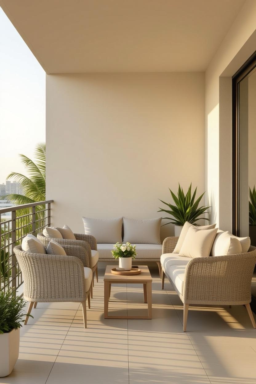 A modern balcony thrives on simplicity. Stick to neutral shades like beige, gray, and white for your seating and flooring, complemented by sleek, simple furniture. This look keeps your balcony airy, uncluttered, and timelessly elegant.