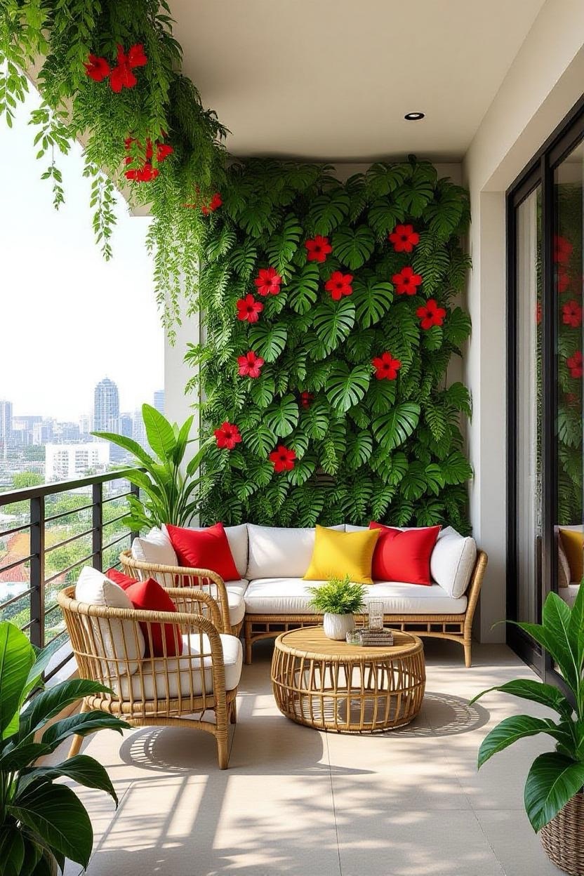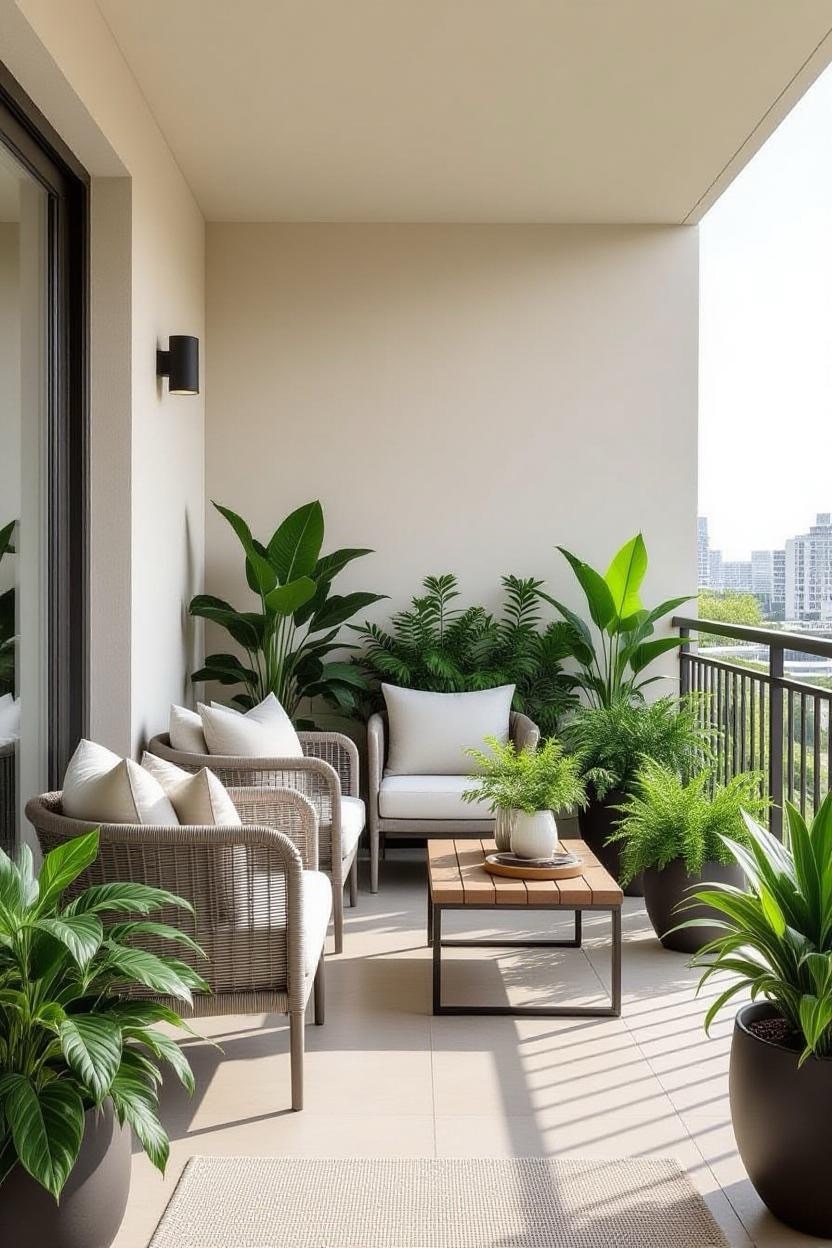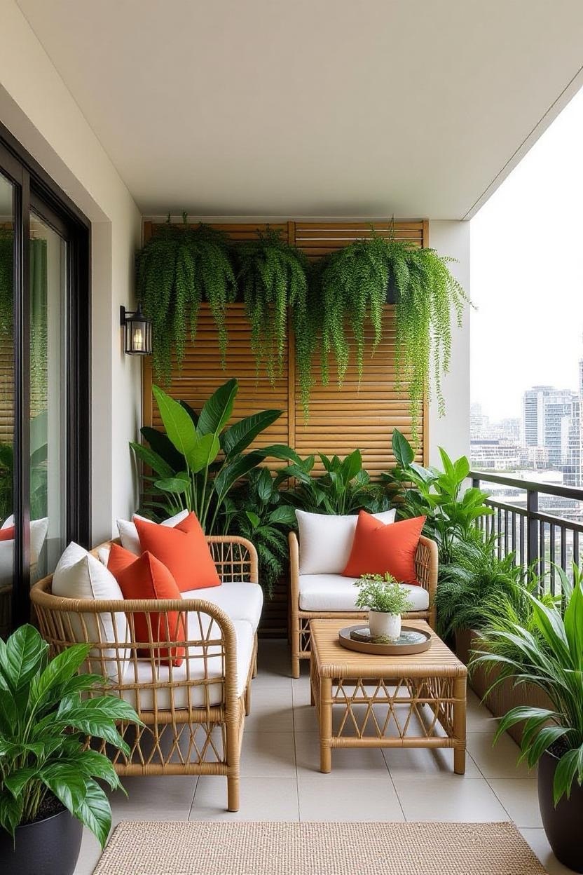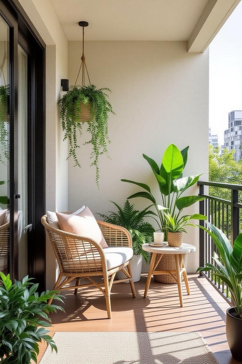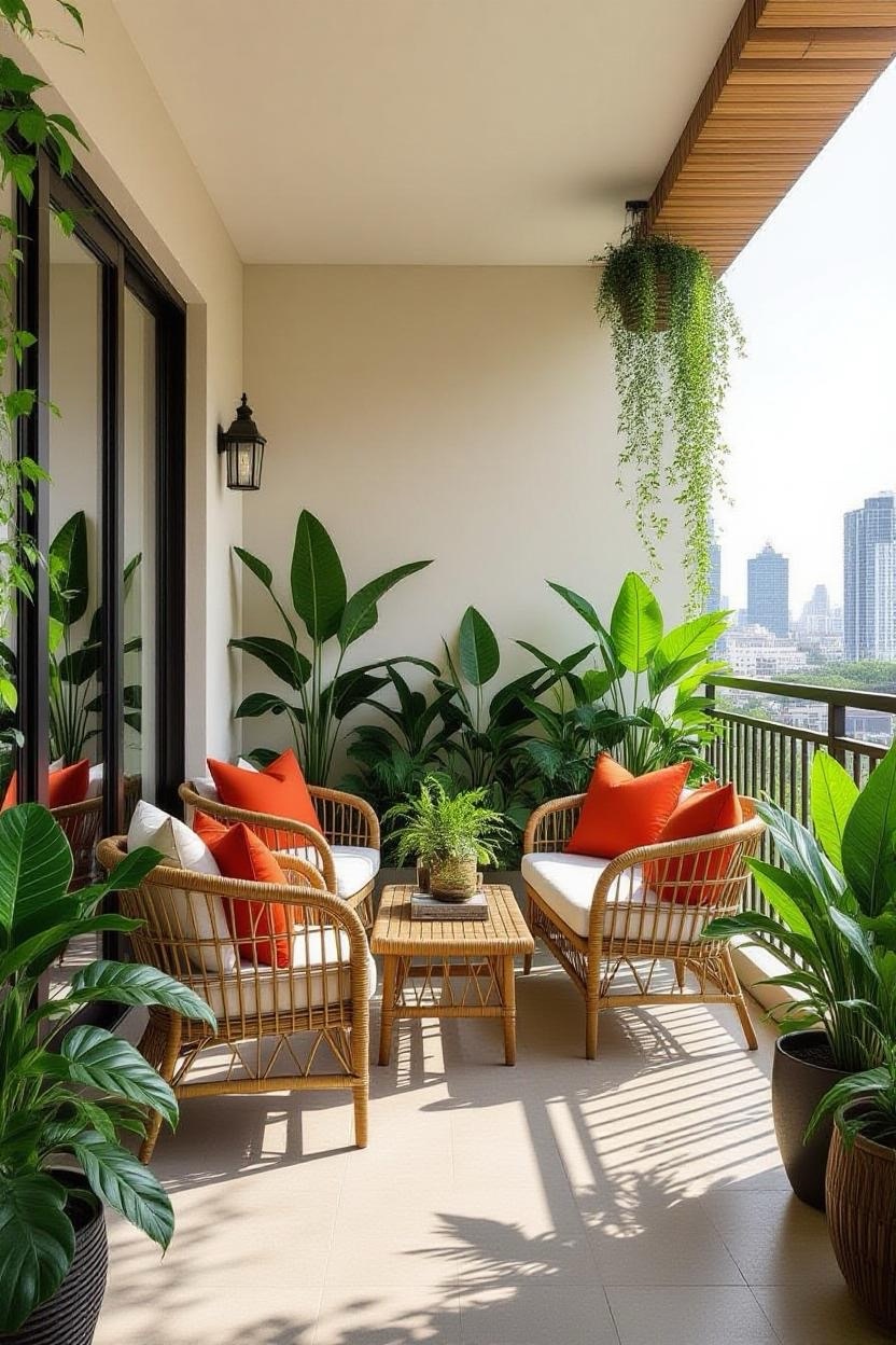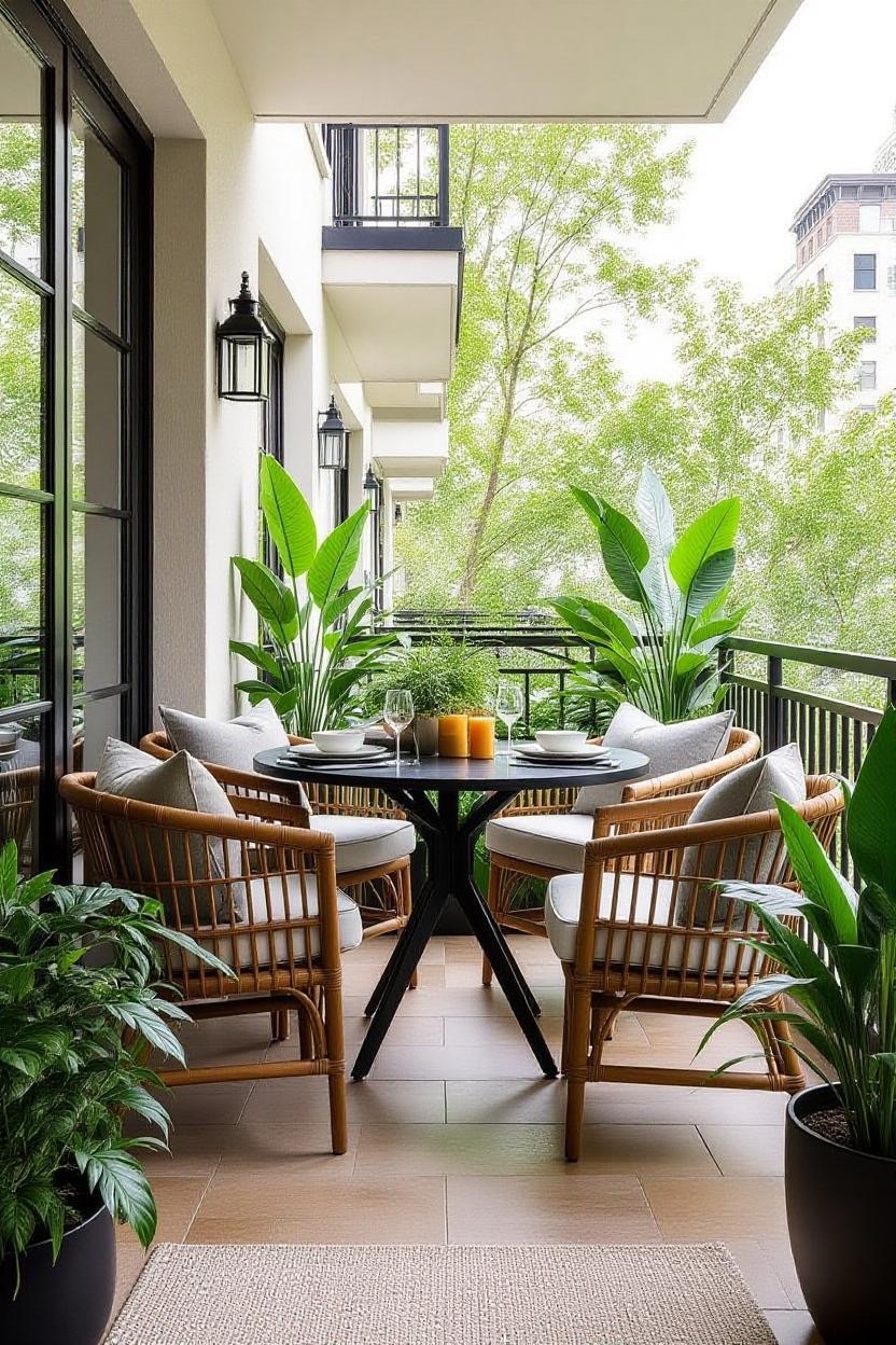 Go big with tropical plants, leafy vines, and bamboo furniture. This balcony theme works especially well in urban apartments, creating an oasis away from the city’s hustle.