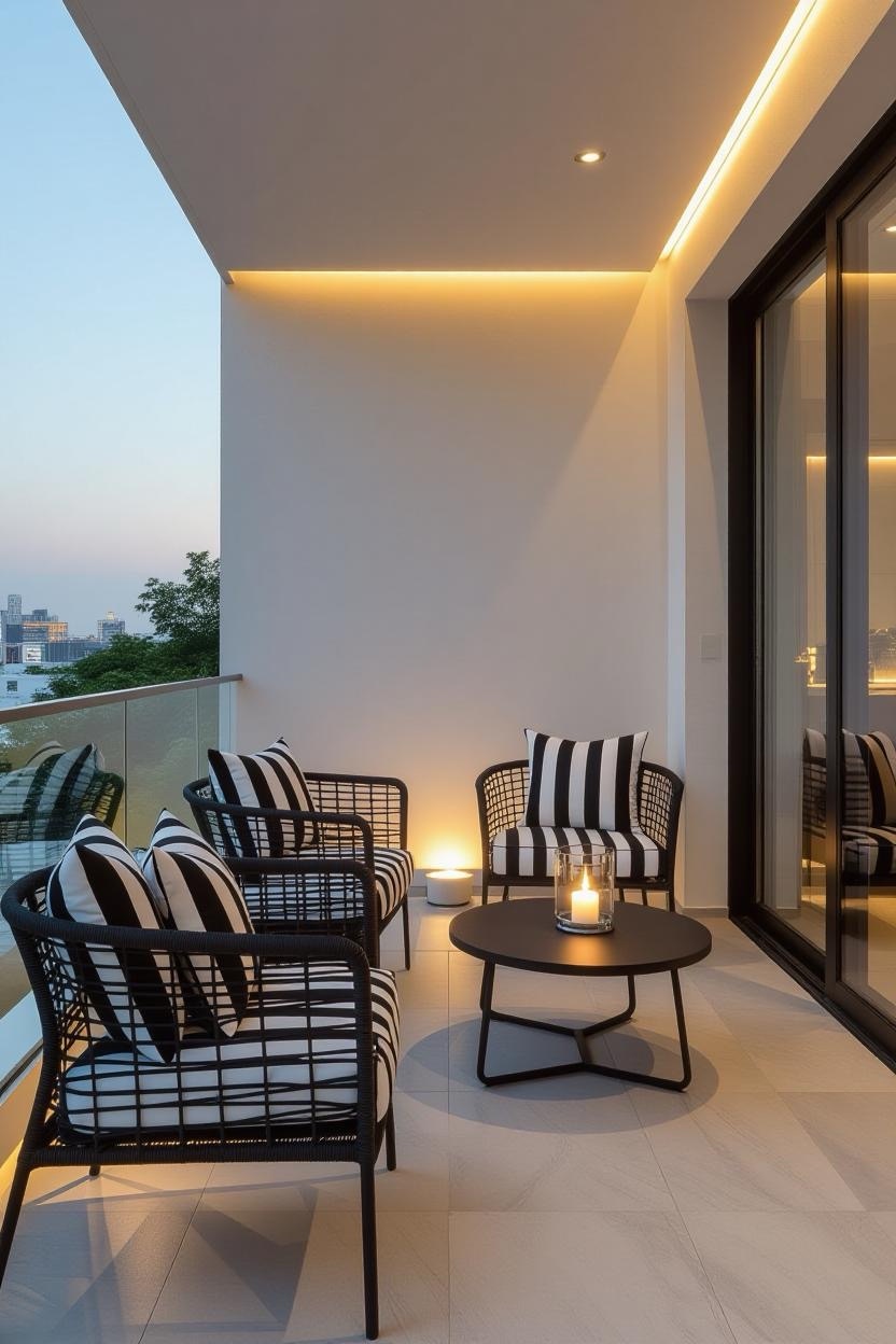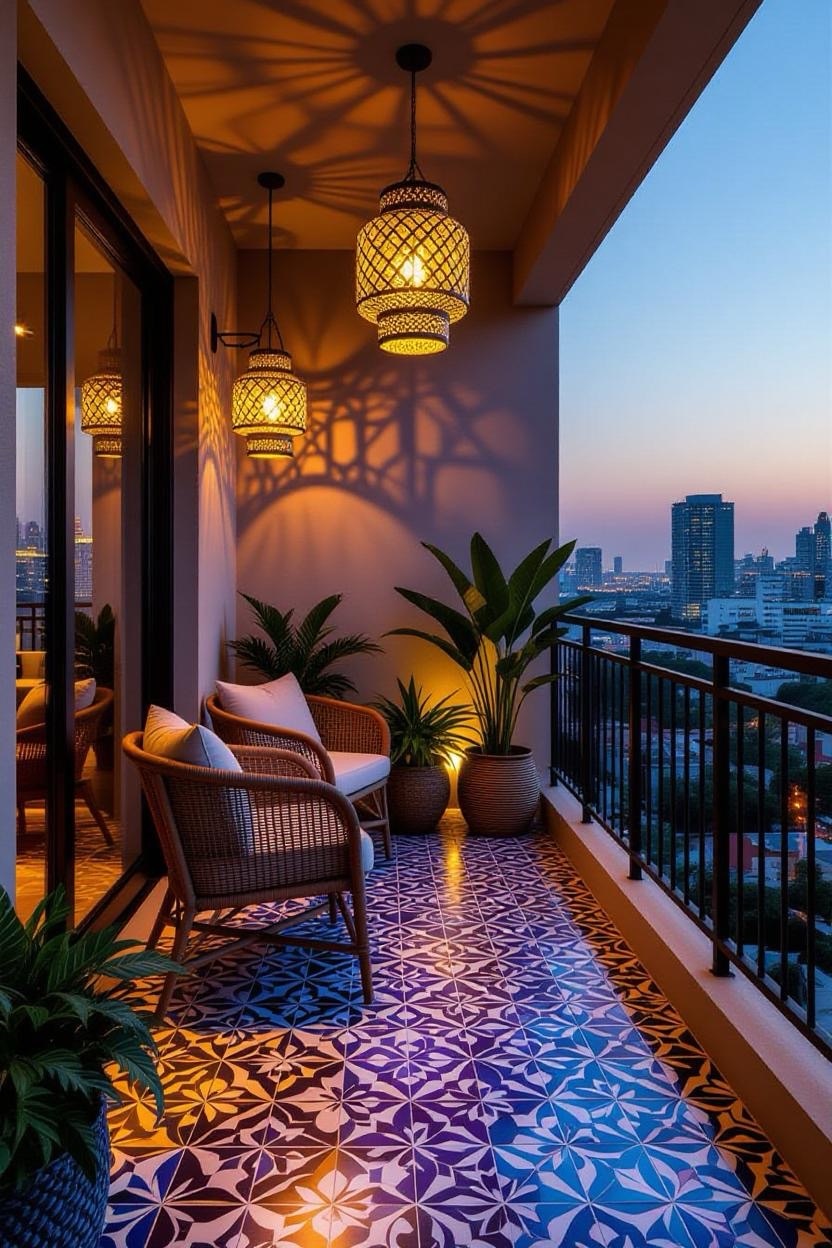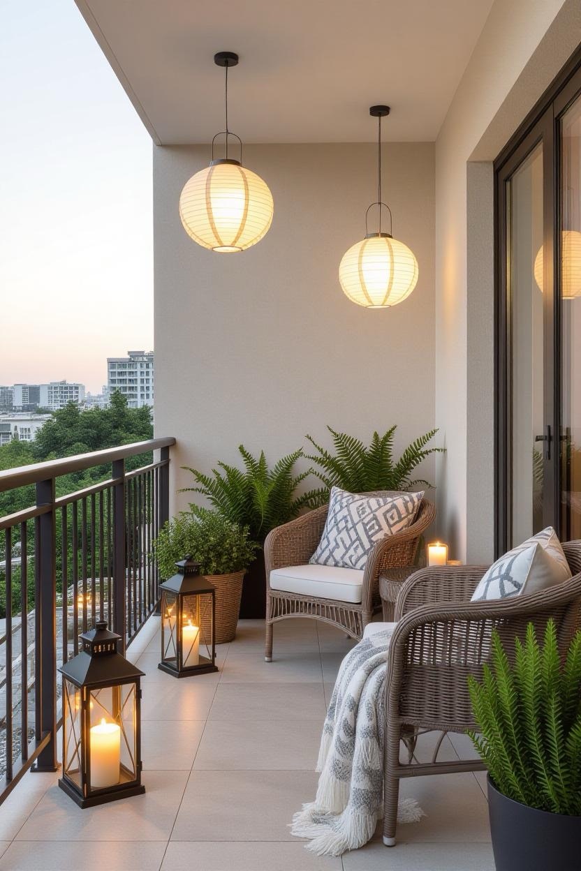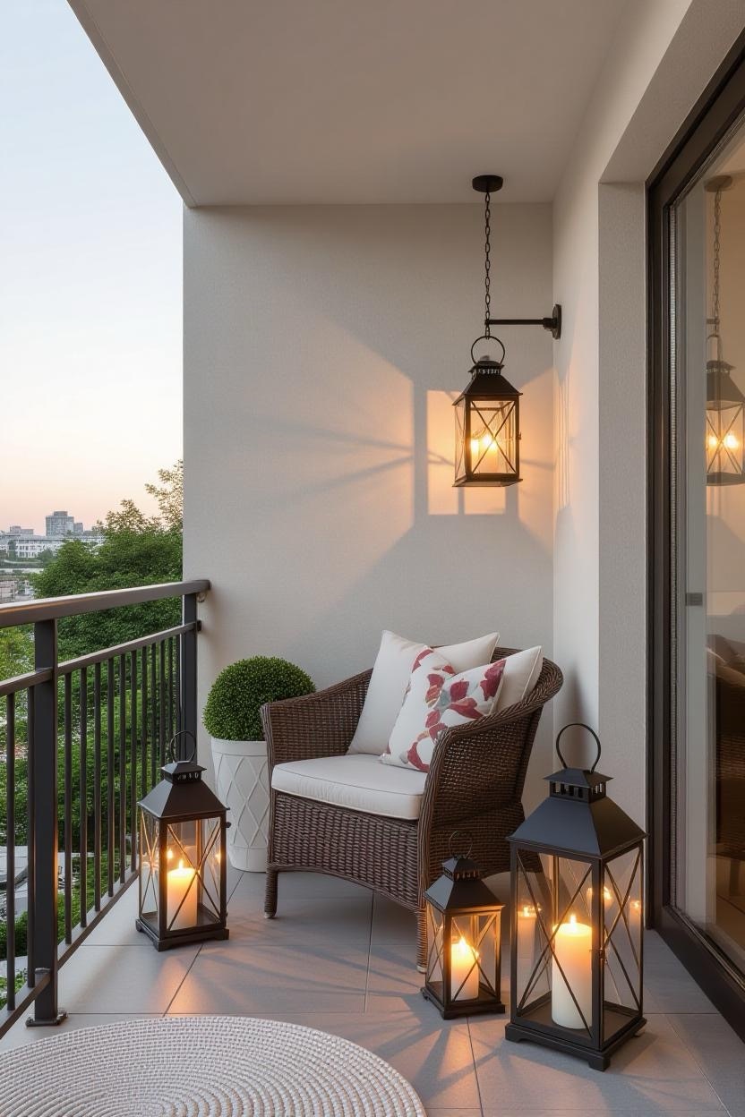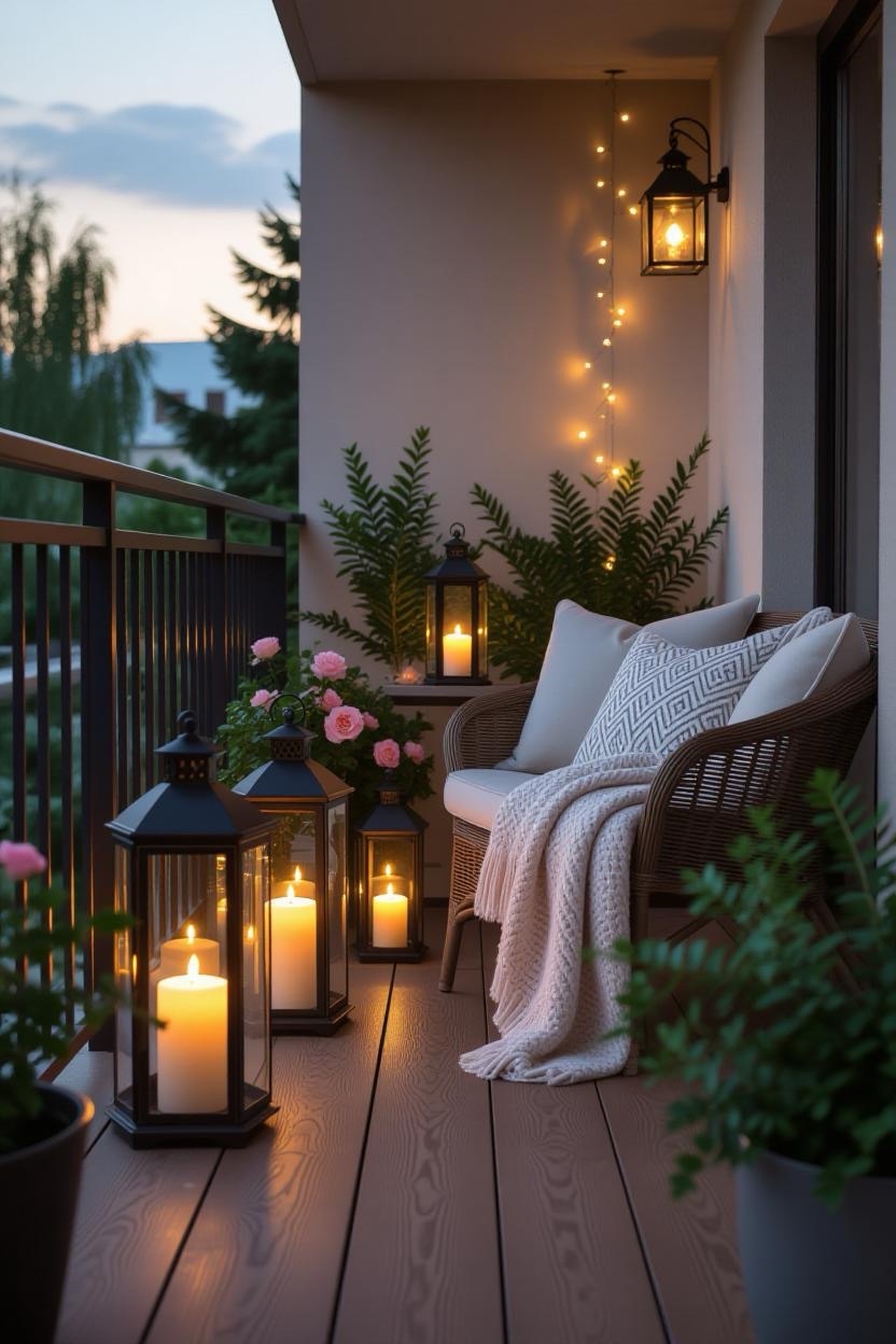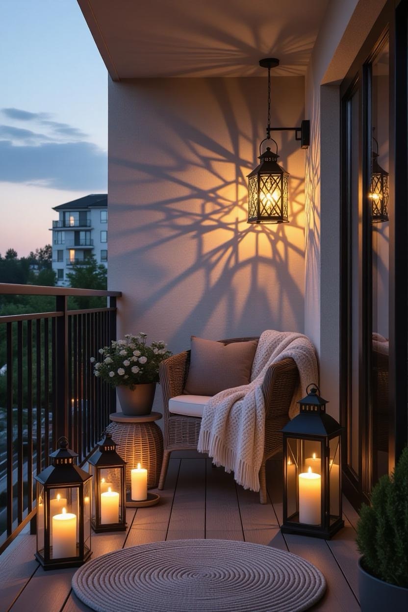 Place lanterns or LED candles around your balcony to create a soft, romantic glow. Lighting transforms even the simplest balcony into a magical, intimate space.