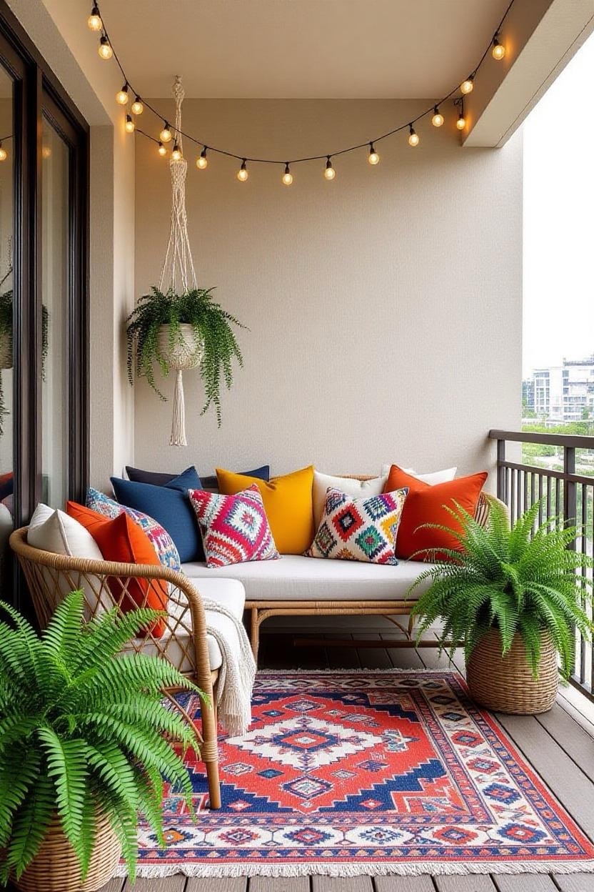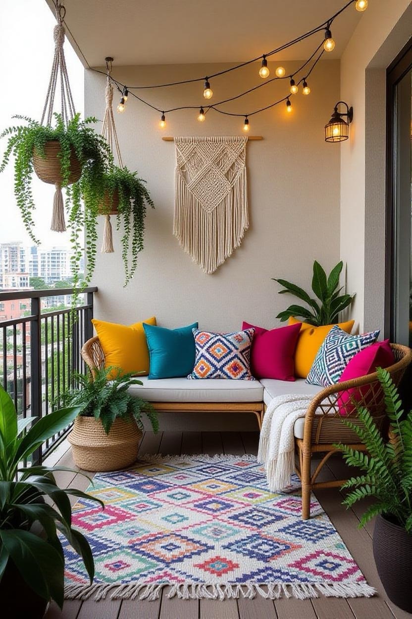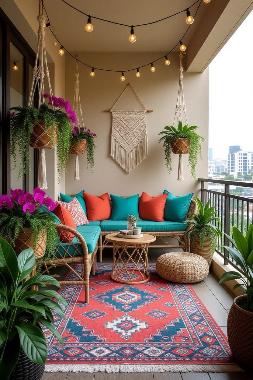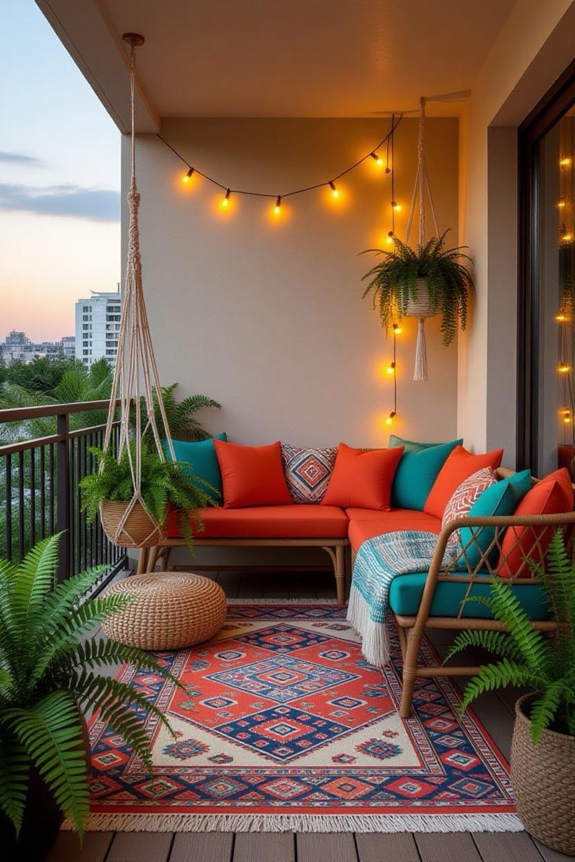 Layer your balcony with patterned rugs, colorful cushions, and macramé plant hangers for a warm bohemian vibe. Add string lights, and your balcony transforms into a dreamy retreat perfect for relaxed evenings.