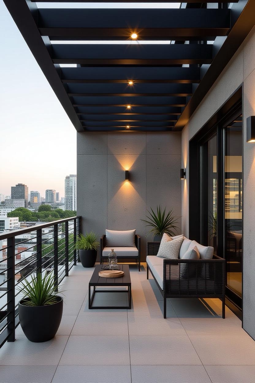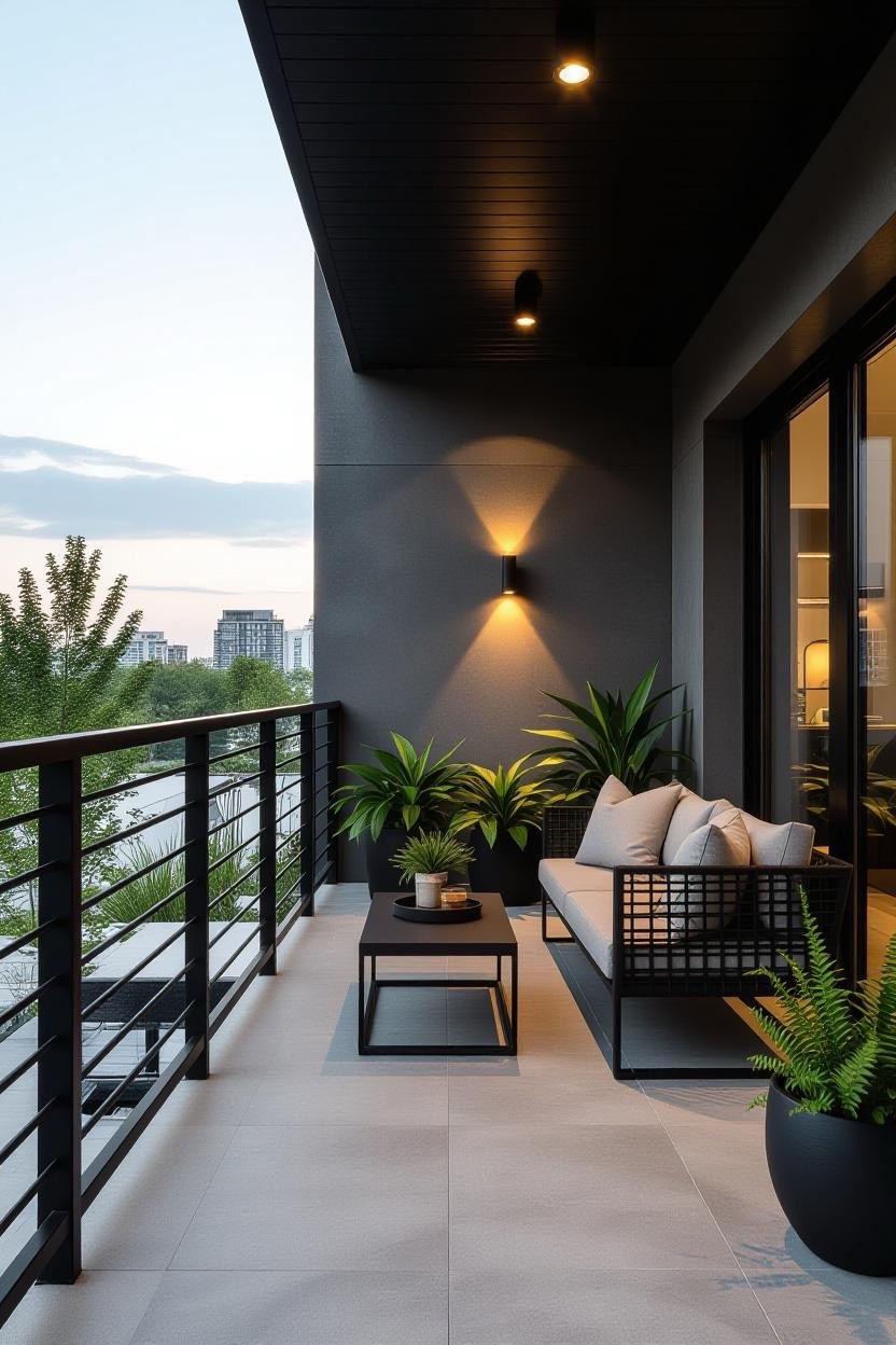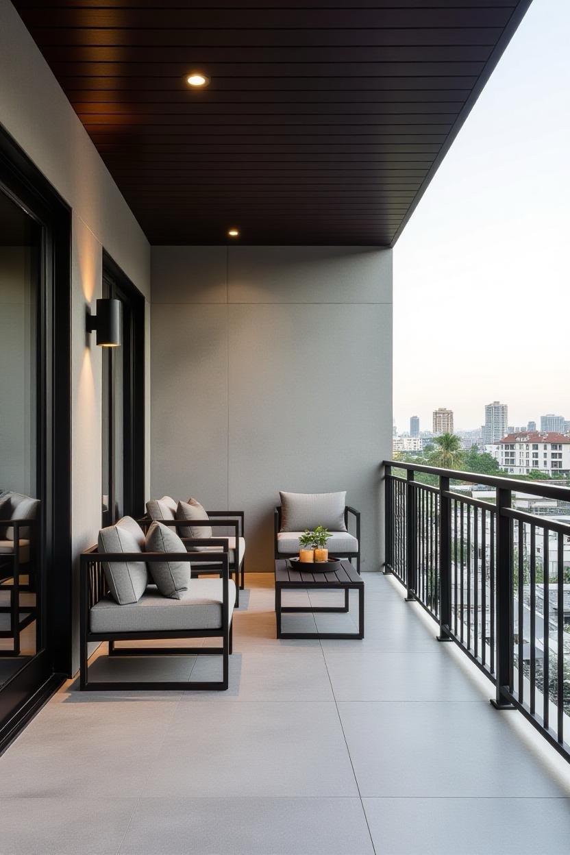 Opt for black metal railings, concrete flooring, and simple furniture to give your balcony an industrial edge. Pair this with warm-toned lighting for a balanced and modern aesthetic.