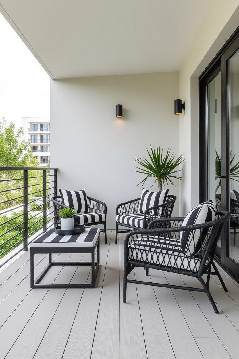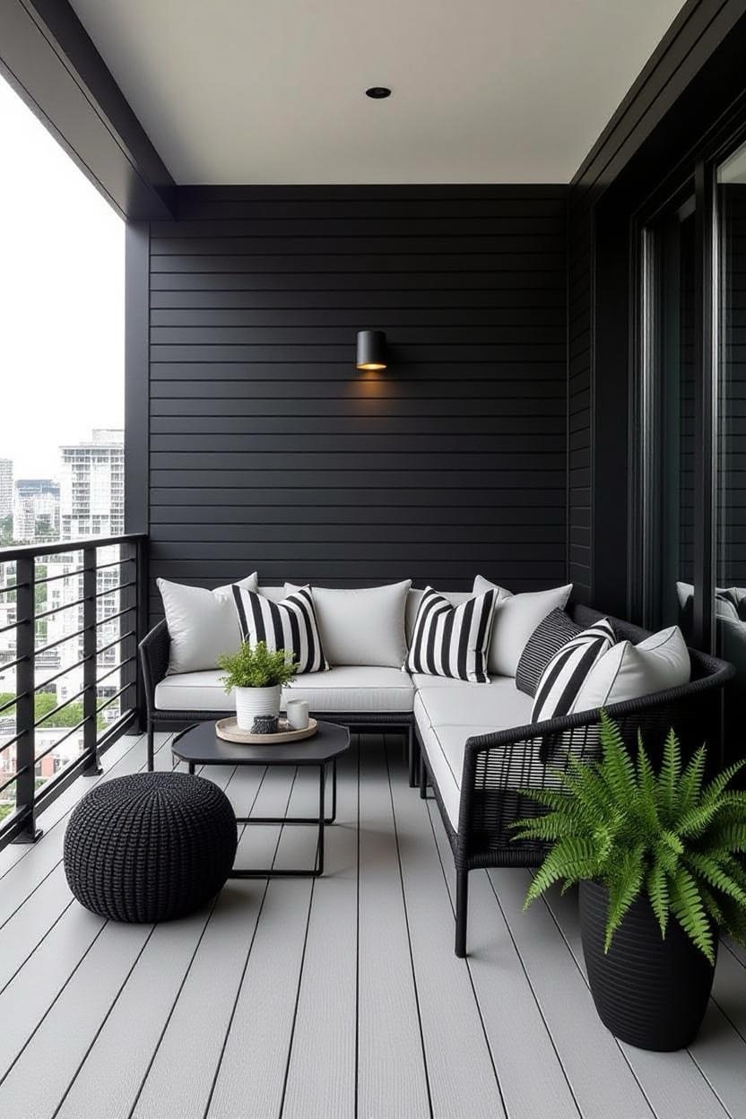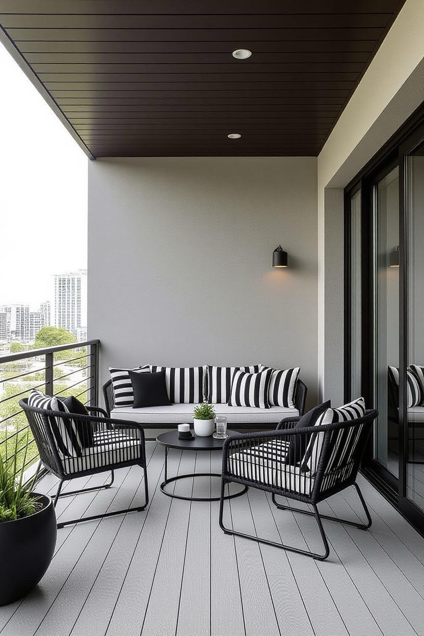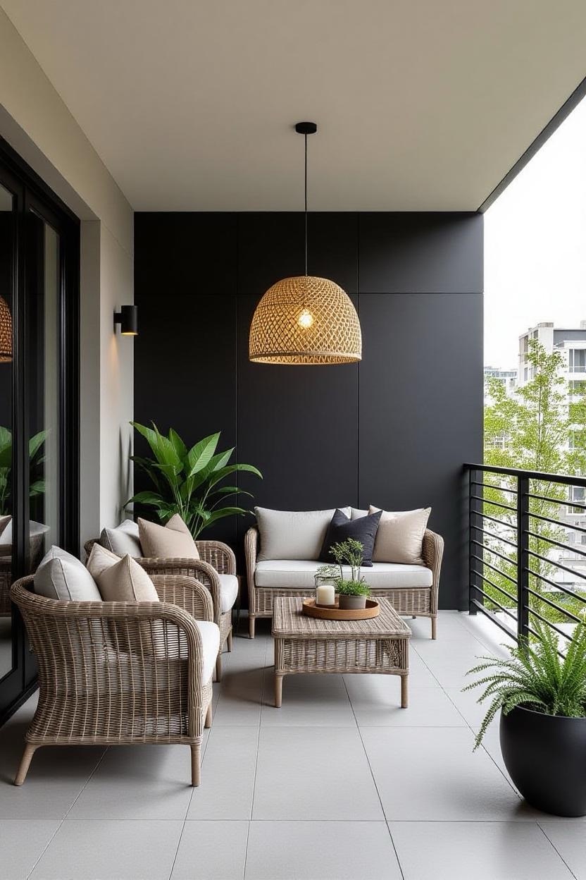 Opt for black metal railings, concrete flooring, and simple furniture to give your balcony an industrial edge. Pair this with warm-toned lighting for a balanced and modern aesthetic.