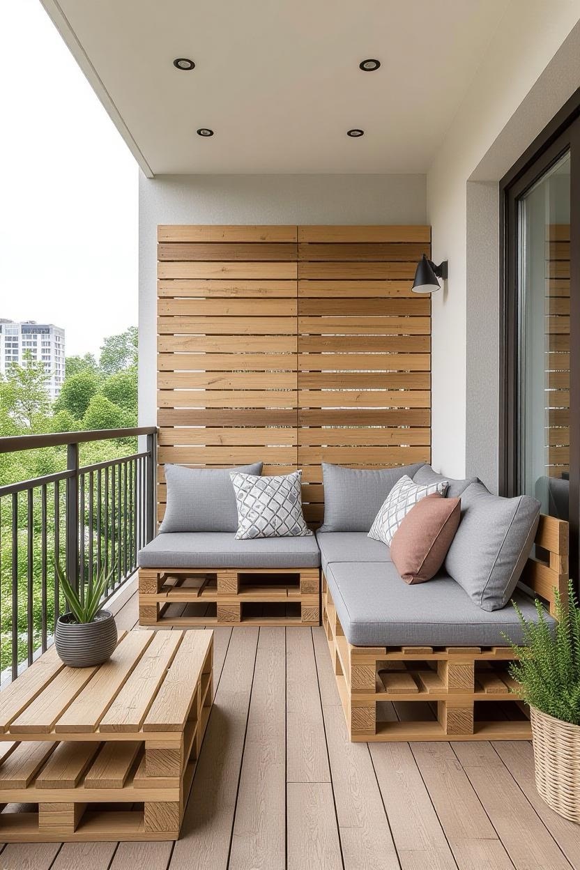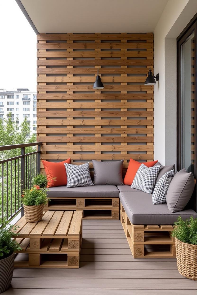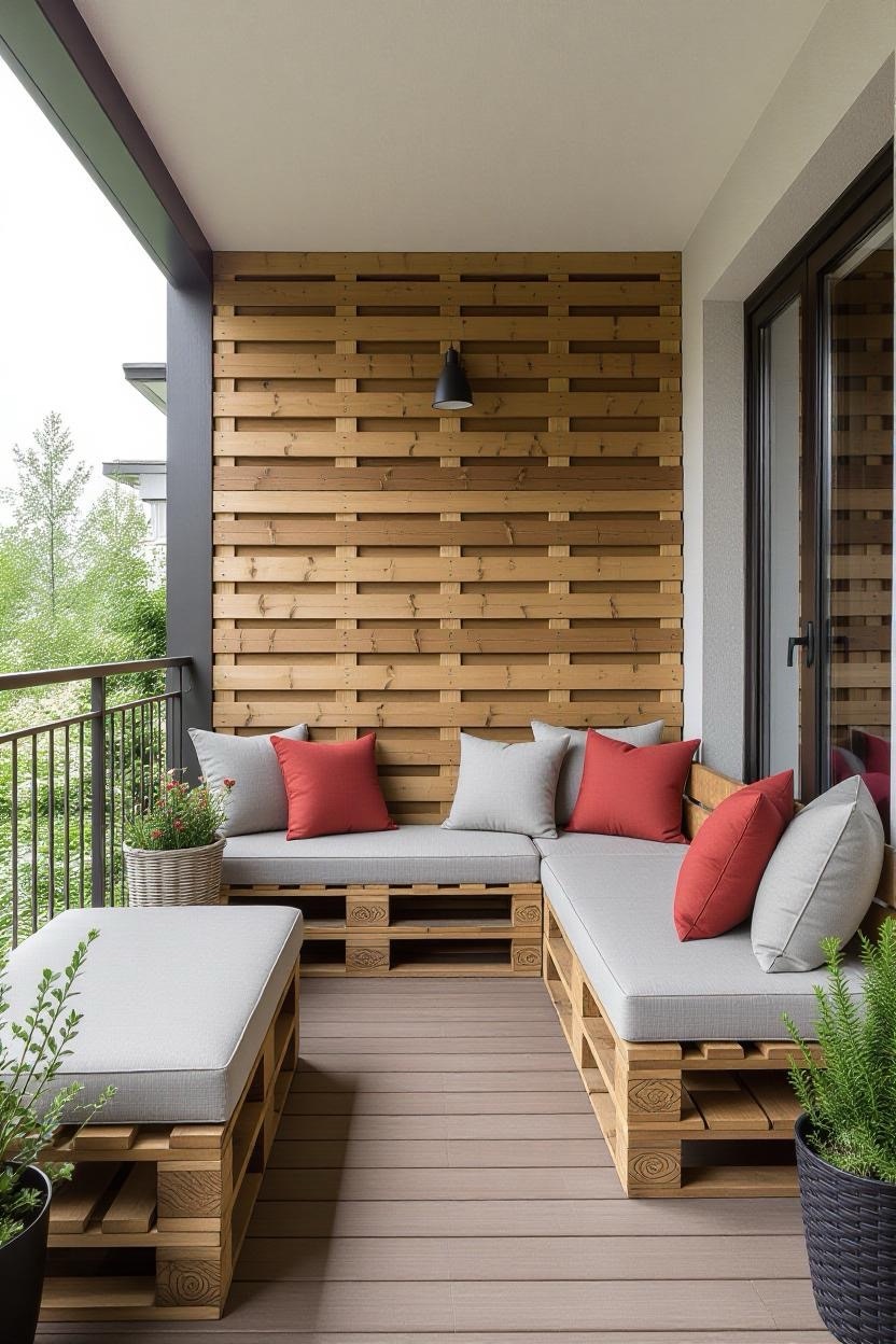 Use wooden pallets or rustic planks for flooring and seating. Add earthy-toned cushions for a cozy, countryside-inspired balcony retreat.