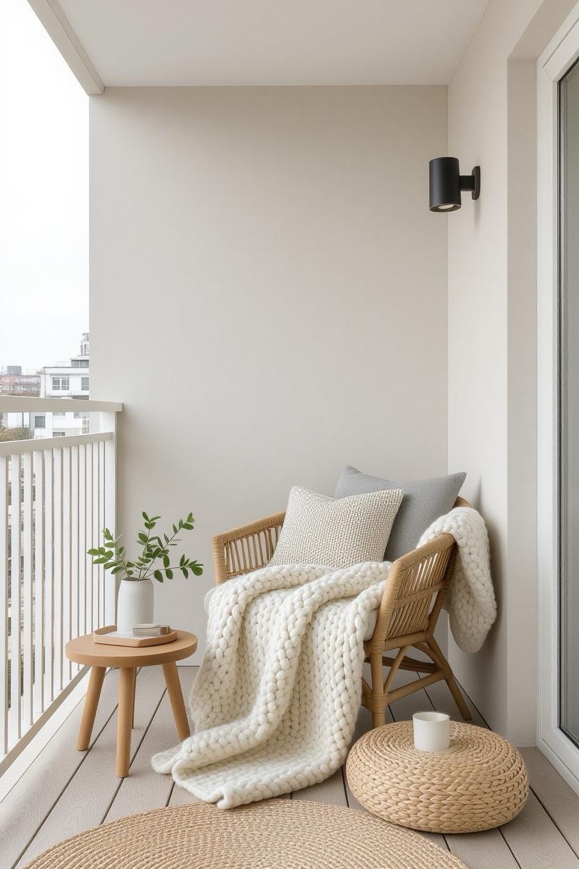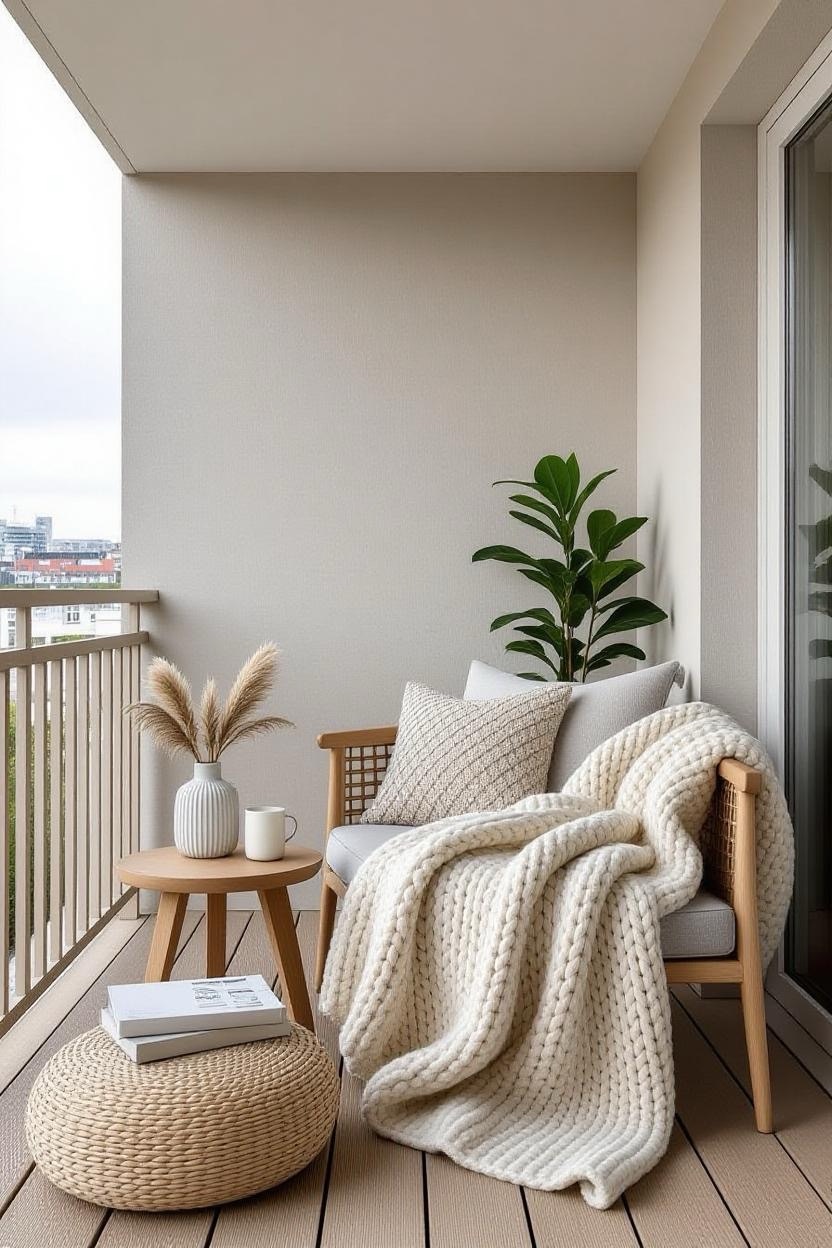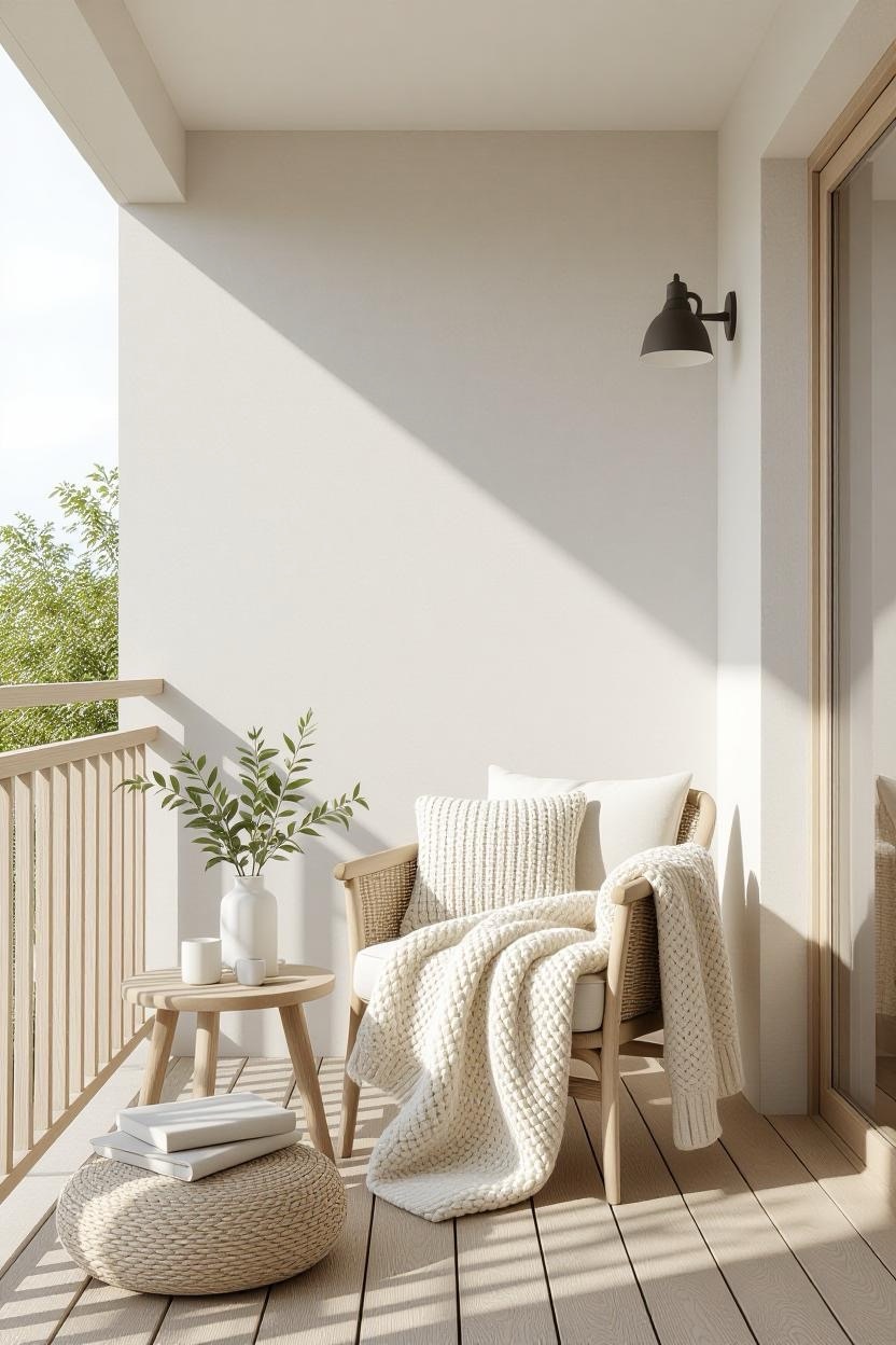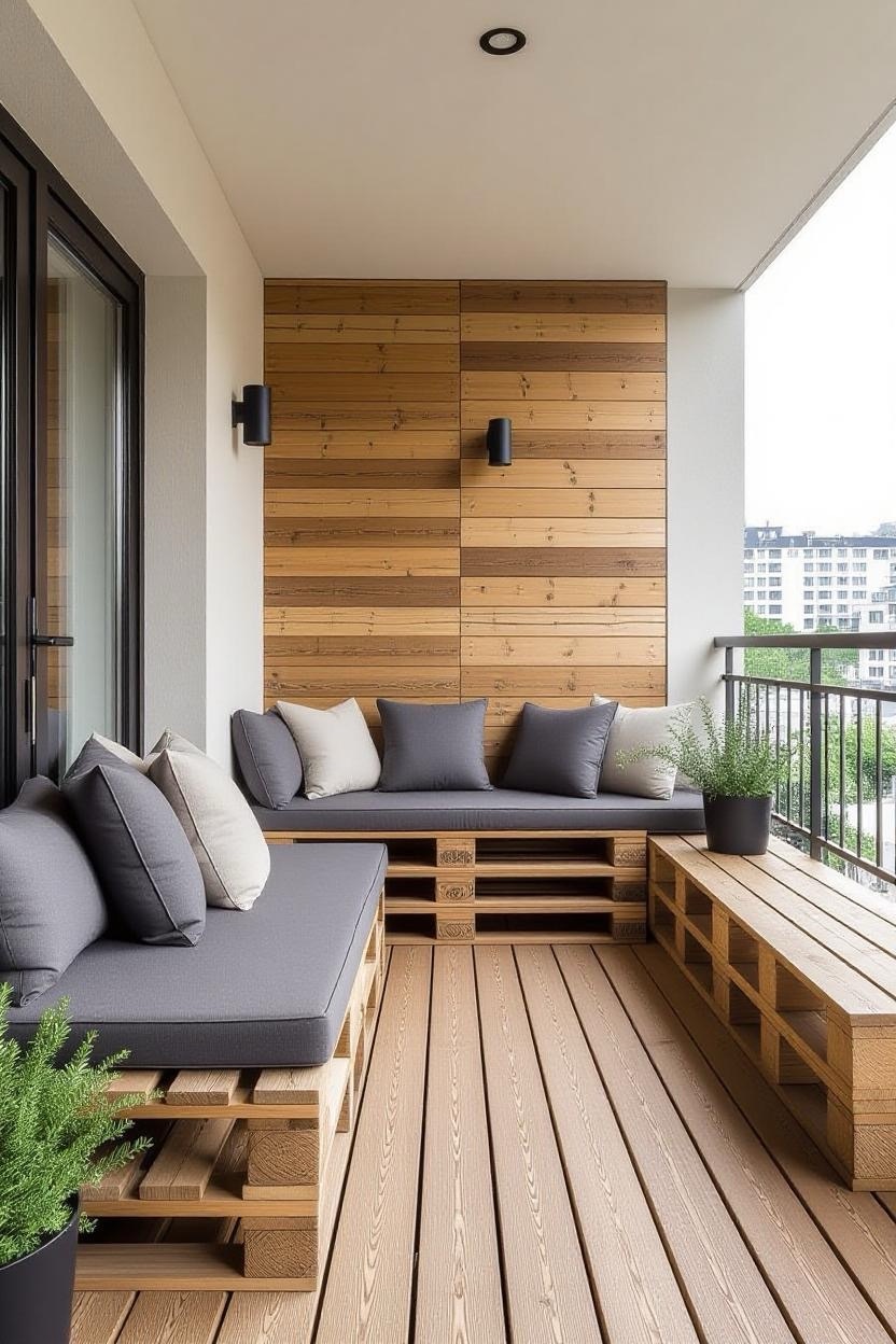 Use wooden pallets or rustic planks for flooring and seating. Add earthy-toned cushions for a cozy, countryside-inspired balcony retreat.