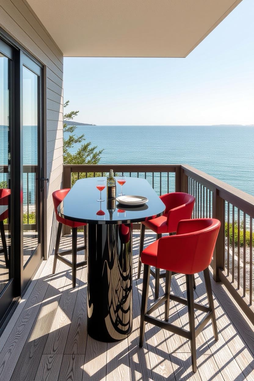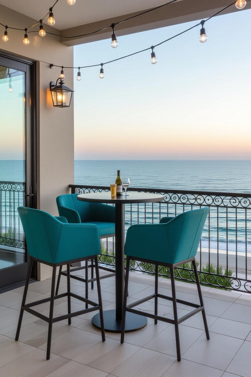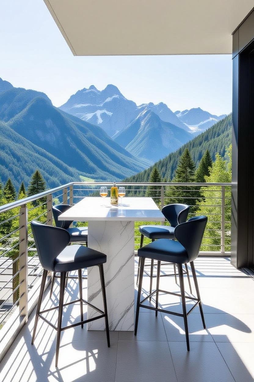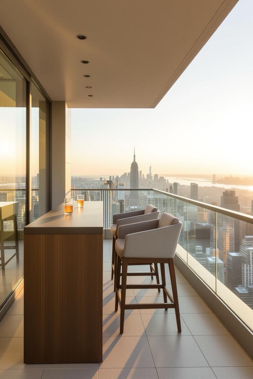 If you love hosting, turn your balcony into a chic bar corner. A narrow bar table against the railing with bar stools makes the perfect spot for sipping cocktails while enjoying the view.