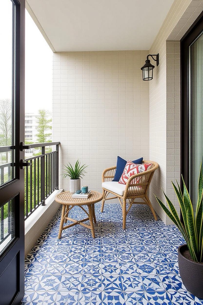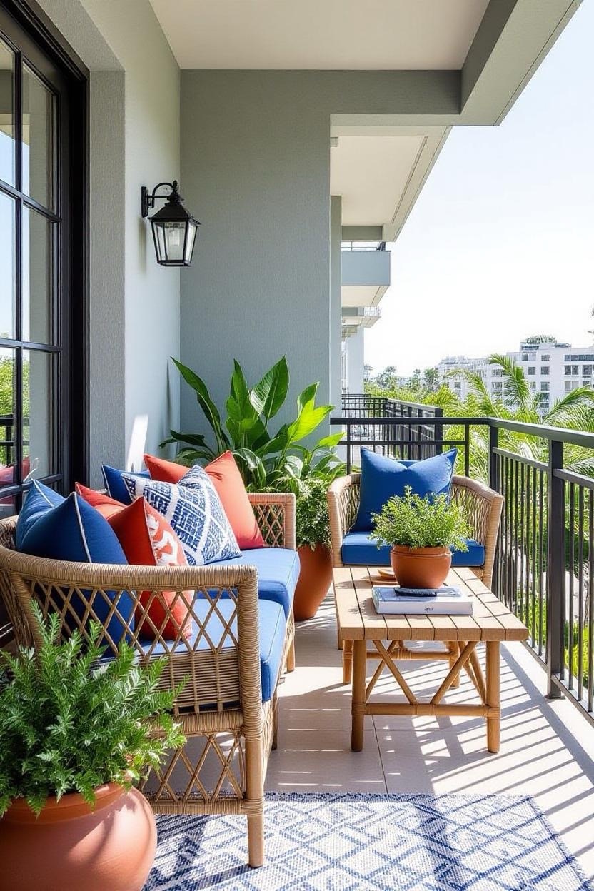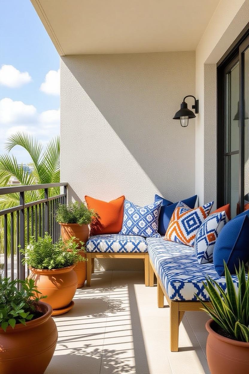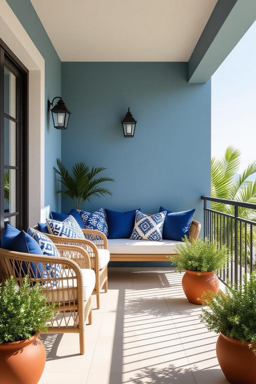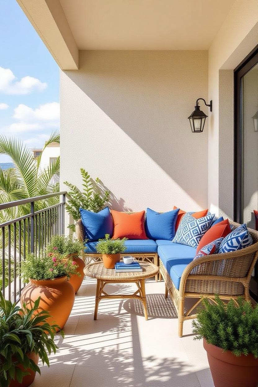 Incorporate terracotta pots, blue accents, and patterned cushions for a Mediterranean-style balcony. This setup feels sunny, vibrant, and vacation-worthy.