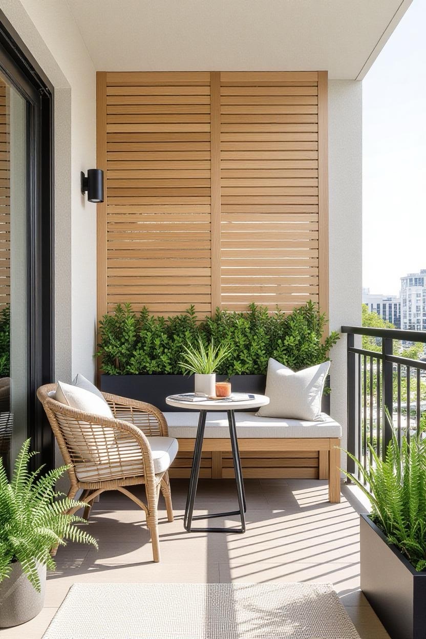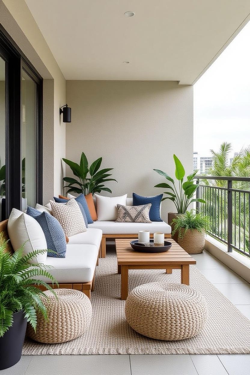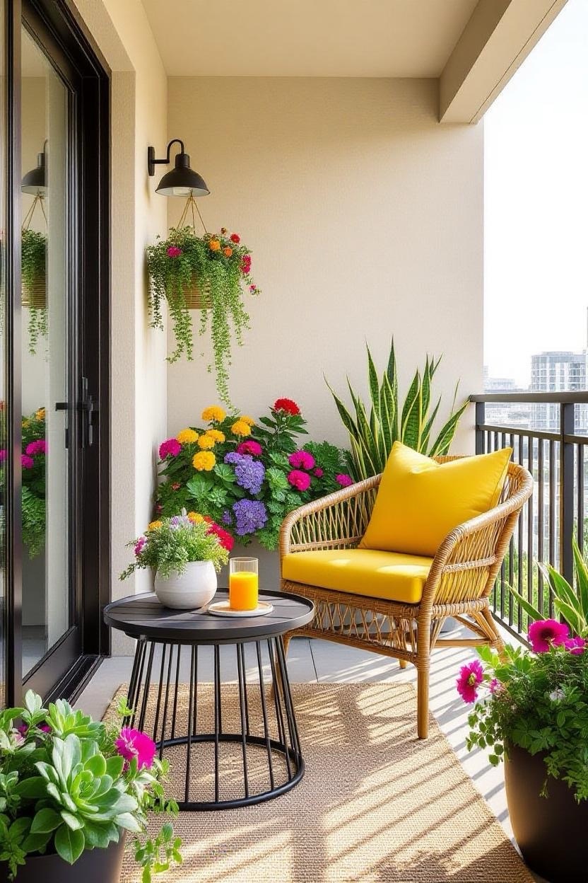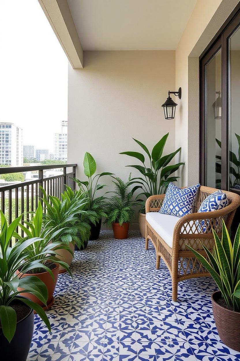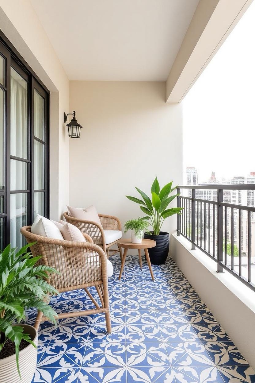 Incorporate terracotta pots, blue accents, and patterned cushions for a Mediterranean-style balcony. This setup feels sunny, vibrant, and vacation-worthy.