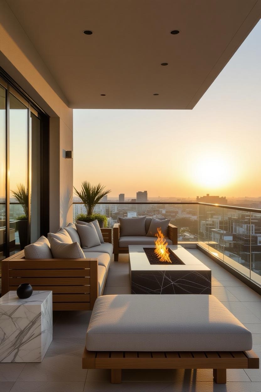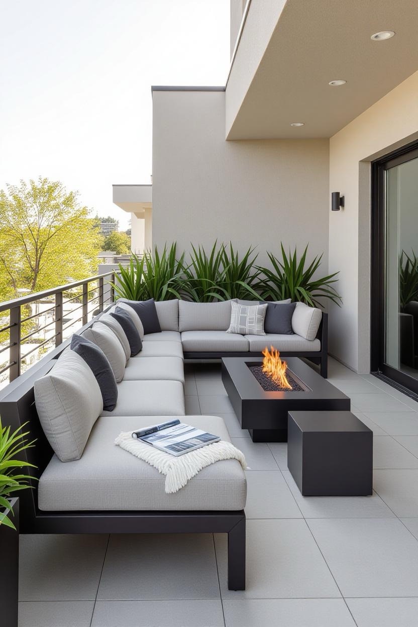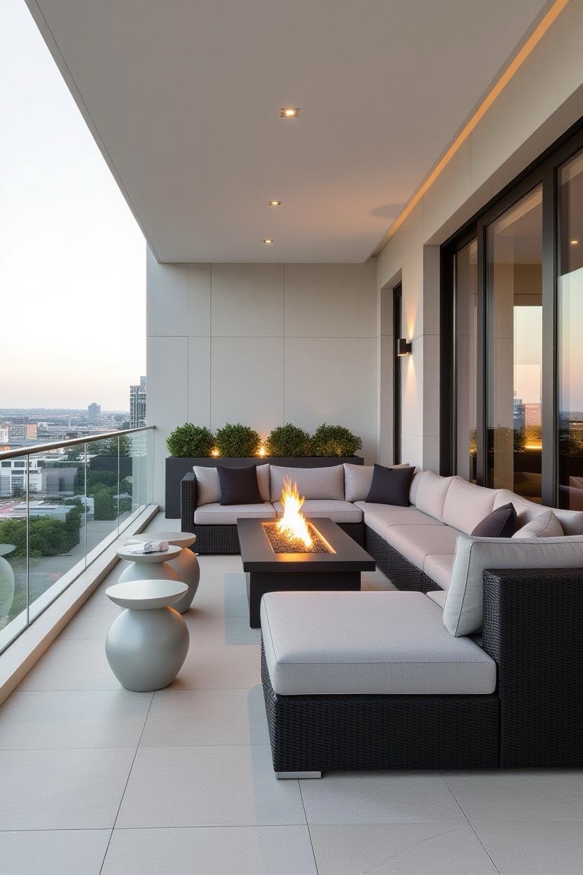 If space and budget allow, go bold with a stylish outdoor sofa, sleek side tables, and a fire pit. This design transforms your balcony into a luxurious private lounge.