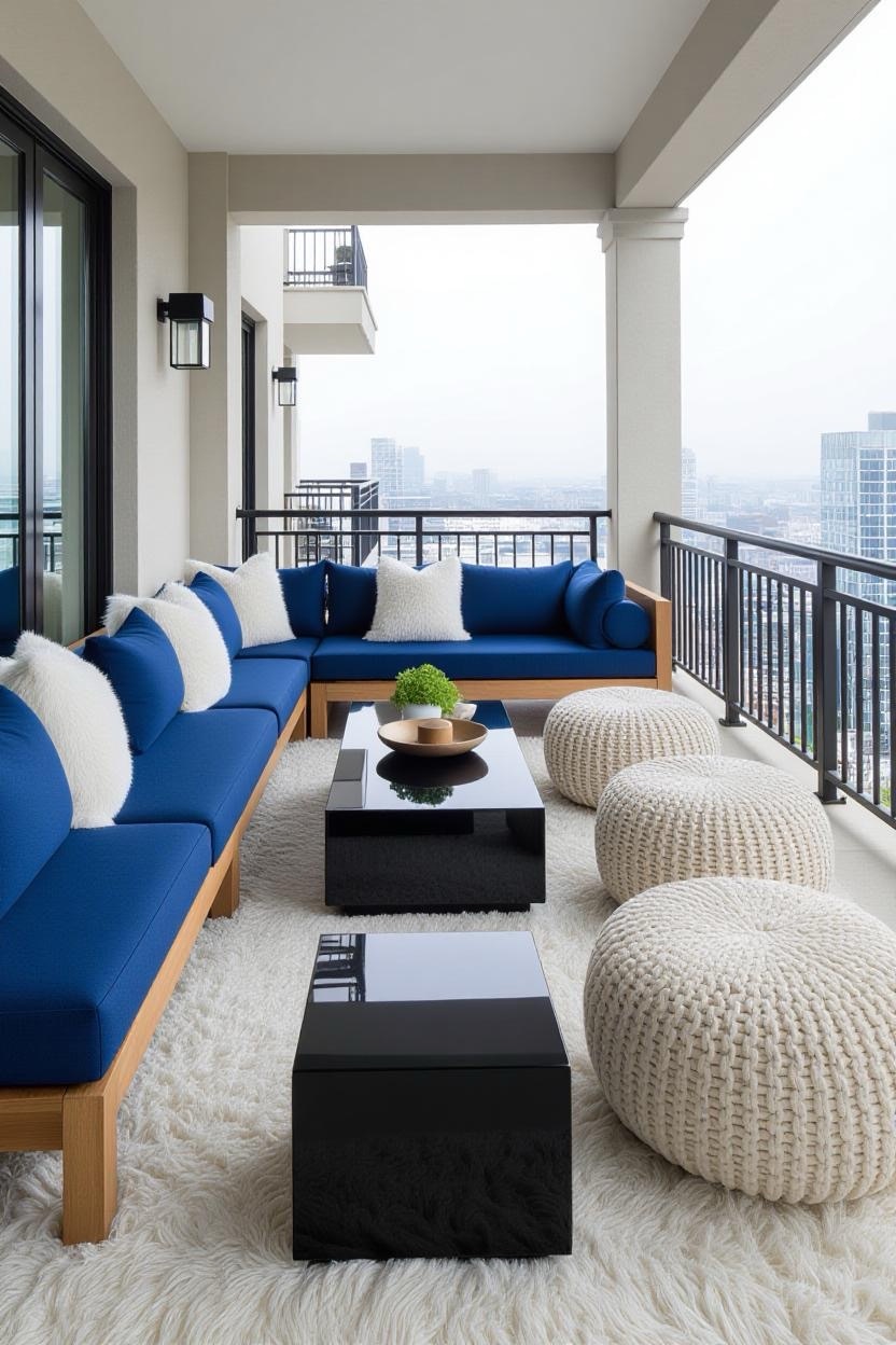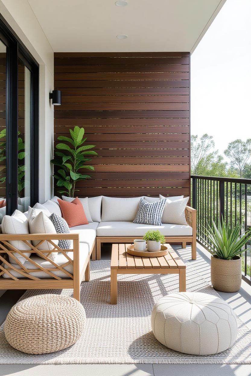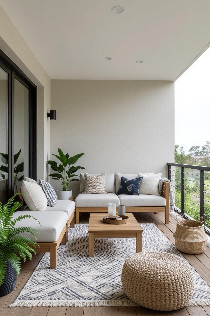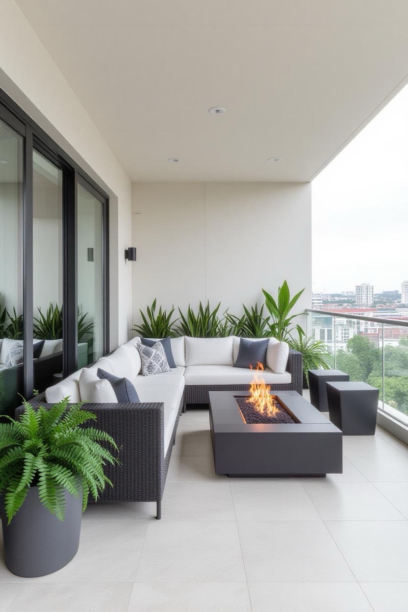 If space and budget allow, go bold with a stylish outdoor sofa, sleek side tables, and a fire pit. This design transforms your balcony into a luxurious private lounge.