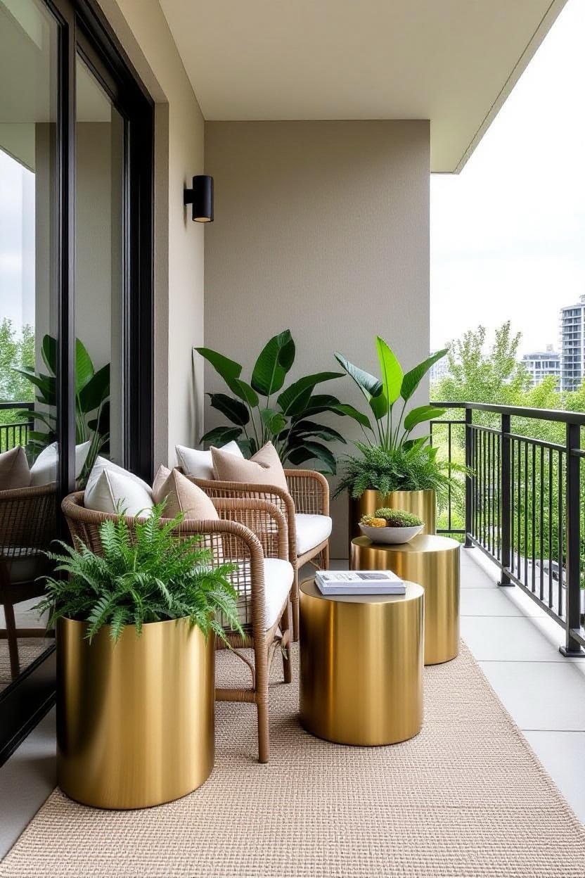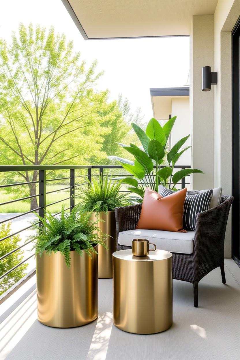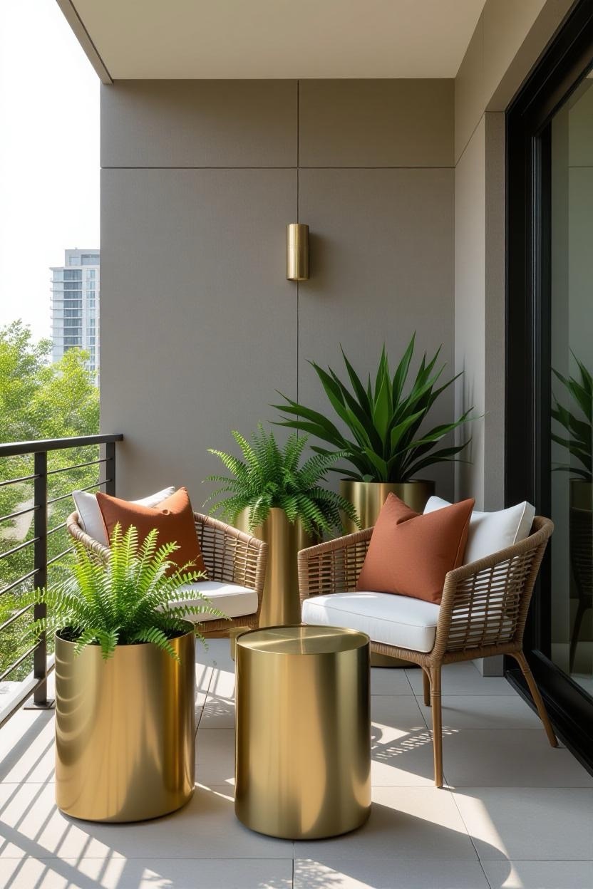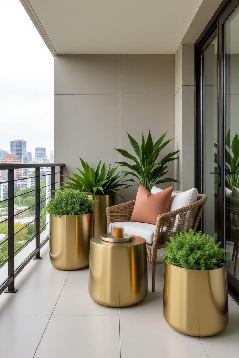 Add gold, bronze, or copper planters and side tables for a chic, modern feel. Metallics bring elegance and shine without overwhelming the space.