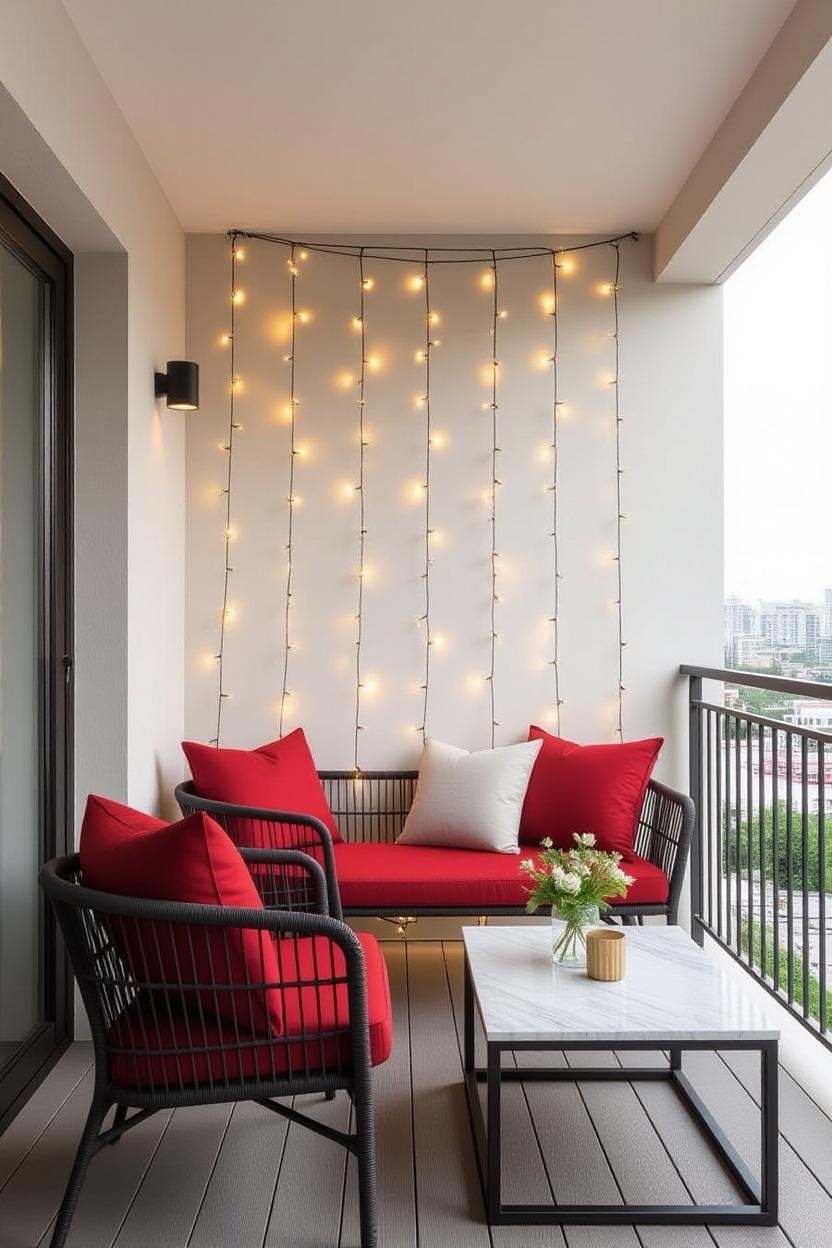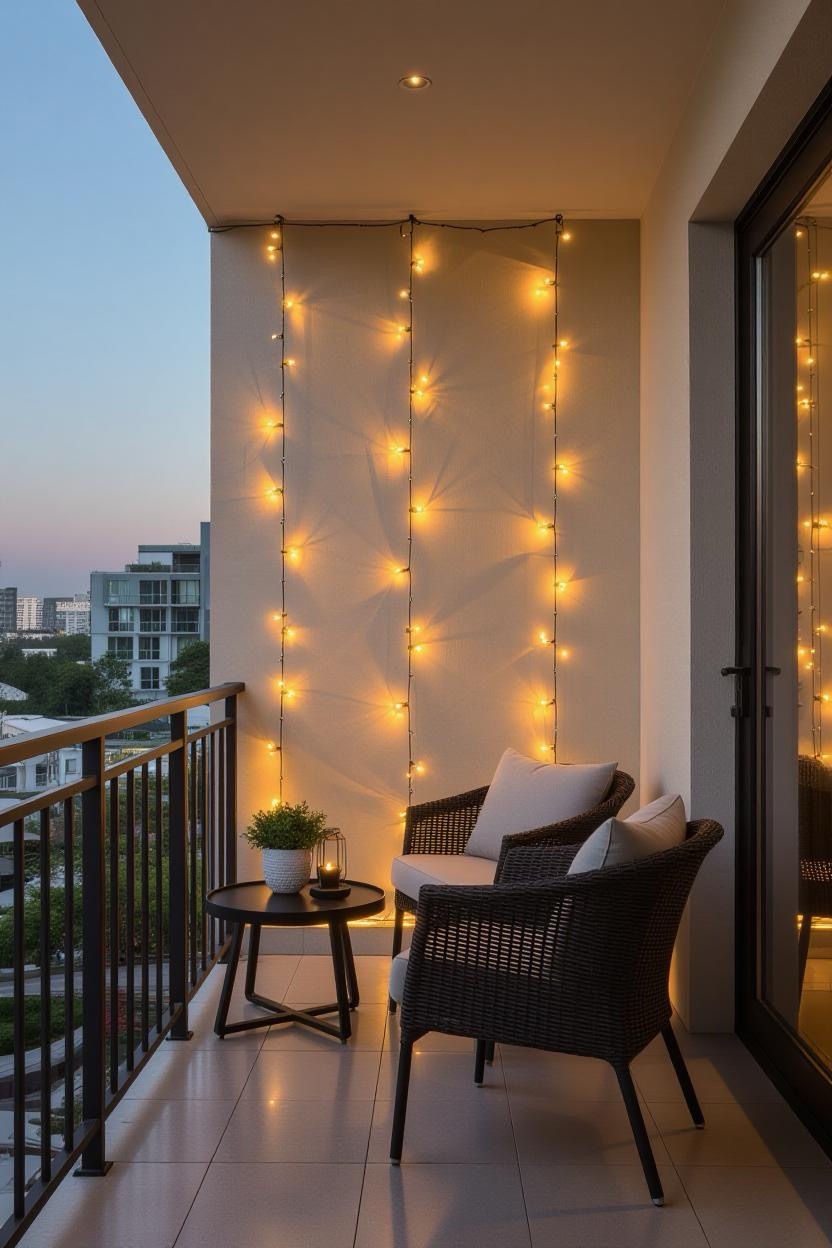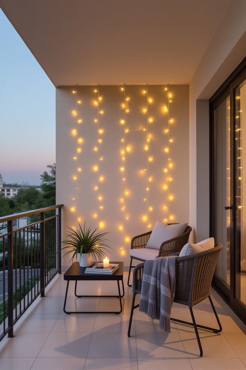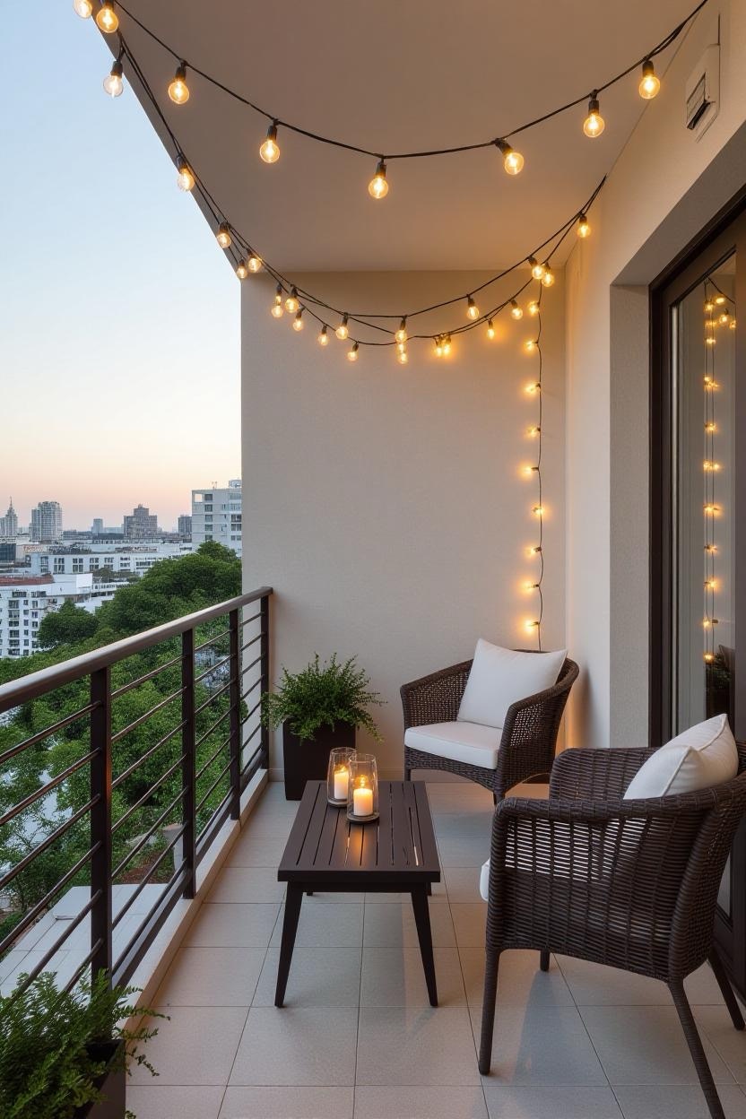 Drape string lights overhead or across the railing to add magic to your balcony. It’s a simple yet effective way to create a cozy and inviting atmosphere.