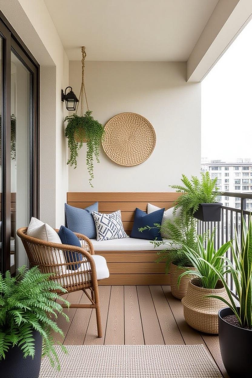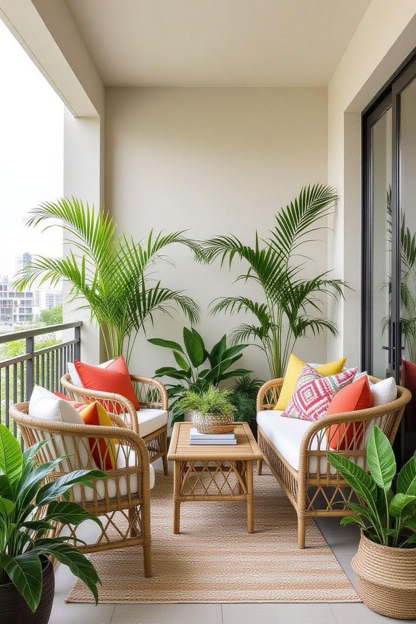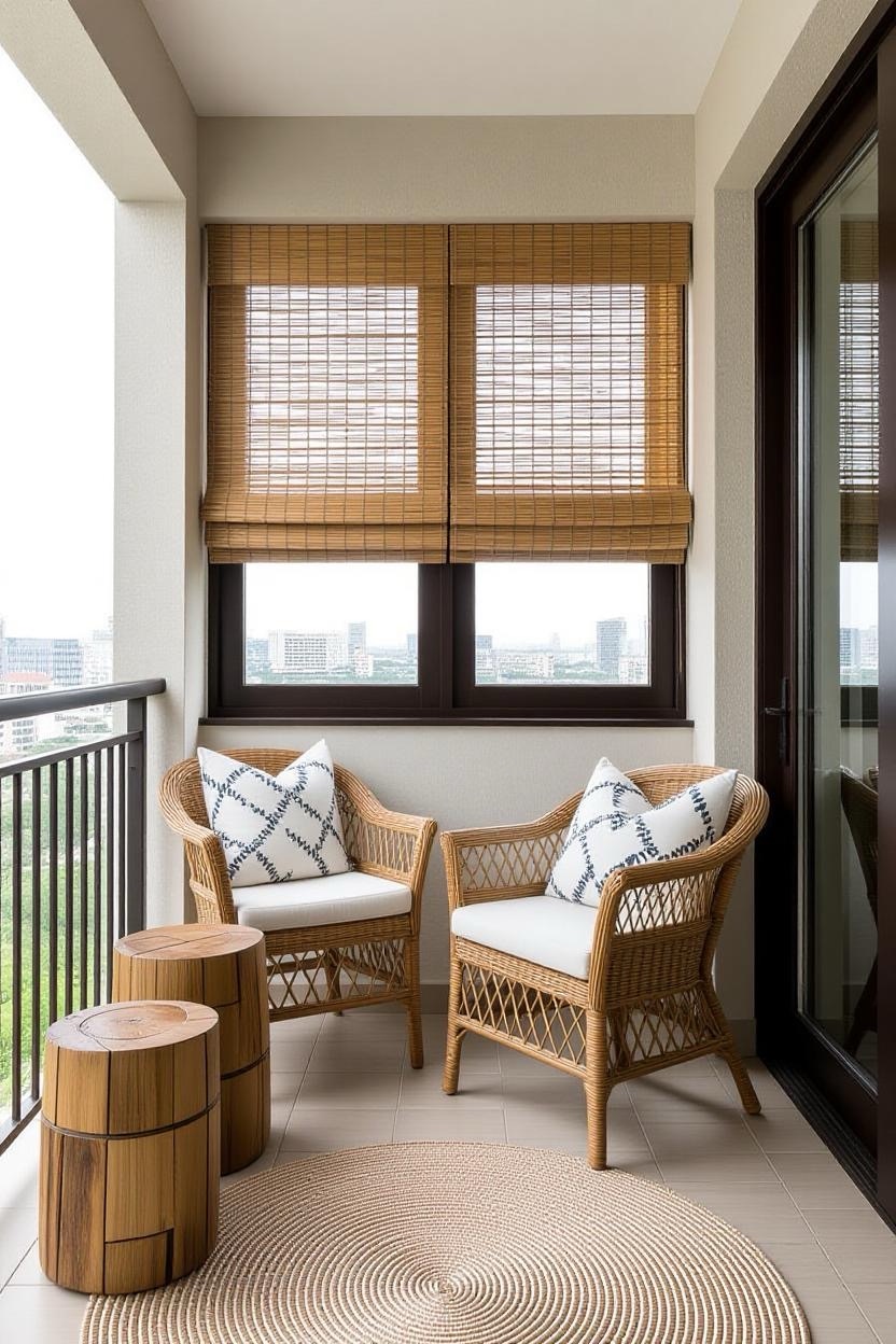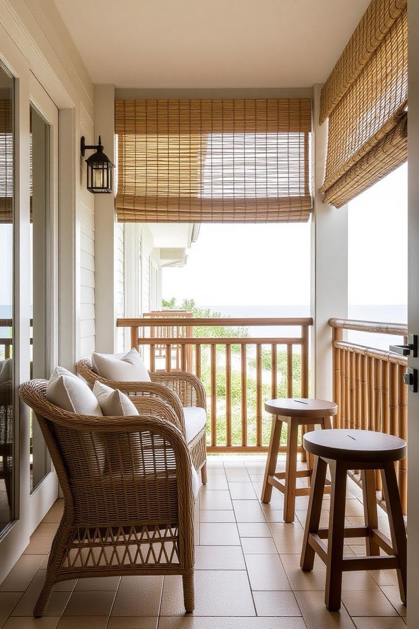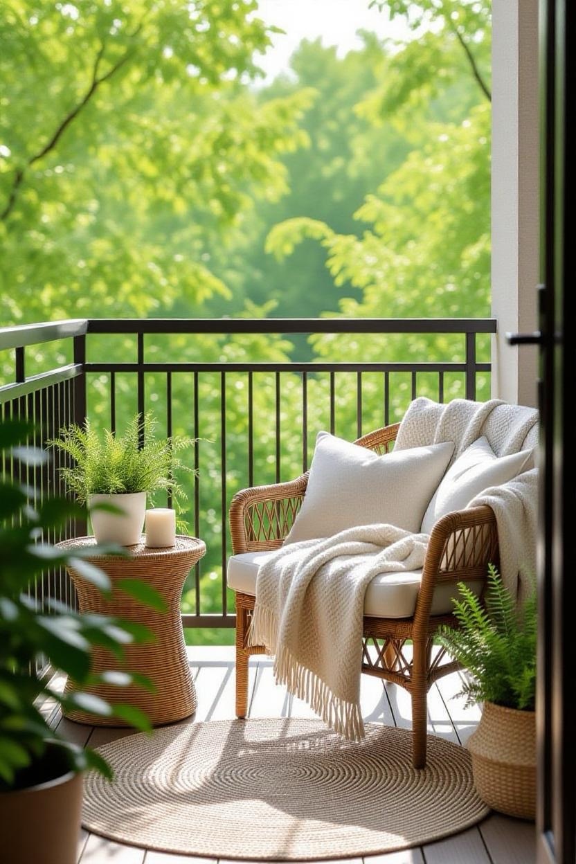 Add natural textures like wicker chairs, wooden stools, and bamboo shades to give your balcony a warm and organic feel.