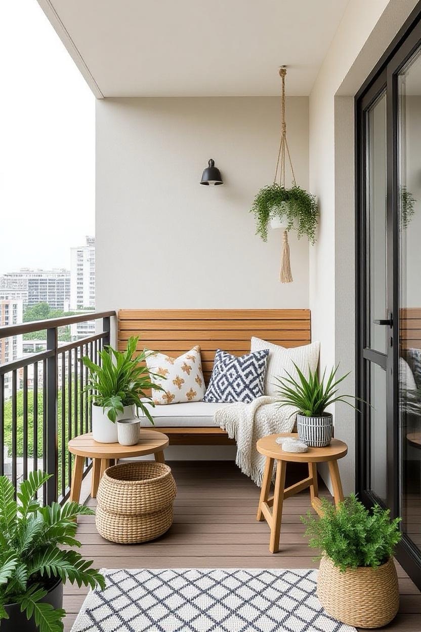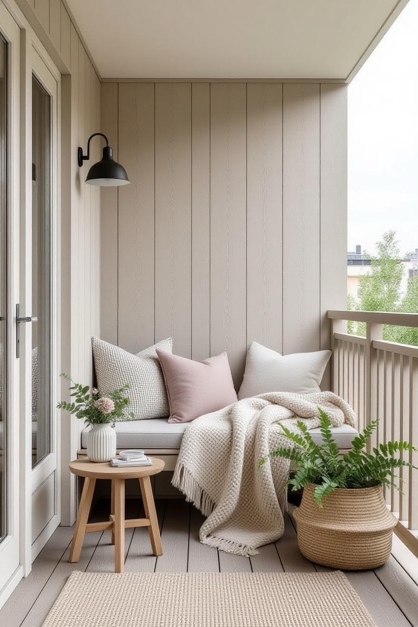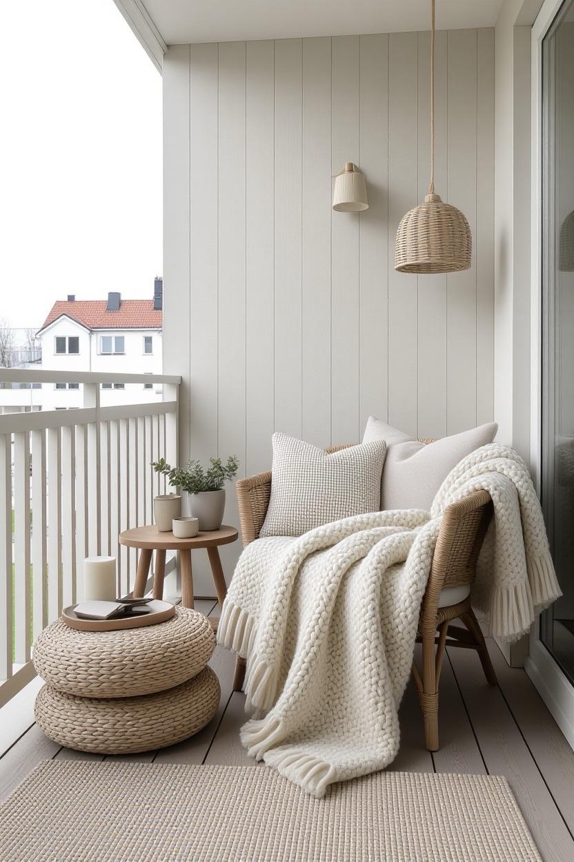 Choose pale woods, cozy throws, and muted tones to achieve a Scandinavian-inspired balcony that feels calm and inviting.